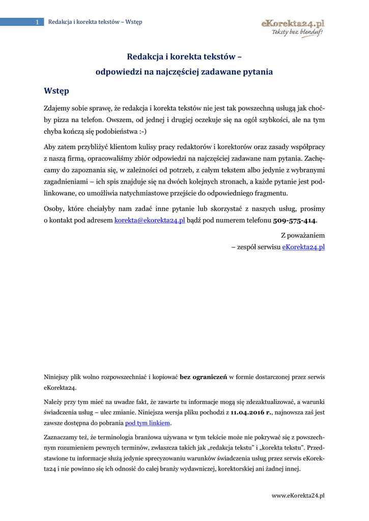 1 Redakcja i korekta tekstów – Wstęp Redakcja i korekta tekstów – odpowiedzi na najczęściej zadawane pytania Wstęp Zdajemy sobie sprawę, że redakcja i korekta tekstów nie jest tak powszechną usługą jak choćby pizza na telefon. Owszem, od jednej i drugiej oczekuje się na ogół szybkości, ale na tym chyba kończą się podobieństwa :-) Aby zatem przybliżyć klientom kulisy pracy redaktorów i korektorów oraz zasady współpracy z naszą firmą, opracowaliśmy zbiór odpowiedzi na najczęściej zadawane nam pytania. Zachęcamy do zapoznania się, w zależności od potrzeb, z całym tekstem albo jedynie z wybranymi zagadnieniami – ich spis znajduje się na dwóch kolejnych stronach, a każde pytanie jest podlinkowane, co umożliwia natychmiastowe przejście do odpowiedniego fragmentu. Osoby, które chciałyby nam zadać inne pytanie lub skorzystać z naszych usług, prosimy o kontakt pod adresem [email protected] bądź pod numerem telefonu 509-575-414. Z poważaniem – zespół serwisu eKorekta24.pl Niniejszy plik wolno rozpowszechniać i kopiować bez ograniczeń w formie dostarczonej przez serwis eKorekta24. Należy przy tym mieć na uwadze fakt, że zawarte tu informacje mogą się zdezaktualizować, a warunki świadczenia usług – ulec zmianie. Niniejsza wersja pliku pochodzi z 11.04.2016 r., najnowsza zaś jest zawsze dostępna do pobrania pod tym linkiem. Zaznaczamy też, że terminologia branżowa używana w tym tekście może nie pokrywać się z powszechnym rozumieniem pewnych terminów, zwłaszcza takich jak „redakcja tekstu” i „korekta tekstu”. Przedstawione tu informacje służą jedynie sprecyzowaniu warunków świadczenia usług przez serwis eKorekta24 i nie powinno się ich odnosić do całej branży wydawniczej, korektorskiej ani żadnej innej. www.eKorekta24.pl 2 Redakcja i korekta tekstów – Spis treści Spis treści Wstęp ...................................................................................................... 1 I. Redakcja i korekta tekstu – opis usługi................................................. 4 1. Czym jest redakcja tekstu? .................................................................................................................. 4 2. Czym jest korekta tekstu? ................................................................................................................... 4 3. Tekst wydaje mi się w miarę poprawny. Czy mogę zamówić jedynie korektę tekstu? .................... 5 4. Czy mogę ograniczyć zakres redakcji, np. tylko do poprawy interpunkcji? ..................................... 5 5. Ile trwa redakcja i korekta tekstu? ..................................................................................................... 5 6. Jakie teksty poprawiacie? ................................................................................................................... 6 7. Jak zaznaczacie poprawki? Czy będę musiał sam nanieść je w tekście? .......................................... 6 8. Czy poprawiacie też PDF-y? ................................................................................................................ 7 9. Czy poprawiacie teksty na papierze? .................................................................................................. 7 10. Mam nie najlepsze doświadczenia z korektorami. Czy od Was otrzymam tekst bez błędów, w 100% poprawny? ................................................................................................................................. 8 11. Co jest dla Was źródłem zasad poprawnościowych? Na czym się opieracie, podejmując decyzje co do tego, czy coś jest błędem, czy nie? ............................................................................................ 8 12. Obawiam się, że redaktor może za bardzo ingerować w mój styl. Czy moje obawy są słuszne? ..... 9 13. Napisałem książkę, ale żadne wydawnictwo nie chce jej wydać. Czy redakcja tekstu zwiększy szanse na publikację? .......................................................................................................................... 9 14. Czy zajmujecie się również formatowaniem tekstów (np. dostosowaniem prac dyplomowych do wytycznych uczelni)? ........................................................................................................................... 9 15. Czy oferujecie też redakcję merytoryczną? ...................................................................................... 10 II. Realizacja usługi ................................................................................ 11 16. Jak wysłać Wam tekst? ...................................................................................................................... 11 17. Czy mój tekst będzie bezpieczny? Czy nie wykorzystacie go do innych celów? .................................... 11 18. Czy wycena jest darmowa? Kiedy ją otrzymam? .............................................................................. 11 19. Czy mogę otrzymać próbkę Waszych wcześniejszych redakcji? ...................................................... 11 20. Czy możecie przygotować darmową próbkę redakcji mojego tekstu? ............................................. 11 21. Czy próbka naprawdę nic nie kosztuje? ........................................................................................... 12 22. Czy możemy podpisać umowę? ........................................................................................................ 12 III. Koszty i formy płatności .................................................................. 13 23. Ile kosztuje redakcja tekstu? ............................................................................................................. 13 24. Ile kosztuje korekta tekstu? .............................................................................................................. 13 25. Czy pobiera