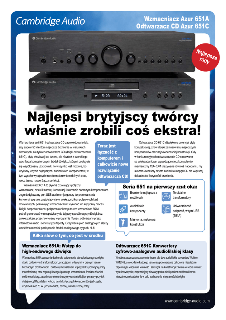 Wzmacniacz Azur 651A Odtwarzacz CD Azur 651C Najl ep rady sze Najlepsi brytyjscy twórcy właśnie zrobili coś ekstra! Wzmacniacz serii 651 i odtwarzacz CD zaprojektowano tak, Teraz jest aby zapewnić klientom najlepsze brzmienie w warunkach domowych, nie tylko z odtwarzacza CD (dzięki odtwarzaczowi łączność z 651C), płyty winylowej lub tunera, ale również z szerokiego komputerem i wachlarza komputerowych źródeł dźwięku, którymi posługuje całkowicie nowe się współczesny użytkownik. To wszystko jest możliwe, bo rozwiązanie użyliśmy jedynie najlepszych, audiofilskich komponentów, w tym wysoko wydajnych transformatorów toroidalnych oraz, odtwarzacza CD! rzecz jasna, naszej żądzy perfekcji. Wzmacniacz 651A to płynnie działający i potężny wzmacniacz, dzięki klasowej konstrukcji i starannie dobranym komponentom. Jego dedykowany port USB audio omija gorszy tor przetwarzania i konwersji sygnału, znajdujący się w większości komputerowych kart dźwiękowych, pozwalając wzmacniaczowi wykonać ten krytyczny proces. Dzięki bezpośredniemu połączeniu z komputerem wzmacniacz 651A potrafi generować w niespotykany do tej pory sposób czysty dźwięk bez zniekształceń, przechowywany w programie iTunes, odtwarzany przez internetowe radio i serwisy typu Spotify. Oczywiście pięć analogowych złączy umożliwia również podłączanie źródeł analogowego sygnału Hi-fi. Odtwarzacz CD 651C dźwiękowy potencjał płyty kompaktowej, znów dzięki zastosowaniu najlepszych komponentów oraz najnowocześniej konstrukcji. Gdy w konkurencyjnych odtwarzaczach CD stosowane są wielozadaniowe, wywodzące się z komputerów mechanizmy CD-ROM (nazywane również napędami), my skonstruowaliśmy czysto audiofilski napęd CD dla większej dokładności i czystości brzmienia. Seria 651 na pierwszy rzut oka: Brzmienie najlepsze z możliwych Toroidalne transformatory Audiofilskie komponenty Uniwersalność połączeń, w tym USB (651A) Masywna, metalowa konstrukcja Kilka słów o tym, co jest w środku Wzmacniacz 651A: Wstęp do high-endowego dźwięku Odtwarzacz 651C Konwertery cyfrowo-analogowe audiofilskiej klasy Wzmacniacz 651A zapewnia doskonałe odtwarzanie stereofonicznego dźwięku, dzięki oddzielnym transformatorom, pracującym w lewym i w prawym kanale, bliźniaczym prostownikom i oddzielnym zasilaniem w przypadku podwójnej pracy monofonicznej oraz regulacji lewego i prawego wzmacniacza. Posiada również solidne radiatory; zasadniczy element utrzymywania niskiej temperatury przy tak dużej mocy! Rezultatem wyboru takich krytycznych komponentów jest czysta, użytkowa moc 75 W (przy 8 omach) płynnej, niewzruszonej pracy. W odtwarzaczu zastosowano nie jeden, ale dwa audiofilskie konwertery Wolfson WM8742, a więc dane każdego kanału są przetwarzane całkowicie niezależnie, zapewniając wspaniałą wierność i szczegół. Ta konstrukcja zawiera w sobie również wyrafinowany filtr, zapewniający niewiarygodnie niski poziom zakłóceń i ledwo mierzalne zniekształcenia w celu zachowania integralności dźwięku. www.cambridge-audio.com Wzmacniacz Azur 651A Bezkompromisowe zasilanie To część naszego DNA! Sercem każdego wspaniałego wzmacniacza jest jego źródło zasilania. W urządzeniach serii 651 jako standard zastosowano najwyższej jakości transformatory toroidalne o małej gęstości strumienia z silikonowym ekranowaniem. Wybrano je w celu zapewnienia niskiego poziomu zakłóceń, mniejszych zniekształceń i niewiarygodnie cichej pracy bez jakiegokolwiek brzęczenia lub przydźwięku, typowych dla szeroko stosowanych, tańszych transformatorów elektroindukcyjnych. Szczególnie w przypadku wzmacniacza 651A zapewnia to doskonale wyrównany przebieg wyjściowy, bez obcinania sygnału i dużej mocy, wolnej od zniekształceń. Umożliwia to natychmiastowe reagowanie na wszelkie zmiany dźwięku, dynamikę, odtwarzanie basów oraz synchronizację, co przyczynia się ogromnie do ogólnej jakości dźwięku. Przewodnik zastosowań wzmacniacza 651A i odtwarzacza 651C Seria 651 jest niewiarygodnie uniwersalna... Domowe systemy stereofoniczne: Seria 651 jest wystarczająco mocna, aby sprawdzić się w domowy systemie stereofonicznym, a dzięki złączu USB, idealna dla osób, korzystających z transmisji strumieniowej z komputera klasy PC lub Mac lub używających komputerowego programu iTunes jako źródła słuchanej muzyki. A ponieważ nie dodajemy niepotrzebnych gadżetów, obydwa urządzenia są proste w obsłudze dla całej rodziny, dzięki intuicyjnym panelom przednim. Biura i sale konferencyjne: Wysoko wydajny toroidalny transformator zapewnia duże wzmocnienie bez zniekształceń, więc idealnie nadaje się do nagłaśniania sal konferencyjnych, miejsc spotkań, pokojów recepcyjnych i sal wykładowych. Bary i restauracje: Bliźniacze wyjścia głośnikowe oznaczają, że wzmacniacz 651A to doskonałe urządzenie do komercyjnych zadań, a połączenie dwóch takich wzmacniaczy pozwoli stereować większą ilością głośników i większą przestrzenią. Wzmacniacz może obsługiwać nawet cztery pary głośników i wiele pomieszczeń, dlatego idealnie nadaje się do barów i restauracji. Jest niewiarygodnie łatwy w obsłudze, a odtwarzanie cyfrowego dźwięku z laptopów lub odtwarzaczy MP3 może być szybko uruchomione przez pracowników lub klientów za pomocą złącza USB lub wejścia liniowego. Szkoły i uniwersytety: Dziesiątki tysięcy szkolnych klas w całej Anglii wyposażono we wzmacniacze Cambridge Audio, wybranych szczególnie z powodu prostoty obsługi, łatwości nagłaśniania pomieszczeń i wielkiej niezawodności. Najlepsze komponenty Precyzyjna regulacja poziomu głośności zapewnia doskonałe zrównoważenie kanałów przy niskich poziomach głośności i jest dopełniana super dokładnymi regulatorami barwy dźwięku, oferującymi liniową regulację poziomu. Innymi ważnymi elementami konstrukcyjnymi są nowe, audiofilskie,