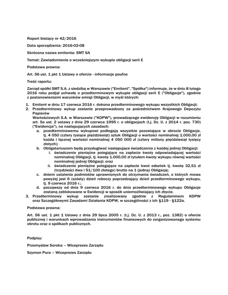 2016 roku podjął uchwałę o przedterminowym wykupie obligacji serii E ("Obligacje"), zgodnie