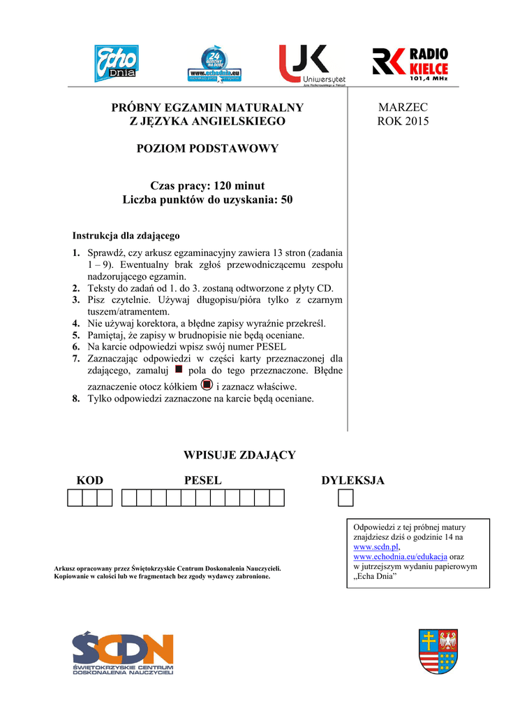 PRÓBNY EGZAMIN MATURALNY Z JĘZYKA ANGIELSKIEGO MARZEC ROK 2015 POZIOM PODSTAWOWY Czas pracy: 120 minut Liczba punktów do uzyskania: 50 Instrukcja dla zdającego 1. Sprawdź, czy arkusz egzaminacyjny zawiera 13 stron (zadania 1 – 9). Ewentualny brak zgłoś przewodniczącemu zespołu nadzorującego egzamin. 2. Teksty do zadań od 1. do 3. zostaną odtworzone z płyty CD. 3. Pisz czytelnie. Używaj długopisu/pióra tylko z czarnym tuszem/atramentem. 4. Nie używaj korektora, a błędne zapisy wyraźnie przekreśl. 5. Pamiętaj, że zapisy w brudnopisie nie będą oceniane. 6. Na karcie odpowiedzi wpisz swój numer PESEL 7. Zaznaczając odpowiedzi w części karty przeznaczonej dla zdającego, zamaluj pola do tego przeznaczone. Błędne zaznaczenie otocz kółkiem i zaznacz właściwe. 8. Tylko odpowiedzi zaznaczone na karcie będą oceniane. WPISUJE ZDAJĄCY KOD PESEL Arkusz opracowany przez Świętokrzyskie Centrum Doskonalenia Nauczycieli. Kopiowanie w całości lub we fragmentach bez zgody wydawcy zabronione. DYLEKSJA Odpowiedzi z tej próbnej matury znajdziesz dziś o godzinie 14 na www.scdn.pl, www.echodnia.eu/edukacja oraz w jutrzejszym wydaniu papierowym „Echa Dnia” Próbny egzamin maturalny z języka angielskiego - poziom podstawowy ROZUMIENIE ZE SŁUCHU Zadanie 1. (5 pkt) Usłyszysz dwukrotnie rozmowę agenta biura podróży z klientką na temat wakacji. Zdecyduj, które zdania są zgodne z treścią komunikatu (T), a które nie (F). Zaznacz znakiem X odpowiednią rubrykę w tabeli. Za każde poprawne rozwiązanie otrzymasz 1 punkt. T 1.1. F At the beginning of the conversation the travel agent played a joke on the customer. 1.2. The customer does not want to go on a package holidays. 1.3. The woman has experienced sandstorms before. A stampede of camels is a situation in which camels start to run fast in an uncontrolled way because they are frightened. The total cost of the holidays in the middle of the Sahara Desert would 1.5. be £ 2500. 1.4. PRZENIEŚ ROZWIĄZANIA NA KARTĘ ODPOWIEDZI! Zadanie 2. (4 pkt) Usłyszysz dwukrotnie wypowiedzi czterech osób na temat ich cech charakteru. Do każdej osoby (2.1.–2.4.) dopasuj zdanie podsumowujące jej wypowiedź (A–E). Wpisz odpowiednie litery do tabeli. Za każde poprawne rozwiązanie otrzymasz 1 punkt. Uwaga: jedno zdanie zostało podane dodatkowo i nie pasuje do żadnej wypowiedzi. This speaker A. is unpopular although he/she has got a lot of virtues. B. boasts of his/her future life and is generous and hard-working. C. is sociable, sensitive, open-minded and he/she is not pessimistic. 2.1. 2.2. D. is obedient, sociable and friendly but appears to be annoying. 2.3. E. is sociable, generous, impulsive but he/she is not hard-working. 2.4. PRZENIEŚ ROZWIĄZANIA NA KARTĘ ODPOWIEDZI! 2 Próbny egzamin maturalny z języka angielskiego - poziom podstawowy Zadanie 3. (6 pkt) Usłyszysz dwukrotnie artykuł dotyczący badań związanych z problemami spowodowanymi przez noszenie słuchawek w czasie wykonywania innych czynności. Z podanych odpowiedzi wybierz właściwą, zgodną z treścią tekstu. Zakreśl literę A, B lub C. Za każde poprawne rozwiązanie otrzymasz 1 punkt. 3.1. According to the study, the number of people suffering serious injury or death while wearing headphones for MP3 players A. has increased two times in six years. B. has increased three times in six years. C. has increased four times in six years. 3.2. The victims were mostly A. female and less than 30 years old. B. male and less than 18 years old. C. male and less than 30 years old. 3.3. The main problem is that pedestrians with headphones can’t hear A. warnings. B. other pedestrians. C. moving cars. 3.4. The problem of “iPod oblivion” has been found in a number of A. streets. B. countries. C. studies. 3.5. Kevin Clinton advised pedestrians with headphones to A. pay attention to traffic around them. B. remain calm when they are in danger. C. ensure that they are not aware of what is happening around them. 3.6. The original title of this article is: A. “Headphones contribute to serious injuries”. B. “Headphones are a danger to life”. C. “Wearing headphones – the main cause of brain cancer”. PRZENIEŚ ROZWIĄZANIA NA KARTĘ ODPOWIEDZI! 3 Próbny egzamin maturalny z języka angielskiego - poziom podstawowy ROZUMIENIE TEKSTÓW PISANYCH Zadanie 4. (6 pkt) Przeczytaj tekst. Na podstawie informacji w nim zawartych zdecyduj, które zdania (4.1 –4.6) są zgodne z treścią tekstu (T), a które nie (F). Zaznacz znakiem X odpowiednią rubrykę w tabeli. Za każde poprawne rozwiązanie otrzymasz 1 punkt. At a market in central Tokyo, a bluefin tuna the size of five men and weighing 342 kg was sold recently for $390,000 – a sign that the Japanese have not lost their appetite for this endangered species. The attraction of bluefin tuna is still too big for many to resist, despite dangerously low global stocks. Six hundred thousand tonnes of the fish are eaten in Japan every year – mainly raw as sushi or sashimi. Sushi made from top bluefin tuna is sometimes sold for as much as $25 a piece at exclusive Tokyo restaurants. Japan consumes about 80% of all Pacific and Atlantic bluefin tuna. The country has been accused of trying to stop both global cuts to fishing quotas and complete bans on the fishing of this rare fish. The World Wildlife Fund has warned that if current fishing continues, the Atlantic bluefin tuna will be “functionally” extinct in three years. But this did not appear to be a worry at the Tsukiji market in Tokyo. Market officials often see prices rise during the year’s opening auction at Tsukiji, the world’s biggest fish market. But the new record price for a single fish was still unexpected. Traders at the market say growing Chinese demand for sushi is helping to push up prices. The 342kg fish, one of more than 500 tuna shipped in from around the world for the first auction of the year, was divided between two sushi re