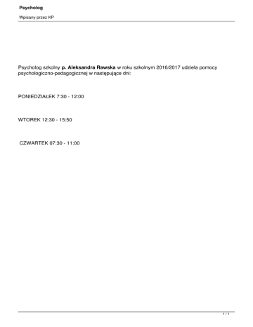 Psycholog Wpisany przez KP Psycholog szkolny p. Aleksandra Rawska w roku szkolnym 2016/2017 udziela pomocy psychologiczno-pedagogicznej w następujące dni: PONIEDZIAŁEK 7:30 - 12:00 WTOREK 12:30 - 15:50 CZWARTEK 07:30 - 11:00 1/1