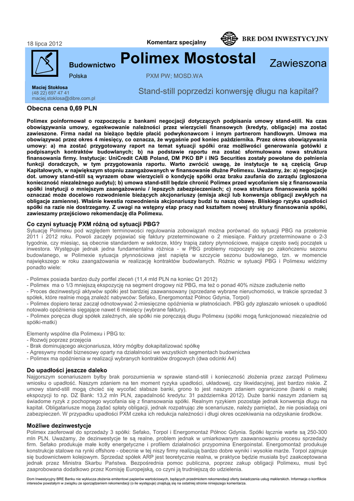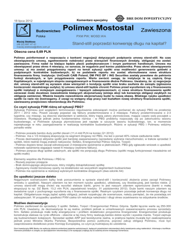 Komentarz specjalny BRE Bank Securities BRE Bank Securities Komentarz specjalny 18 lipca 2012 Budownictwo Polska Maciej Stokłosa (48 22) 697 47 41 [email protected] Polimex Mostostal Zawieszona PXM PW; MOSD.WA Stand-still poprzedzi konwersję długu na kapitał? Obecna cena 0,69 PLN Polimex poinformował o rozpoczęciu z bankami negocjacji dotyczących podpisania umowy stand-still. Na czas obowiązywania umowy, egzekwowanie naleŜności przez wierzycieli finansowych (kredyty, obligacje) ma zostać zawieszone. Firma nadal na bieŜąco będzie płacić podwykonawcom i innym partnerom handlowym. Umowa ma obowiązywać przez okres 4 miesięcy, co oznacza, Ŝe wygaśnie pod koniec października. Przez okres obowiązywania umowy: a) ma zostać przygotowany raport na temat sytuacji spółki oraz moŜliwości generowania gotówki z podpisanych kontraktów budowlanych; b) na podstawie raportu ma zostać sformułowana nowa struktura finansowania firmy. Instytucje: UniCredit CAIB Poland, DM PKO BP i ING Securities zostały powołane do pełnienia funkcji doradczych, w tym przygotowania raportu. Warto zwrócić uwagę, Ŝe instytucje te są częścią Grup Kapitałowych, w największym stopniu zaangaŜowanych w finansowanie dłuŜne Polimexu. UwaŜamy, Ŝe: a) negocjacje dot. umowy stand-still są wyrazem obaw wierzycieli o kondycję spółki oraz braku zaufania do zarządu (zgłoszona konieczność niezaleŜnego audytu); b) umowa stand-still będzie chronić Polimex przed wycofaniem się z finansowania spółki instytucji o mniejszym zaangaŜowaniu / lepszych zabezpieczeniach; c) nowa struktura finansowania spółki oznaczać moŜe docelowo rozwodnienie bieŜących akcjonariuszy (emisja akcji lub konwersja obligacji zwykłych na obligacje zamienne). Właśnie kwestia rozwodnienia akcjonariuszy budzi tu naszą obawę. Bliskiego ryzyka upadłości spółki na razie nie dostrzegamy. Z uwagi na wstępny etap pracy nad kształtem nowej struktury finansowania spółki, zawieszamy przejściowo rekomendację dla Polimexu. Co czyni sytuację PXM róŜną od sytuacji PBG? Sytuację Polimexu pod względem terminowości regulowania zobowiązań moŜna porównać do sytuacji PBG na przełomie 2011 i 2012 roku. Powoli zaczęły pojawiać się faktury przeterminowane o 2 miesiące. Faktury przeterminowane o 2-3 tygodnie, czy miesiąc, są obecnie standardem w sektorze, który trapią zatory płynnościowe, mające często swój początek u inwestora. Występuje jednak jedna fundamentalna róŜnica - w PBG problemy rozpoczęły się po zakończeniu sezonu budowlanego, w Polimexie sytuacja płynnościowa jest napięta w szczycie sezonu budowlanego, tzn. w momencie największego w roku zaangaŜowania w realizację kontraktów budowlanych. RóŜnic w sytuacji PBG i Polimexu widzimy ponadto wiele: - Polimex posiada bardzo duŜy portfel zleceń (11,4 mld PLN na koniec Q1 2012) - Polimex ma o 1/3 mniejszą ekspozycję na segment drogowy niŜ PBG, ma teŜ o ponad 40% niŜsze zadłuŜenie netto - Proces dezinwestycji aktywów spółki jest bardziej zaawansowany (sprzedane wybrane nieruchomości, w trakcie sprzedaŜ 3 spółek, które realnie mogą znaleźć nabywców: Sefako, EnergomontaŜ Północ Gdynia, Torpol) - Polimex dopiero teraz zaczął odnotowywać 2-miesięczne opóźnienia w płatnościach. PBG gdy zgłaszało wniosek o upadłość notowało opóźnienia sięgające nawet 6 miesięcy (wybrane faktury). - Polimex poręcza długi spółek zaleŜnych, ale spółki nie poręczają długu Polimexu (spółki mogą funkcjonować niezaleŜnie od spółki-matki) Elementy wspólne dla Polimexu i PBG to: - Rozwój poprzez przejęcia - Brak dominującego akcjonariusza, który mógłby dokapitalizować spółkę - Agresywny model biznesowy oparty na działalności we wszystkich segmentach budownictwa - Polimex ma opóźnienia w realizacji wybranych kontraktów drogowych (dwa odcinki A4) Do upadłości jeszcze daleko Najgorszym scenariuszem byłby brak porozumienia w sprawie stand-still i konieczność złoŜenia przez zarząd Polimexu wniosku o upadłość. Naszym zdaniem na ten moment ryzyka upadłości, układowej, czy likwidacyjnej, jest bardzo niskie. Z umowy stand-still mogą chcieć się wycofać słabsze banki, grono to jest naszym zdaniem ograniczone (banki o małej ekspozycji to np. DZ Bank: 13,2 mln PLN, zapadalność kredytu: 31 października 2012). DuŜe banki naszym zdaniem są świadome ryzyk z pochopnego wycofania się z finansowania spółki. Realnym ryzykiem pozostaje jednak konwersja długu na kapitał. Obligatariusze mogą Ŝądać spłaty obligacji, jednak rozpatrując złe scenariusze, naleŜy pamiętać, Ŝe nie posiadają oni zabezpieczeń. W przypadku upadłości PXM czeka ich redukcja naleŜności i długi okres oczekiwania na odzyskanie środków. MoŜliwe dezinwestycje Polimex zaoferował do sprzedaŜy 3 spółki: Sefako, Torpol i EnergomontaŜ Północ Gdynia. Spółki łącznie warte są 250-300 mln PLN. UwaŜamy, Ŝe dezinwestycje te są realne, problem jednak w umiarkowanym zaawansowaniu procesu sprzedaŜy firm. Sefako produkuje małe kotły energetyczne i profilem działalności przypomina Energoinstal. EnergomontaŜ produkuje konstrukcje stalowe na rynki offshore - obecnie w tej niszy firmy realizują bardzo dobre wyniki i wysokie marŜe. Torpol zajmuje się budownictwem kolejowym. SprzedaŜ spółek ARP jest teoretycznie realna, w praktyce będzie musiała być zaakceptowana jednak przez Ministra Skarbu Państwa. Bezpośrednia pomoc publiczna, poprzez zakup obligacji Polimexu, musi być zaaprobowana dodatkowo przez Komisję Europejską, co czyni ją trudniejszą do udzielenia. Dom Inwestycyjny 18 lipca 2012 BRE Banku nie wyklucza złoŜenia emitentowi papierów wartościowych, będących przedmiotem rekomendacji oferty świadczenia usług maklerskich. Informacje o konflikcie interesów powstałym w związku ze sporządzeniem rekomendacji (o ile występuje) znajdują się na ostatniej str
