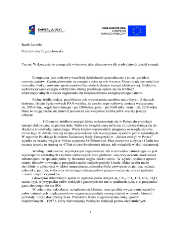 Jacek Latocha Politechnika Częstochowska Temat: Wykorzystanie energetyki wiatrowej jako alternatywa dla tradycyjnych źródeł energii. Energetyka jest podstawą wszelkiej działalności gospodarczej a co za tym idzie rozwoju państw. Zapotrzebowanie na energie z roku na rok wzrasta. Obecnie nie jest możliwe normalne funkcjonowanie społeczeństwa bez stałych dostaw energii elektrycznej. Globalnie wykorzystywana energia elektryczna, której produkcja opiera się na źródłach konwencjonalnych stwarza zagrożenie dla bezpieczeństwa energetycznego państw. Różne źródła podają przybliżony rok wyczerpania zasobów naturalnych. Z danych Instytutu Badań Systemowych PAN wynika, że zasoby ropy naftowej zostaną wyczerpane ok. 2050roku, węgla kamiennego - po 2200roku, gazu – po 2060 roku, uran – ok. 2200 roku. Dane te mogą trochę się zmienić ponieważ nie wszystkie źródła paliw zostały jeszcze odkryte. Głównymi źródłami energii, które wykorzystuje się w Polsce do produkcji energii elektrycznej są paliwa stałe. Paliwa te (węgiel, ropa naftowa itd.) przyczyniają się do skażenia środowiska naturalnego. Wiele krajów wprowadziło programy oszczędnościowe, mimo tego w chwili obecnej można przewidzieć rok wyczerpania zasobów paliw naturalnych. W raporcie Polskiego Komitetu Światowej Rady Energetyki pt. „Sektor energii w Polsce” wynika że zasoby węgla w Polsce wynoszą 54700mln ton. Przy poziomie zużycia 117mln ton rocznie zasoby te starczą na 470lat co jest dwukrotnie niższe, niż wskaźnik w skali światowej. Według naukowców największym zagrożeniem dla środowiska naturalnego nie jest wyczerpanie naturalnych zasobów paliwowych, lecz globalne zanieczyszczenie środowiska substancjami ze spalania paliw tj. tlenkami węgla, siarki i azotu. W wyniku spalania oprócz ciepła, tlenków powstają w przypadku paliw stałych popioły i żużle. Skład spalin może się różnic w zależności w jakiej temperaturze, stosunku ilości powietrza do paliwa, rodzaju paleniska, palnika, kotła oraz od samego rodzaju paliwa przeprowadza się proces spalania i wielu innych czynników. Głównymi składnikami spalin ze spalania paliw stałych są: CO2, SO2, CO, NOx, H2O, sadza i pył. w przypadku paliw ciekłych i gazowych nie ma w spalinach pyłu, a w przypadku gazu ziemnego nie ma SO2. W celu przeciwdziałania ociepleniu się klimatu oraz groźbie wyczerpania zapasów paliw naturalnych międzynarodowe organizacje podjęły szereg działań w wyniku których powstały liczne dokumenty m.in. Protokół z Kioto o ograniczeniu emisji gazów cieplarnianych – 1997 r. który zobowiązuje Polskę do redukcji gazów cieplarnianych . 1 Jedną z głównych dróg zmierzających w przeciwdziałania negatywnym zjawiskom towarzyszącym zużyciu surowców jest zwiększanie w bilansie paliwowo-energetycznym udziału źródeł odnawialnych. Przewiduje się, że w przeciągu kilkudziesięciu lat połowa energii będzie pochodzić ze źródeł odnawialnych. Wiatr jest jednym z odnawialnych źródeł energii. Powstaje on z wyniku nierównomiernego ogrzewania się mas powietrza. Różnica temperatur powoduje nierównomierny rozkład ciśnienia atmosferycznego a naturalna tendencja do wyrównywania ciśnienia powoduje ruch nazwany wiatrem. Wiatr można wykorzystać do produkcji energii elektrycznej kiedy jego prędkość jest w granicach od 4 do 25m/s. Równie ważna co do prędkości wiatru jest jego regularność występowania w jednym miejscu, albowiem od tego zależy ilość wyprodukowanej energii elektrycznej w ciągu roku. A co za tym idzie opłacalność ekonomiczna poczynionej inwestycji. Energia wiatrowa ma znaczny potencjał do wykorzystania. Szacuje się że z technicznego punktu widzenia światowe zasoby energii wiatrowej nadające się do wykorzystania to 53000 TW•h/rok czyli ilość trzykrotnie wyższa od światowego zużycia energii. Obecnie przewiduje się że energia wiatrowa do 2020 roku ma stanowić udział 12 % w światowej produkcji energii elektrycznej. Na świecie największymi producentami energii elektrycznej z wiatru są Stany Zjednoczone, Niemcy, Chiny i Dania. Ponadto Dania jest największym producentem turbin wiatrowych, ponadto do 2030 roku planuje się tam zwiększyć udział udział energii wiatrowej w ogólnym bilansie energii elektrycznej do 50%. W obecnej chwili istnieje duża różnorodność w rozwiązaniach technicznych siłowni wiatrowych. Oprócz małych elektrowni wiatrowych o mocy od kilku kW istnieją też siłownie o mocy 1,67MW(dane z 2008r.). Obecnie górna granica mocy pojedynczej turbiny wynosi 5-6MW dla turbin zwykle instalowanych na pasach wód przybrzeżnych i nadmorskich brzegach. Jednak obecna tendencja w produkcji siłowni zmierza do instalowania jednostek o możliwie jak największej mocy lub skupiania większej ilości siłowni o mniejszej mocy jednostkowej na morzu lub zwartym terenie (tzw. farmy wiatrowe). Przykładem tutaj może być farma wiatrowa w Zatoce Pomorskiej która składa się z 200 turbin zakotwiczonych na dnie, o łącznej mocy 1000MW. Zależności opisujące energie wiatru. Energie kinetyczna wiatru opisuje zależność (2, 3): E kw = mv 2 [J] 2 (1) gdzie: v - prędkość wiatru [m/s], m – masa powietrza przenoszona prze wiatr [kg] Jeżeli uwzględnimy, że: V * = Avt (2) M = ρV * (3) 2 gdzie: V* - objętość przenoszonej prze wiatr masy powietrza [m3], A – powierzchnia wirnika [m2], t – czas przepływu powietrza [s], przez prostopadle ustawioną do kierunku wiatru pow. A. Z powyższych założeń otrzymamy: E kw = 1 ρAv 3t 2 (4) Moc turbiny odpowiadająca energii zależy od prędkości wiatru która jest funkcją wysokości h [m], opisanej zależnością (8): Ekw1 h13a = Wkw2 h23a (5) gdzie: a – współczynnik szorstkości terenu, prędkości wiatru, czasu uśredniania wiatru oraz warunków atmosferycznych. Prędkość wiatru przy powierzchni Ziemi jest równa zeru z uwagi na siły tarcia, na