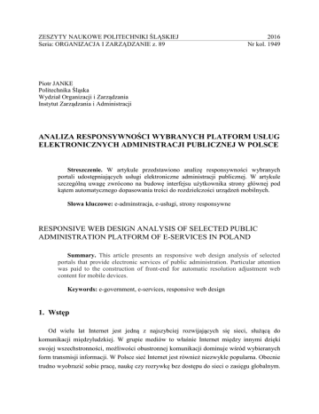 ZESZYTY NAUKOWE POLITECHNIKI ŚLĄSKIEJ Seria: ORGANIZACJA I ZARZĄDZANIE z. 89 2016 Nr kol. 1949 Piotr JANKE Politechnika Śląska Wydział Organizacji i Zarządzania Instytut Zarządzania i Administracji ANALIZA RESPONSYWNOŚCI WYBRANYCH PLATFORM USŁUG ELEKTRONICZNYCH ADMINISTRACJI PUBLICZNEJ W POLSCE Streszczenie. W artykule przedstawiono analizę responsywności wybranych portali udostępniających usługi elektroniczne administracji publicznej. W artykule szczególną uwagę zwrócono na budowę interfejsu użytkownika strony głównej pod kątem automatycznego dopasowania treści do rozdzielczości urządzeń mobilnych. Słowa kluczowe: e-adminstracja, e-usługi, strony responsywne RESPONSIVE WEB DESIGN ANALYSIS OF SELECTED PUBLIC ADMINISTRATION PLATFORM OF E-SERVICES IN POLAND Summary. This article presents an responsive web design analysis of selected portals that provide electronic services of public administration. Particular attention was paid to the construction of front-end for automatic resolution adjustment web content for mobile devices. Keywords: e-government, e-services, responsive web design 1. Wstęp Od wielu lat Internet jest jedną z najszybciej rozwijających się sieci, służącą do komunikacji międzyludzkiej. W grupie mediów to właśnie Internet między innymi dzięki swojej wszechstronności, możliwości obustronnej komunikacji dominuje wśród wybieranych form transmisji informacji. W Polsce sieć Internet jest również niezwykle popularna. Obecnie trudno wyobrazić sobie pracę, naukę czy rozrywkę bez dostępu do sieci o zasięgu globalnym. 178 P. Janke Według najnowszych danych dotyczących dostępu do tej sieci, w Polsce jest ponad 25 milionów jej użytkowników 1. Obecnie żyjemy w czasach, kiedy coraz większą uwagę zwracamy nie tyle na treść publikowaną w sieci Internet, ile na formę jej przekazywania. Często zdarza się, że nawigacja wybranej witryny w przeglądarce urządzenia mobilnego jest kłopotliwa i w związku z tym doznania związane z korzystaniem z portalu są nienajlepsze. Rozwój elektronicznej administracji publicznej w kraju zdeterminowany jest w dużej mierze przez wzrost liczby elektronicznych usług administracji publicznej. Bezpośredni dostęp do owych usług otrzymujemy przez portale internetowe, obsługujące e-usługi. Responsywność witryn internetowych jest obecnie czynnikiem mającym duży wpływ na postrzeganie zawartości portali internetowych przez klienta oraz miarą nowoczesności, związanej ze światowymi trendami. Zostało to zauważone i podkreślone również w raportach przygotowanych przez Centrum Projektów Informatycznych (obecnie Centrum Cyfrowej Administracji) ministerstwa Administracji i Cyfryzacji dotyczących dobrych praktyk w obszarze e-administracji 2. Fakt ten ma obecnie znaczenie również w pozycjonowaniu najpopularniejszej na świecie wyszukiwarki internetowej „Google” 3. Ponieważ stopień wykorzystania tych usług jest ważny (z punktu widzenia rozwoju e-administracji), więc w artykule analizie poddano wybrane portale, które udostępniają e-usługi pod kątem ich responsywności. 2. Responsywne strony WWW Od lat technologie mobilne przejmują poważne udziały na rynku urządzeń z dostępem do Internetu 4. Od wielu lat istnieje też tradycja tworzenia osobnych serwisów internetowych na potrzeby urządzeń mobilnych. Jeden i ten sam portal występuje pod dwiema niezależnymi postaciami, w zależności od rozpoznanego urządzenia (przeglądarki). Często również portale te występują pod dwoma adresami DNS 5, o czym świadczy automatyczne przekierowanie adresu URL w pasku przeglądarki. W tym miejscu należy podkreślić, że konieczność Internet World Stats. Internet User Statistics & 2014 Population for the 53 European countries and regions, www.internetworldstats.com/stats4.htm#europe. 2 Analiza dobrych praktyk w obszarze e-administracji. Centrum Projektów informatycznych 2013, www.cpi.gov.pl, s. 26-27. 3 4 SEO Benefits of Responsive Web Design. Search Engine Journal 2014, www.searchenginejournal.com/4seo-benefits-responsive-web-design/92807/. 4 Perspektywy rozwojowe. Mobile Online w Polsce. Raport IAB Polska 2014, s. 6. 5 DNS Domain Name System (DNS, pl. „system nazw domenowych”). 1 Analiza responsywności wybranych platform… 179 rozwiązania problemu aktualizacji i synchronizacji danych dla każdej wersji front-endu 6 wspólnego portalu. Obecnie funkcjonują trzy podejścia do projektowania witryn na urządzenia mobilne 7: − osobne adresy URL – jak już wspomniano w podejściu tym strona serwuje różny kod w zależności od urządzenia, stosując osobne adresy, − dynamiczne serwowanie treści – strona korzysta z tego samego adresu URL bez względu na urządzenie, ale generuje dla nich inne wersje kodu na podstawie dostępnych serwerowi informacji o przeglądarce użytkownika, − elastyczne projektowanie witryn – strona serwuje ten sam kod dla tego samego adresu URL bez względu na wykorzystane urządzenie użytkownika (komputer stacjonarny, tablet, komórka), ale pozwala generować obraz w różny sposób (czyli „elastycznie”) w zależności od rozmiaru wyświetlacza. Firma Google zaleca projektowanie witryn w sposób elastyczny. Elastyczne projektowanie witryn to modne ostatnio podejście do tworzenia zawartości stron internetowych. Z tym podejściem związany jest skrót RWD (Responsive Web Design), co oznacza, że strona responsywna to taka, która wykonana została z wykorzystaniem podejścia elastycznego. To, co jest charakterystyczne dla tego podejścia związane jest przede wszystkim z minimalizacją liczby front-endów dla wszystkich urządzeń, w tym tzw. mobilnych, do jednej, odpowiednio (elastycznie) zaprojektowanej strony 8. 3. Platformy usług elektronicznych administracji publicznej E-administracja w Polsce realizowana jest przede wszystkim przez liczne projekty krajowe, często współfinansowane przez Unię Europejską. Projek