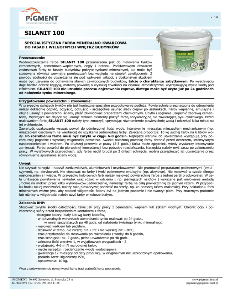 v. 3.0 SILANIT 100 SPECJALISTYCZNA FARBA MINERALNO-KWARCOWA DO FASAD I WILGOTNYCH WNĘTRZ BUDYNKÓW Przeznaczenie: Wodorozcieńczalna farba SILANIT 100 przeznaczona jest do malowania tynków cementowych, cementowo-wapiennych, cegły i betonu. Podstawowym obszarem zastosowań farby to fasady budynków pokryte tynkami mineralnymi, ale moŜe być stosowana równieŜ wewnątrz pomieszczeń bez względu na stopień zawilgocenia. Z powodu zdolności do utwardzania się pod wpływem wilgoci, z doskonałym skutkiem moŜe być uŜywana do odnawiania starych zawilgoconych budynków, takŜe o charakterze zabytkowym. Po wyschnięciu daje bardzo dobrze kryjącą, matową powłokę o wysokiej trwałości na czynniki atmosferyczne, wytrzymującą mycie wodą pod ciśnieniem. SILANIT 100 nie utrudnia procesu dojrzewania zapraw, dlatego moŜe być uŜyta juŜ po 24 godzinach od nałoŜenia tynku mineralnego. Przygotowanie powierzchni i stosowanie: W przypadku świeŜych tynków nie jest konieczne specjalne przygotowanie podłoŜa. Powierzchnię przeznaczoną do odnowienia naleŜy dokładnie odpylić, oczyścić, odtłuścić - szczególnie usunąć ślady olejów po szalunkach. Farby wapienne, emulsyjne i olejne usunąć z powierzchni ściany, pleśń zlikwidować preparatami chemicznymi. Ubytki i spękania uzupełnić zaprawą cementową. Wystające nie dające się usunąć stalowe elementy pokryć farbą antykorozyjną nie zawierającą pyłu cynkowego. Przed malowaniem farbą SILANIT 100 naleŜy tynk zmoczyć, spryskując równomiernie powierzchnię wodą i odczekać kilka minut na jej wchłonięcie. Zawartość opakowania wsypać powoli do odmierzonej ilości wody, intensywnie mieszając mieszadłem mechanicznym (np. mieszadłem osadzonym na wiertarce) do uzyskania jednorodnej farby. Zalecana proporcja: 10 kg suchej farby na 6 litrów wody. Po rozrobieniu farba musi być zuŜyta w ciągu 6-8 godzin. Najlepsze warunki do utwardzania występują przy pochmurnej pogodzie i wysokiej wilgotności powietrza. ŚwieŜo nałoŜoną powłokę farby chronić przed deszczem, intensywnym nasłonecznieniem i wiatrem. Po dłuŜszej przerwie w pracy (2-3 godz.) farba moŜe zgęstnieć, wtedy wystarczy intensywnie zamieszać. Farba powróci do pierwotnej konsystencji bez potrzeby rozcieńczania. Narzędzia naleŜy myć zaraz po zakończeniu pracy. W wyjątkowych przypadkach, gdy farba nadal brudzi po 2 dniach schnięcia, moŜna przyspieszyć jej utwardzanie przez równomierne spryskanie ściany wodą. Uwagi: Nie uŜywać narzędzi i naczyń zardzewiałych, aluminiowych i ocynkowanych. Nie gruntować preparatami polimerowymi (emulsyjnymi), np. akrylowymi. Nie stosować na farby i tynki polimerowe emulsyjne (np. akrylowe). Nie malować w czasie silnego nasłonecznienia i wiatru. W przypadku kolorowych farb naleŜy malować powierzchnię farbą z jednej partii produkcyjnej. W celu uniknięcia powstawania nakładek oraz róŜnic w odcieniu ( np. jaśniejszych nalotów ) wskazane jest malowanie metodą „mokre na mokre” przez kilku wykonawców jednocześnie, nanosząc farbę na całą powierzchnię za jednym razem. W przypadku braku takiej moŜliwości, naleŜy taką płaszczyznę podzielić na strefy, np. za pomocą taśmy malarskiej. Przy nakładaniu farb mineralnych waŜne jest, aby stopień wilgotności ściany był na jednym poziomie i nie tworzył plam. Przy znacznym poziomie lub róŜnicy w wilgotności naleŜy uŜyć farby w kolorze białym. Zalecenia BHP: Stosować zwykłe środki ostroŜności, takie jak przy pracy z cementem, wapnem lub szkłem wodnym. Chronić oczy i powierzchnię skóry przed bezpośrednim kontaktem z farbą. -dostępne kolory: biały lub wg karty kolorów, - w optymalnych warunkach utwardzania tynku malować po 24 godz., w mniej sprzyjających po 48 godz. od nałoŜenia świeŜego tynku mineralnego - malować wałkiem lub pędzlem, - stosować w temp. nie niŜszej niŜ +5°C i nie wyŜszej niŜ +30°C, - czas przydatności do stosowania po rozrobieniu z wodą: do 8 godzin, - czas schnięcia: ok. 2 godz., pełne utwardzenie po 48 godz. - zalecana ilość warstw: 1, w wyjątkowych przypadkach - 2 - wydajność: 4-6 m2/l rozrobionej farby, - mycie narzędzi i rozcieńczanie -woda wodociągowa - gwarancja 12 miesięcy od daty produkcji, w oryginalnym nie uszkodzonym opakowaniu, - posiada Atest Higieniczny PZH, - opakowania: 10 kg. Wraz z pojawieniem się nowej wersji karty traci waŜność karta poprzednia. PIGMENT 70-892 Szczecin, ul. Pyrzycka 23 A tel./fax: 091 462 10 20, 091 462 11 86 www.pigment.inet.pl [email protected]