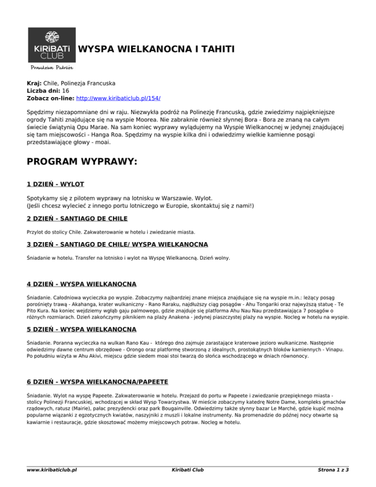 WYSPA WIELKANOCNA I TAHITI PROGRAM WYPRAWY: