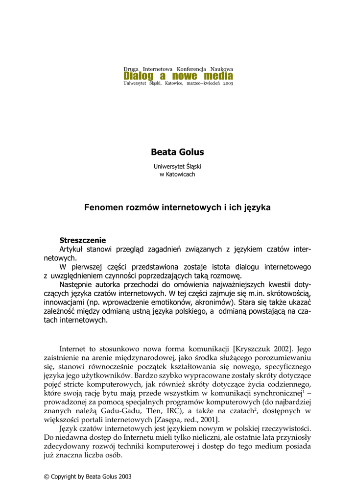 Druga Internetowa Konferencja Naukowa Dialog a nowe media Uniwersytet Śląski, Katowice, marzec—kwiecień 2003 Beata Golus Uniwersytet Śląski w Katowicach Fenomen rozmów internetowych i ich języka Streszczenie Artykuł stanowi przegląd zagadnień związanych z językiem czatów internetowych. W pierwszej części przedstawiona zostaje istota dialogu internetowego z uwzględnieniem czynności poprzedzających taką rozmowę. Następnie autorka przechodzi do omówienia najważniejszych kwestii dotyczących języka czatów internetowych. W tej części zajmuje się m.in. skrótowością, innowacjami (np. wprowadzenie emotikonów, akronimów). Stara się także ukazać zależność między odmianą ustną języka polskiego, a odmianą powstającą na czatach internetowych. Internet to stosunkowo nowa forma komunikacji [Kryszczuk 2002]. Jego zaistnienie na arenie międzynarodowej, jako środka służącego porozumiewaniu się, stanowi równocześnie początek kształtowania się nowego, specyficznego języka jego użytkowników. Bardzo szybko wypracowane zostały skróty dotyczące pojęć stricte komputerowych, jak również skróty dotyczące życia codziennego, które swoją rację bytu mają przede wszystkim w komunikacji synchronicznej1 – prowadzonej za pomocą specjalnych programów komputerowych (do najbardziej znanych należą Gadu-Gadu, Tlen, IRC), a także na czatach2, dostępnych w większości portali internetowych [Zasępa, red., 2001]. Język czatów internetowych jest językiem nowym w polskiej rzeczywistości. Do niedawna dostęp do Internetu mieli tylko nieliczni, ale ostatnie lata przyniosły zdecydowany rozwój techniki komputerowej i dostęp do tego medium posiada już znaczna liczba osób. © Copyright by Beata Golus 2003 Druga Internetowa Konferencja Naukowa Dialog a nowe media Uniwersytet Śląski, Katowice, marzec—kwiecień 2003 Niniejszy artykuł stanowi krótki z konieczności przegląd zagadnień związanych z językiem czatów internetowych. Jest on niejako wstępem do obszerniejszej pracy i jej zapowiedzią. Istota dialogu internetowego Sieciowe pogaduszki to stosunkowo nowa forma komunikacji, która jest mieszanką konwersacji twarzą w twarz i rozmowy telefonicznej, również zaliczanej do komunikacji synchronicznej. Jednakże, by w nich uczestniczyć, ludzie muszą pisać na klawiaturze, a to pociąga za sobą określone następstwa. Żeby wziąć udział w rozmowie odbywającej się na czacie, trzeba wykonać kilka czynności, które pozwolą nam się znaleźć w „wirtualnej rzeczywistości”. Osoba, która chce rozmawiać, musi najpierw wejść na stronę portalu, czyli internetowego serwisu informacyjnego (jakiegokolwiek, bowiem czaty są już we wszystkich), i nakierować „mysz” na ikonkę „czat”. Następnie trzeba się zalogować i wejść do jednego z pokoi rozmów (noszących np. nazwy Polityka, Towarzyski, Film itp.) czy też do pokoju regionalnego (np. Katowice, Kraków). W pokoju takim znajduje się pulpit ogólny, gdzie pisze się wypowiedzi, które mogą przeczytać wszystkie osoby w tym pokoju się znajdujące. Istnieje także możliwość prowadzenia rozmów prywatnych, tzw. priv, kiedy rozmawiają tylko dwie osoby w osobnym oknie. Osoby, które są stałymi bywalcami tych wirtualnych pokoi, mogą mieć już zarejestrowany swój pseudonim – nick. Z kolei ci, którzy nie chcą zostać rozpoznani, logują się pod nickami tymczasowymi. Czatujący, którzy są stałymi bywalcami, tworzą swoistą społeczność wirtualną, gdy porozumiewają się w sieci. Urządzają oni także zloty w świecie rzeczywistym, nazywane przez nich spotkaniami w realu. Cele czatowania mogą być różne. Może to być chęć nawiązania nowych znajomości, przyjaźni, romansu, znalezienie życiowego partnera, zwierzenie się, zabawa, czy też po prostu sposób spędzania wolnego czasu [Wallace 2001]. W sieci nie widać twarzy naszego rozmówcy. Tym, co widać, są słowa i to one determinują nasze stosunki, kontakty. Ludzie posługują się słowami w bardzo różny sposób i szybko dostosowują swój styl wypowiedzi do określonego kontekstu społecznego narzuconego przez współrozmówców. Internet zdecydowanie ułatwia porozumiewanie się oraz przełamywanie pewnej bariery osobom nieśmiałym, ale nie tylko. Internet, dzięki temu, że występujemy tam jako osoby anonimowe, pozwala nam mówić z dużą swobodą na tematy, które na co dzień są dla nas wstydliwe i drażliwe. Czat jest jednym z nielicznych miejsc, gdzie w krótkim czasie można poznać tak wielu ludzi, a także rozmawiać jednocześnie z wieloma osobami na różne tematy. W tym samym czasie można być rozbawionym rozmową z panią X i uczestniczyć w smutnej rozmowie z panem Y (przy czym pani X z panem Y niekoniecznie muszą rozmawiać, a nawet wiedzieć o swoim istnieniu). Charakterystyczne dla rozmów internetowych jest występowanie polilogu, czyli rozmowy wielu osób równocześnie. Jest to o tyle istotne, że w rzeczywistości 2 Druga Internetowa Konferencja Naukowa Dialog a nowe media Uniwersytet Śląski, Katowice, marzec—kwiecień 2003 nie jesteśmy w stanie równocześnie rozmawiać z takim ogromem osób, jest to fizycznie niemożliwe. Poza tym w polilogu prowadzonym na żywo pewne kwestie mogą nakładać się na siebie, natomiast na czatach wszystkie kwestie ukazują się sekwencyjnie. Jako masowy środek komunikacji pisanej Internet wyróżnia się tym, że zatarta została w nim typowa dla języka pisanego granica między nadawcą a odbiorcą. W sieci każdy może się stać nadawcą komunikatu przeznaczonego dla masowego odbiorcy. Co więcej, każdy z odbiorców konkretnego komunikatu może w dowolnym momencie zareagować i przesłać do nadawcy lub innych odbiorców tego komunikatu swój komentarz. Masowość czatów internetowych nie może się wprawdzie równać z masowością telewizji, lecz istnieją takie pokoje pogawędek, które codziennie gromadzą 