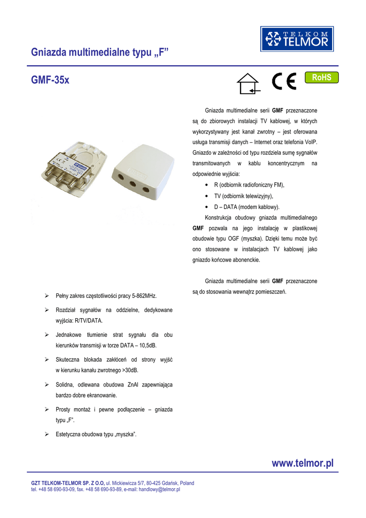 Gniazda multimedialne typu „F” RoHS GMF-35x Gniazda multimedialne serii GMF przeznaczone są do zbiorowych instalacji TV kablowej, w których wykorzystywany jest kanał zwrotny – jest oferowana usługa transmisji danych – Internet oraz telefonia VoIP. Gniazdo w zależności od typu rozdziela sumę sygnałów transmitowanych w kablu koncentrycznym na odpowiednie wyjścia: • R (odbiornik radiofoniczny FM), • TV (odbiornik telewizyjny), • D – DATA (modem kablowy). Konstrukcja obudowy gniazda multimedialnego GMF pozwala na jego instalację w plastikowej obudowie typu OGF (myszka). Dzięki temu może być ono stosowane w instalacjach TV kablowej jako gniazdo końcowe abonenckie. Gniazda multimedialne serii GMF przeznaczone Pełny zakres częstotliwości pracy 5-862MHz. Rozdział sygnałów na oddzielne, dedykowane są do stosowania wewnątrz pomieszczeń. wyjścia: R/TV/DATA. Jednakowe tłumienie strat sygnału dla obu kierunków transmisji w torze DATA – 10,5dB. Skuteczna blokada zakłóceń od strony wyjść w kierunku kanału zwrotnego >30dB. Solidna, odlewana obudowa ZnAl zapewniająca bardzo dobre ekranowanie. Prosty montaż i pewne podłączenie – gniazda typu „F”. Estetyczna obudowa typu „myszka”. www.telmor.pl GZT TELKOM-TELMOR SP. Z O.O, ul. Mickiewicza 5/7, 80-425 Gdańsk, Poland tel. +48 58 690-93-09, fax. +48 58 690-93-89, e-mail: [email protected] PARAMETRY TECHNICZNE TYP Pasmo zaporowe: RTV->WE Pasmo toru RTV (WE->RTV) Pasmo toru TV (WE->TV) Pasmo toru R (WE->R) Pasmo toru: WE->D Pasmo toru: D->WE Tłumienie zaporowe (RTV->WE) Tłumienie zaporowe (TV i R->WE) Tłumienie strat toru (WE->RTV) Tłumienie strat toru TV Tłumienie strat toru R Tłumienie strat toru (WE->D) Tłumienie strat toru (D->WE) Separacja wyjść (RTV-D) Separacja wyjść (D-TV) Separacja wyjść (D-TV) Separacja wyjść (R-TV) Poziom sygnału podawanego z modemu na wyj. „D” (5-65 MHz) Typ złącz MHz MHz MHz MHz MHz MHz dB GMF-350 5-65 87-862 / / 87-862 5-65 min.30 GMF-351 5-65 / 87-862 87-140 87-862 5-65 / GMF-352 5-65 87-862 / / 87-862 5-65 min.35 dB / min.30 / dB dB dB dB dB 3,0 / / max.10,5 max.1,0! / 4,0 ±1,0 13,0 ±1,0 max.10,5 max.1,0! dB min.30,0 / dB dB dB dB / / / / dB / min.30 (pasmo TV) min.40 (5-65 MHz) min.45 (5-65 MHz) min.22 (pasmo R) min. 20 (pasmo TV) 2 x 7,0 / / max.10,5 max.1,0! min.35 (5-65 MHz) min.40 (RTV) / / / / dBuV max. 120 max. 120 max. 120 max. 120 / 3 x gniazdo „F" 4 x gniazdo „F" 4 x gniazdo „F" 3 x gniazdo „F" Parametry techniczne mogą ulec zmianie bez wcześniejszego powiadomienia. GZT TELKOM-TELMOR SP. Z O.O, ul. Mickiewicza 5/7, 80-425 Gdańsk, Poland tel. +48 58 690-93-09, fax. +48 58 690-93-89, e-mail: [email protected] GMF-353 5-65 87-862 87-862 5-65 min.30 / 4,0 ±1,0 max. 4,5 ±1,0 max.1,0! min.30,0 / / / / / / www.telmor.pl
