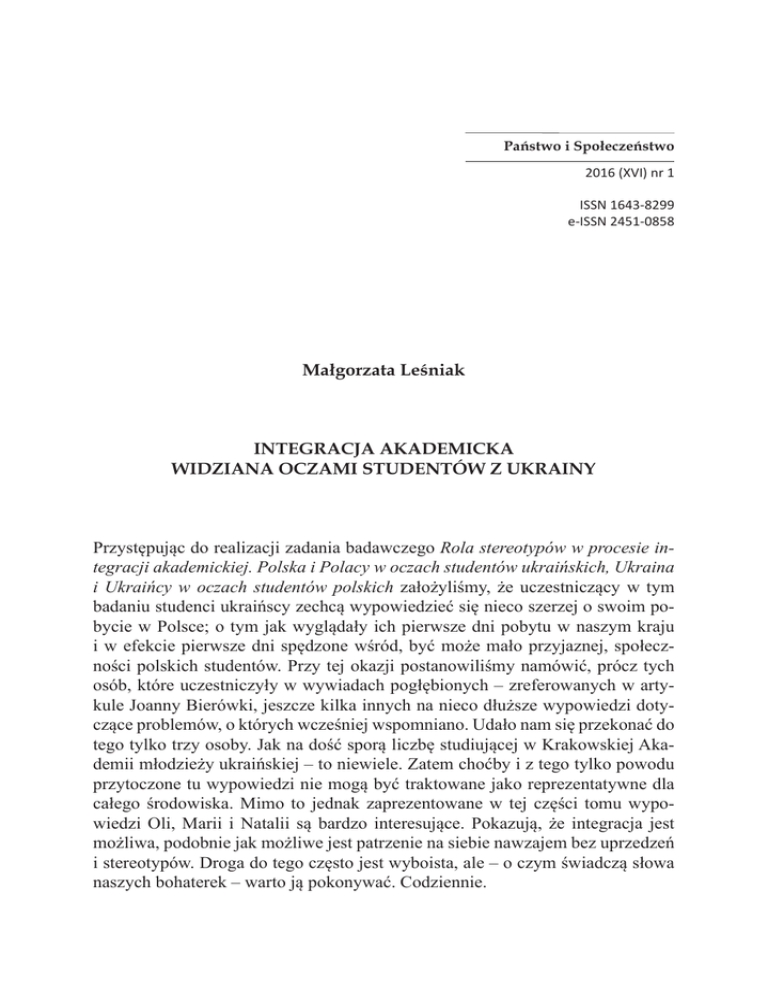 Państwo i Społeczeństwo 2016 (XVI) nr 1 ISSN 1643-8299 e-ISSN 2451-0858 Małgorzata Leśniak INTEGRACJA AKADEMICKA WIDZIANA OCZAMI STUDENTÓW Z UKRAINY Przystępując do realizacji zadania badawczego Rola stereotypów w procesie integracji akademickiej. Polska i Polacy w oczach studentów ukraińskich, Ukraina i Ukraińcy w oczach studentów polskich założyliśmy, że uczestniczący w tym badaniu studenci ukraińscy zechcą wypowiedzieć się nieco szerzej o swoim pobycie w Polsce; o tym jak wyglądały ich pierwsze dni pobytu w naszym kraju i w efekcie pierwsze dni spędzone wśród, być może mało przyjaznej, społeczności polskich studentów. Przy tej okazji postanowiliśmy namówić, prócz tych osób, które uczestniczyły w wywiadach pogłębionych – zreferowanych w artykule Joanny Bierówki, jeszcze kilka innych na nieco dłuższe wypowiedzi dotyczące problemów, o których wcześniej wspomniano. Udało nam się przekonać do tego tylko trzy osoby. Jak na dość sporą liczbę studiującej w Krakowskiej Akademii młodzieży ukraińskiej – to niewiele. Zatem choćby i z tego tylko powodu przytoczone tu wypowiedzi nie mogą być traktowane jako reprezentatywne dla całego środowiska. Mimo to jednak zaprezentowane w tej części tomu wypowiedzi Oli, Marii i Natalii są bardzo interesujące. Pokazują, że integracja jest możliwa, podobnie jak możliwe jest patrzenie na siebie nawzajem bez uprzedzeń i stereotypów. Droga do tego często jest wyboista, ale – o czym świadczą słowa naszych bohaterek – warto ją pokonywać. Codziennie. 218 MAŁGORZATA LEŚNIAK Imiona bohaterek – za ich zgodą – są prawdziwe. W tekstach dokonano jedynie korekty stylistycznej; zależało nam bowiem na tym, by jak najwierniej oddać emocje, postawy i poglądy autorek przytoczonych wypowiedzi. Ola Jak dzisiaj pamiętam ten dzień, kiedy stojąc przed wejściem do klatki schodowej patrzyłam na ojca jak kot w tej bajce „Szrek”… Pierwsze trzy dni przed rozpoczęciem nauki były najgorsze. Prawie wszystko było inne i nowe. Przez długi czas nie wiedziałam jak kupić bilet okresowy, albo jak dojechać na uczelnię, dopóki nie poznałam dokładnie rozkładu jazdy tramwajów i autobusów. Pamiętam, że dużo moich znajomych złapano w tramwaju, bo po prostu nie wiedzieli, że zakupiony wcześniej bilet trzeba kasować. Często zdarzały się takie sytuacje, że nie mogłam poprosić nikogo o pomoc, ponieważ wydawało mi się, że nikt mnie nie zrozumie; czułam się wtedy bardzo głupio. O czym myślałam w tym momencie? Ano o tym, że ktoś zauważy, że nie jestem Polką i pomyśli, że nas, Ukraińców, jest tu zbyt dużo i z tego powodu ten ktoś nie będzie pozytywnie nastawiony do mnie i do naszej rozmowy. I to jest przykre! Bo od samego początku, od pierwszych dni pobytu w Polsce masz taką wiedzę i jak ci nie starczy śmiałości, aby przejść przez tę barierę, to nie ma sensu tu zostawać. Dużo złego wynika z wrogości między ludźmi różnych nacji. Byłam świadkiem jak moi koledzy kłócili się nie próbując nawet poznać się między sobą; zauważyłam również, że każdy żart ze strony polskiej grupy był traktowany ze złością. Dlatego na początku czułam się obco w grupie. Nie było nas dużo, około dziesięciu osób. Już pierwszego dnia nauki zostałam starostą grupy ukraińskiej, więc miałam dobry kontakt ze starostą całego roku. W związku z tym byłam codziennie zasypywana pytaniami ze strony moich ukraińskich kolegów. Żeby na te pytania odpowiedzieć – na przykład jak napisać jakąś pracę, musiałam sama mieć o tym jakąś wiedzę. Dlatego odrzuciłam jakikolwiek strach i starałam się pytać o wszystko w szczegółach i prosiłam polskich kolegów i wykładowców, by powtórzyli, albo nawet napisali słowo, którego nie rozumiałam. Do dzisiaj tak robię – proszę moich przyjaciół, aby mi tłumaczyli wszystko, czego nie rozumiem. Jestem teraz na drugim roku i jestem jedynym obcokrajowcem w swojej grupie. Dużo oddałam sił i nerwów tej nauce i jestem pewna, że to ma teraz duży plus i swój sens. Pamiętam, że na początku mogłam czytać 10 stron cały wieczór, siedząc przy komputerze i tłumaczyć co trzecie słowo, jak nie w translatorze, to w Wikipedii na pewno. Ale powoli, krok za krokiem, osiągałam swoje cele. Przez pół roku mieszkania w Polsce, znalazłam pracę, w której pracuję do dziś i zarabiam na swoje utrzymanie. Cały ten okres ćwiczyłam też pływanie zawodowo i na jakiś czas przeniosłam się do ekipy Uniwersytetu Jagiellońskiego, ale nie na długo starczyło mi sił na takie tempo życia. Musiałam nieco zwolnić. INTEGRACJA AKADEMICKA WIDZIANA OCZAMI STUDENTÓW Z UKRAINY219 Aby skończyć już swoją krótką opowieść i w dodatku skończyć ją ładnie, muszę powiedzieć, że było mi wówczas strasznie trudno, ale warto było przez to wszystko przejść. Przez te półtora roku w Polsce sporo się nauczyłam – na przykład odpowiedzialności. Mało kto z moich polskich kolegów wie, że zwykle jak Ukrainiec zaczyna tu studiować to ma dopiero osiemnaście lat i nawet mniej. Ja miałam siedemnaście. Ważne, by zrozumieć, że przechodzimy w tym czasie przez dwa etapy: etap dorastania i etap kształtowania osobowości. To wszystko dzieje się w jednym momencie i na tyle szybko, że czasami żałujemy swoich wyborów. Z mojej strony dodam jeszcze, że zawsze trzeba stawiać na swoim i być pewnym swoich sił. No i nie poddawać się słabości. Wtedy w każdym miejscu gdzie się jest można znaleźć przyjaznych ludzi i ich pomocną dłoń. Marija Witam każdego, kto to czyta i mam nadzieje, że komuś to się przyda. Od zawsze marzyłam, by studiować za granicą, bo lubię poznawać coś nowego. Na pomysł studiowania w Polsce wpadłam w 9 klasie. Wtedy miałam 14 lat (u nas jest inny system numeracji klas). Moja mama urodziła się koło Lwowa, jej mama jest Ukrainką, a ojc