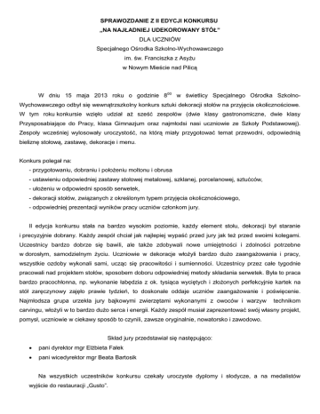 SPRAWOZDANIE Z II EDYCJI KONKURSU „NA NAJŁADNIEJ UDEKOROWANY STÓŁ” DLA UCZNIÓW Specjalnego Ośrodka Szkolno-Wychowawczego im. św. Franciszka z Asyżu w Nowym Mieście nad Pilicą W dniu 15 maja 2013 roku o godzinie 800 w świetlicy Specjalnego Ośrodka SzkolnoWychowawczego odbył się wewnątrzszkolny konkurs sztuki dekoracji stołów na przyjęcia okolicznościowe. W tym roku konkursie wzięło udział aż sześć zespołów (dwie klasy gastronomiczne, dwie klasy Przysposabiające do Pracy, klasa Gimnazjum oraz najmłodsi nasi uczniowie ze Szkoły Podstawowej). Zespoły wcześniej wylosowały uroczystość, na którą miały przygotować temat przewodni, odpowiednią bieliznę stołową, zastawę, dekoracje i menu. Konkurs polegał na: - przygotowaniu, dobraniu i położeniu moltonu i obrusa - ustawieniu odpowiedniej zastawy stołowej metalowej, szklanej, porcelanowej, sztućców, - ułożeniu w odpowiedni sposób serwetek, - dekoracji stołów, związanych z określonym typem przyjęcia okolicznościowego, - odpowiedniej prezentacji wyników pracy uczniów członkom jury. II edycja konkursu stała na bardzo wysokim poziomie, każdy element stołu, dekoracji był staranie i precyzyjnie dobrany. Każdy zespół chciał jak najlepiej wypaść przed jury jak też przed swoimi kolegami. Uczestnicy bardzo dobrze się bawili, ale także zdobywali nowe umiejętności i zdolności potrzebne w dorosłym, samodzielnym życiu. Uczniowie w dekoracje włożyli bardzo dużo zaangażowania i pracy, wszystkie ozdoby wykonali sami, ucząc się pracowitości i sumienności. Uczestnicy przez całe tygodnie pracowali nad projektem stołów, sposobem doboru odpowiedniej metody składania serwetek. Była to praca bardzo pracochłonna, np. wykonanie łabędzia z ok. tysiąca wyciętych i złożonych perfekcyjnie kartek na stół zaręczynowy zajęło prawie tydzień, to doskonale oddaje uczniów zaangażowanie i poświęcenie. Najmłodsza grupa urzekła jury bajkowymi zwierzętami wykonanymi z owoców i warzyw technikom carvingu, włożyli w to bardzo dużo serca i energii. Każdy zespół musiał zaprezentować swój własny projekt, pomysł, uczniowie w ciekawy sposób to czynili, zawsze oryginalnie, nowatorsko i zawodowo. Skład jury przedstawiał się następująco: pani dyrektor mgr Elżbieta Fałek pani wicedyrektor mgr Beata Bartosik Na wszystkich uczestników konkursu czekały uroczyste dyplomy i słodycze, a na medalistów wyjście do restauracji „Gusto”. W konkursie wzięły udział następujące zespoły: Klasa I ZSZ Kucharz – PRZYJĘCIE ZARĘCZYNOWE (Marcin Walczak) – przygotowanie i nakrycie stołu: Lucyna Czapnik Dominika Stempniak Paulina Kuleczka Ilona Stępniak Damian Budek Sebastian Biedrzycki Sylwia Lesiak Klasa II ZSZ Kucharz małej gastronomii – PRZYJĘCIE MUZYCZNE (Marcin Walczak) – przygotowanie i nakrycie stołu: Marta Kłos Sylwia Stańczyk Michał Skrętowski Iwona Mrowińska Aneta Budek Monika Goździk Kinga Śmigiel Damian Lesiak Klasa APP – WIOSENNY OBIAD (wychowawca Katarzyna Zielińska) – przygotowanie i nakrycie stołu: Katarzyna Kucharska Iwona Binkiewicz Przemysław Mizerski Damian Zelman Paweł Piekarski Szymon Wielgus Rafał Pawiński Klasa BPP – UROCZYSTA KOLACJA (wychowawca Magdalena Bednarska) – przygotowanie i nakrycie stołu: Monika Piętka Bartek Dąbrowski Rafał Waligóra Sebastian Podkowiński Marcin Abramczyk Krzysztof Barański Adrian Sudak Klasa BP – STÓŁ URODZINOWY (wychowawca Iwona Ceran) – przygotowanie i nakrycie stołu: Klaudia Partyka Mariusz Bors Oskar Kwiecień Łukasz Grot Kamil Worach Klasa I – III P – PRZYJĘCIE KOMUNIJNE (wychowawca Agnieszka Milczarczyk) – przygotowanie i nakrycie stołu: Dominik Kłos Kamil Kłos Sebastian Kowalski Jan Tomczyk Mateusz Jagiełło Jakub Kobus Adrian Kaletka Jakub Dorociński WYNIKI II EDYCJI KONKURSU na najładniej przygotowany i nakryty stół I miejsce: KLASA I – III P – PRZYJĘCIE KOMUNIJNE II miejsce: KLASA I ZSZ Kucharz – PRZYJĘCIE ZARĘCZYNOWE III miejsce: KLASA II Kucharz małej gastronomii – PRZYJĘCIE MUZYCZNE IV miejsce: KLASA BP – STÓŁ URODZINOWY IV miejsce: KLASA APP – WIOSENNY OBIAD IV miejsce: KLASA BPP – UROCZYSTA KOLACJA Konkurs zorganizowali i przeprowadzili: mgr Katarzyna Zielińska mgr Magdalena Bednarska mgr Marcin Walczak Opracował: Marcin Walczak
