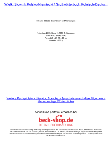 Wielki Slownik Polsko-Niemiecki / Großwörterbuch Polnisch-Deutsch Mit rund 395000 Stichwörtern und Wendungen 1. Auflage 2009. Buch. X, 1090 S. Hardcover ISBN 978 3 87548 559 2 Format (B x L): 19 x 25 cm Gewicht: 1880 g Weitere Fachgebiete > Literatur, Sprache > Sprachwissenschaften Allgemein > Mehrsprachige Wörterbücher schnell und portofrei erhältlich bei Die Online-Fachbuchhandlung beck-shop.de ist spezialisiert auf Fachbücher, insbesondere Recht, Steuern und Wirtschaft. Im Sortiment finden Sie alle Medien (Bücher, Zeitschriften, CDs, eBooks, etc.) aller Verlage. Ergänzt wird das Programm durch Services wie Neuerscheinungsdienst oder Zusammenstellungen von Büchern zu Sonderpreisen. Der Shop führt mehr als 8 Millionen Produkte. Jak korzystać ze słownika A. Jak znaleźć szukane hasło? . Hasła, w tym także skróty i skrótowce, ułożone sa˛ w porza˛dku alfabetycznym. Odste ˛py, ła˛czniki, apostrofy, obce znaki diakrytyczne i pionowa kreska nie wpływaja˛na porza˛dek haseł . . Homonimy – wyrazy o tej samej pisowni – sa˛ traktowane jako oddzielne hasła opatrzone cyfra˛ arabska˛ podniesiona˛ o pół wiersza . . Wyraz hasłowy może mieć postać jedno- lub wielowyrazowa˛ . Alfabetyczna kolejność haseł. Jako homonimy zostały zapisane: . wyrazy maja˛ce taka˛ sama˛ postać hasłowa˛, ale różnia˛ce sie˛ znaczeniem i etymologia˛, . bezokoliczniki wchodza˛ce w skład różnych par aspektowych, . jednoaspektowe elementy par czasownikowych. We wspólne hasła poła˛czono: . me ˛skie i żeńskie warianty tego samego hasła, . rzeczowniki rodzaju me ˛skiego i żeńskiego maja˛ce wspólny odpowiednik, . warianty lub quasi-warianty rzeczownikowe, . warianty przymiotnikowe, . zdrobnienia i zgrubienia, EBC ... e-biznes m ... EBOiR ... ebol|a ż ... eboni|t m ... bak 1 m (zbiornik) ... bak 2 m zw lm (zarost) ... zapa|ść 1 dk — zapa|dać ndk I npch ... zapa|ść 2 dk — zapa|sać ndk I pch ... beczeć 1 ndk ? bekna˛ć1 ... becz|eć 2 ndk npch ... Belg m, ~ijka ż ... beks|a m, ż pot. ... . pary aspektowe wraz z wariantami tworza˛cych je form czasownikowych, bachanali|a, ~e tylko lm ... Benelu|ks, ~x m ... bizanty|jski, ~ński przym ... bielu|tki (~sieńki, ~teńki) przym zdr ... brelo|k m (~czek zdr) ... ba˛k|na˛ć dk — ba˛k|ać ndk I ... nadbie|c, ~gna˛ć dk — nadbie|gać ndk . skostniałe wyrażenia przyimkowe. bez ustanku przysł ... Wspólne hasło dla dokonanej i niedokonanej formy czasownika, gdy różnia˛ sie˛ od siebie przyrostkiem. ba˛k|na˛ć dk — ba˛k|ać ndk ... Oddzielne hasła dla form tworzonych przez dodanie przedrostka. adres|ować ndk pch npch ... . Postać dokonana˛ i niedokonana˛ czasowników, różnia˛cych sie˛ od siebie przyrostkiem, poła˛czono we wspólne hasło i umieszczono zgodnie z porza˛dkiem alfabetycznym w miejscu właściwym dla formy dokonanej . Forma niedokonana stanowi wtedy hasło odsyłaczowe . Jeśli w którymś ze znaczeń czasownik wyste˛puje wyła˛cznie w formie dokonanej lub niedokonanej, to znaczenie takie jest odnotowane w jednoaspektowym haśle traktowanym jako homonim . W przypadku czasowników, których forma dokonana tworzona jest przez dodanie przedrostka, obydwa elementy pary aspektowej – dokonany i niedokonany – traktowane sa˛ jako oddzielne hasła . (umieszczać adres) adressieren [list, paczke˛] (do kogoś an jmdn) (kierować) richten [pytanie] (do kogoś an jmdn zaadres|ować dk pch (opatrzyć adresem) adressieren [list, paczke˛] (do kogoś an jmdn); ~owana koperta zwrotna adressierter Rückumschlag m ksia˛żk. (skierować) adressieren, richten [uwage˛, pytanie] (do kogoś an jmdn) B. Budowa artykułu hasłowego . Artykuły hasłowe maja˛ budowe˛ hierarchiczna˛ i ze wzgle˛du na cechy gramatyczne dziela˛ sie˛ na podhasła numerowane cyframi rzymskimi . Z niektórymi podhasłami zwia˛zane sa˛ swoiste formy podstawowe . . W obre˛bie hasła cyframi arabskimi oznaczono różne znaczenia danego wy. razu . Do rozróżnienia znaczeń wyrazu hasłowego stosuje sie˛ minidefinicje , kwalifikatory lub typowe słowa ła˛cza˛ce sie˛ z wyrazem hasłowym w danym znaczeniu . Brak kwalifikatora oznacza, że wyraz jest używany w je˛zyku ogólnym i nie jest nacechowany stylistycznie lub emocjonalnie. Pełna lista kwalifikatorów znajduje sie˛ na wyklejce pierwszej. Hierarchiczna budowa artykułu hasłowego. Kategorie gramatyczne oznaczono cyframi rzymskimi. bis I m ... II przym ndm ... III wykrz ... Formy podstawowe dla podhaseł. bilans|ować ndk I pch ... II bilansować sie˛ ... biodrów|ka I ż tylko lp Kulin. ... II biodrówki tylko lm pot. (spodnie) ... Znaczenia wyróżniono cyframi arabskimi. basen m ... Minidefinicje pokazuja˛: . różnice pomie˛dzy poszczególnymi znaczeniami, . różnice pomie˛dzy odpowiednikami w obre˛bie jednego znaczenia lub przykładu użycia. Kwalifikatory wskazuja˛ na ograniczenia geograficzne lub stylistyczne w użyciu danego wyrazu, a także na dziedzine˛ życia, do której sie˛ odnosza˛. (pływalnia) ... pot. (długość basenu) (zbiornik) ... Geog., Geol. ... Med. ... ba|nia ż (kulisty przedmiot) ... zgr (naczynie) ... pot. (głowa) ... bane|r m (reklama w internecie) (Werbe)Banner n (-s, -); (reklama na ulicy) Werbeplane ż babu|nia ż pieszcz. Omi ż (-, -s) pieszcz. ; Grosi n (-s, -s a. -) CH chip m Elektron., Komput. (Mikro)Chip m (-s, -s) Kwalifikator może dotyczyć: . całego hasła, . jednego podhasła, . jednego znaczenia, . jednego odpowiednika, . pojedynczego zwrotu lub przykładowego zdania polskiego lub niemieckiego. Słowa, z którymi wyraz hasłowy typowo sie˛ ła˛czy, to: . podmioty czasowników lub fraz czasownikowych, . dopełnienia czasowników lub zwrotów z takimi czasownikami, . wyrazy określane przez przymiotniki i przysłówki. . Odpowiedniki w pełni równoważne sa˛ . rozdzielone przecinkami . Odpowiedniki różnia˛ce sie ˛ zakresem użycia, stylem, ła˛czliwościa˛, odcieniem znaczeniow