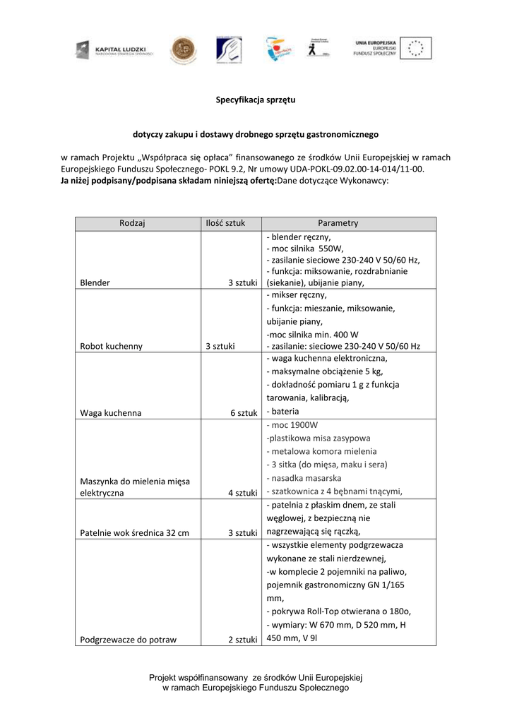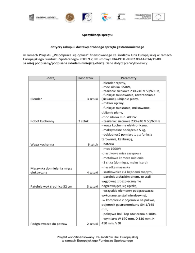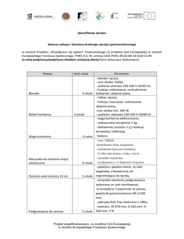 Specyfikacja sprzętu dotyczy zakupu i dostawy drobnego sprzętu gastronomicznego w ramach Projektu „Współpraca się opłaca” finansowanego ze środków Unii Europejskiej w ramach Europejskiego Funduszu Społecznego- POKL 9.2, Nr umowy UDA-POKL-09.02.00-14-014/11-00. Ja niżej podpisany/podpisana składam niniejszą ofertę:Dane dotyczące Wykonawcy: Rodzaj Ilość sztuk Blender 3 sztuki Robot kuchenny 3 sztuki Waga kuchenna 6 sztuk Maszynka do mielenia mięsa elektryczna 4 sztuki Patelnie wok średnica 32 cm 3 sztuki Podgrzewacze do potraw 2 sztuki Parametry - blender ręczny, - moc silnika 550W, - zasilanie sieciowe 230-240 V 50/60 Hz, - funkcja: miksowanie, rozdrabnianie (siekanie), ubijanie piany, - mikser ręczny, - funkcja: mieszanie, miksowanie, ubijanie piany, -moc silnika min. 400 W - zasilanie: sieciowe 230-240 V 50/60 Hz - waga kuchenna elektroniczna, - maksymalne obciążenie 5 kg, - dokładność pomiaru 1 g z funkcja tarowania, kalibracją, - bateria - moc 1900W -plastikowa misa zasypowa - metalowa komora mielenia - 3 sitka (do mięsa, maku i sera) - nasadka masarska - szatkownica z 4 bębnami tnącymi, - patelnia z płaskim dnem, ze stali węglowej, z bezpieczną nie nagrzewającą się rączką, - wszystkie elementy podgrzewacza wykonane ze stali nierdzewnej, -w komplecie 2 pojemniki na paliwo, pojemnik gastronomiczny GN 1/165 mm, - pokrywa Roll-Top otwierana o 180o, - wymiary: W 670 mm, D 520 mm, H 450 mm, V 9l Projekt współfinansowany ze środków Unii Europejskiej w ramach Europejskiego Funduszu Społecznego Termometr z sondą Termometr elektroniczny Kuchenka indukcyjna Noże - 5 sztuk w komplecie Komplet garnków - 6 sztuk w komplecie Komplet noży do carvingu - pomiar temperatur 0-300oC, 2 sztuki - obudowa ze stali nierdzewnej 18/10, - pomiar temperatury z zakresu (-50)(280oC), - sonda 210 mm, - pokrowiec na sondę, - bateria 3 sztuki - bezpieczny system grzewczy, - płaska i gładka powierzchnia, - obudowa wykonana ze stali nierdzewnej, - powierzchnia robocza (WxD): 3 sztuki 274X274 mm - skład zestawu: nóż szefa kuchni: długość min. 200 mm; nóż do chleba długość min. 200 mm; nóż do oddzielania kości długość min. 140 mm; nóż uniwersalny długość min. 200 mm; nóż do jarzyn długość ostrza noża min. 10 80mm kompletów - stal kuta, - zestaw garnków z pokrywami do indukcji wykonane ze stali nierdzewnej 18/10 - wielowarstwowe dno kapsułkowe, - skład zestawu: garnek średnia: 160 mm, H 120mm, V 2,5 garnek: średnica: 200mm, H200, V 6,3 garnek: średnica: 240 mm, H200 mm, V 9,0 garnek: średnica: 160 mm, H 95 mm, V 1,9 garnek: średnica: 240 mm, H 160 mm, V 7,2 garnek: średnica: 280 mm, H 180 mm, V 11,1 3 komplety - noże tajskie skład zestawu : nóż syjamski (odpowiednio wyprofilowane ostrze i rękojeść); 20 nóż syjamski duży ( z lekko wygiętym kompletów ostrzem), Projekt współfinansowany ze środków Unii Europejskiej w ramach Europejskiego Funduszu Społecznego nóż prosty (do obierania i kształtowania warzyw i owoców), - stal nierdzewna Projekt współfinansowany ze środków Unii Europejskiej w ramach Europejskiego Funduszu Społecznego