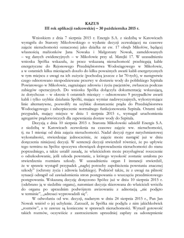 KAZUS III rok aplikacji radcowskiej – 30 października 2015 r. Wnioskiem z dnia 7 sierpnia 2015 r. Energis S.A. z siedzibą w Katowicach wystąpiła do Starosty Mikołowskiego o wydanie decyzji zezwalającej na czasowe zajęcie nieruchomości oznaczonej jako działka nr ew. 17 obręb Mikołów, będącej własnością małżonków Jana Nowaka i Małgorzaty Nowak, zameldowanych – wg danych ewidencyjnych – w Mikołowie przy ul. Matejki 17. W uzasadnieniu wniosku Spółka wskazała, że przez wskazaną nieruchomość przebiegają kable energetyczne do Rejonowego Przedsiębiorstwa Wodociągowego w Mikołowie, a w ostatnich kilku miesiącach doszło do kilku poważnych awarii kabli energetycznych w tym miejscu z uwagi na ich zużycie (pochodzą jeszcze z lat 70-tych), w następstwie czego odnotowano niespodziewane przerwy w dostawie wody do pobliskiego Szpitala Powiatowego w Mikołowie, zagrażające zdrowiu i życiu pacjentów, zwłaszcza podczas zabiegów operacyjnych. Do wniosku Spółka dołączyła dokumentację wskazującą, że dotychczas – w okresie 6 ostatnich miesięcy – odnotowano 9 przypadków awarii kabli i tylko szybkie działania Spółki, mające wymiar nadzwyczajnych, wykorzystujące linie alternatywne, pozwoliły na szybkie dostarczenie prądu do Przedsiębiorstwa Wodociągowego i zabezpieczenie normalnego funkcjonowania Szpitala. Ostatni taki przypadek, mający miejsce w dniu 1 sierpnia 2015 r., wymagał uruchomienia agregatów prądotwórczych dla zapewnienia dostaw wody do Szpitala. Decyzją z dnia 10 sierpnia 2015 r. Starosta Mikołowski udzielił Energis S.A. z siedzibą w Katowicach zezwolenia na czasowe zajęcie ww. nieruchomości, tj. na 1 miesiąc od dnia zajęcia nieruchomości. Nadał decyzji rygor natychmiastowej wykonalności, stwierdzając jednocześnie, że zajęcie może nastąpić już w dniu doręczenia niniejszej decyzji. W sentencji decyzji stwierdził również, że po upływie tego terminu na Spółce spoczywa obowiązek doprowadzenia nieruchomości do stanu poprzedniego, a także ustalił zasadę, że właścicielom może przysługiwać roszczenie o odszkodowanie, jeśli szkoda powstanie, a którego wysokość zostanie ustalona po stwierdzeniu rozmiaru szkody. W uzasadnieniu organ I instancji stwierdził, że w sprawie wystąpił przypadek „nagłej potrzeby zapobieżenia powstaniu znacznej szkody” (ochrony życia i zdrowia ludzkiego). Podniósł także, że z uwagi na pilność sytuacji odstąpił od zawiadomienia stron postępowania o wszczęciu przedmiotowego postępowania. Wskazaną decyzję doręczono Spółce już w dniu 10 sierpnia 2015 r. (odebrano ją w siedzibie organu), natomiast decyzja skierowana do właścicieli wróciła do organu po uprzednim podwójnym awizowaniu z adnotacją „nie podjęto w terminie”, „adresaci wyprowadzili się”. W odwołaniu od ww. decyzji, nadanym w dniu 24 sierpnia 2015 r., Pan Jan Nowak wniósł o jej uchylenie. Zarzucił, że Spółka nie podjęła z nim jakichkolwiek „rozmów”, a te zawsze są konieczne w sprawach nieruchomości. Wyraził gotowość takich rozmów, oczywiście z zastrzeżeniem uprzedniej zapłaty za udostepnienie nieruchomości. Zaznaczył, że nie można tu mówić o jakiejkolwiek nagłości, a nadto, że zezwolenie na tzw. nagłe zajęcie nie może dotyczyć usuwania awarii. Stwierdził, że jak zabraknie wody w Szpitalu to można ją dostarczyć beczkowozem. Wskazał także, że o zajęciu nieruchomości dowiedział się od sąsiada, który przekazał mu taką informację telefonicznie. Nie mieszka bowiem pod adresem: Mikołów, ul. Matejki 17 już od 5 lat. W piśmie z dnia 15 września 2015 r., stanowiącym ustosunkowanie się do odwołania, Spółka wniosła o stwierdzenie niedopuszczalności odwołania Pana Jana Nowaka jako że decyzja nie weszła wobec niego do obrotu prawnego (nie została doręczona). Ewentualnie wniosła o utrzymanie decyzji w mocy, podkreślając jednocześnie, że odwołanie jest już w istocie niedopuszczalne jako dotyczące sprawy bezprzedmiotowej (termin miesięczny zajęcia upłynął). Wskazała, że w sprawie zezwolenia na czasowe zajęcie nieruchomości nie stosuje się wymogu rokowań. Podniosła, że kwestia odszkodowania nie jest przesądzona – może okazać się, że szkoda nie powstanie. Argument o możliwości dowozu wody beczkowozem uznała za absurdalny. W kwestii zaś doręczenia zaznaczyła, że właściciel nieruchomości powinien zgłaszać organowi ewidencyjnemu zmiany miejsca zamieszkania. Postanowieniem z dnia 12 października 2015 r., Nr 678/15, Wojewoda Śląski stwierdził niedopuszczalność odwołania z przyczyn przedmiotowych (innych jednak niż wskazane przez Spółkę). Wskazał, że sprawa jest już nieaktualna w warstwie merytorycznej. Podkreślił, że sprawa była aktualna na moment orzekania przez organ I instancji oraz przez 1 miesiąc od zajęcia nieruchomości, ale po tym terminie decyzja wygasła. Brak zaś decyzji oznacza, że nie ma przedmiotu odwołania. Podniósł, że decyzja Starosty Mikołowskiego była prawidłowa na dzień jej wydania. W jego ocenie, potrzeba zabezpieczenia dostaw wody do szpitala wypełnia przesłankę „nagłej potrzeby zapobieżenia powstaniu znacznej szkody”. Zwrócił także uwagę, że decyzja zezwalająca jest decyzją związaną, co oznacza, że w przypadku wystąpienia przesłanki wskazanej w przepisie Starosta zmuszony był wydać decyzję o konkretnej treści, czyli udzielającej zezwolenia. Pan Jan Nowak w dniu 30 października 2015 r. zgłosił się do radcy prawnego Mariana Chmurki (Kancelaria Radcy Prawnego, ul. Deszczowa 5, Katowice) z prośbą o ocenę wydanego rozstrzygnięcia. Po przeanalizowaniu sprawy radca prawny: 1) sporządził skargę do sądu administracyjnego albo 2) sporządził opinię prawną o niecelowości wnoszenia skargi. 2 Źródła prawa (wyciąg) Dz.U.2015.782 ze zm. USTAWA z dnia 21 sierpnia 1997 r. o gospodarce nieruchomościami (tek