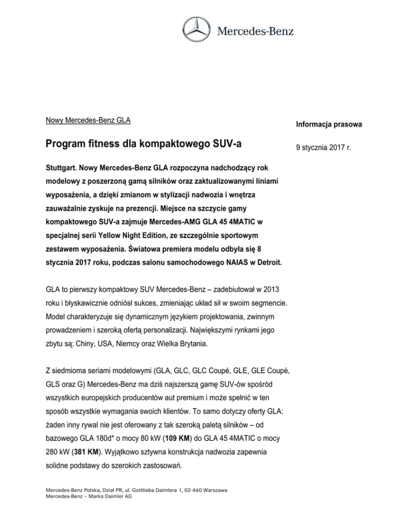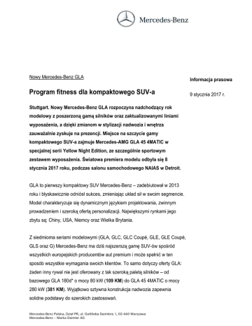 Nowy Mercedes-Benz GLA Program fitness dla kompaktowego SUV-a Stuttgart. Nowy Mercedes-Benz GLA rozpoczyna nadchodzący rok modelowy z poszerzoną gamą silników oraz zaktualizowanymi liniami wyposażenia, a dzięki zmianom w stylizacji nadwozia i wnętrza zauważalnie zyskuje na prezencji. Miejsce na szczycie gamy kompaktowego SUV-a zajmuje Mercedes-AMG GLA 45 4MATIC w specjalnej serii Yellow Night Edition, ze szczególnie sportowym zestawem wyposażenia. Światowa premiera modelu odbyła się 8 stycznia 2017 roku, podczas salonu samochodowego NAIAS w Detroit. GLA to pierwszy kompaktowy SUV Mercedes-Benz – zadebiutował w 2013 roku i błyskawicznie odniósł sukces, zmieniając układ sił w swoim segmencie. Model charakteryzuje się dynamicznym językiem projektowania, zwinnym prowadzeniem i szeroką ofertą personalizacji. Największymi rynkami jego zbytu są: Chiny, USA, Niemcy oraz Wielka Brytania. Z siedmioma seriami modelowymi (GLA, GLC, GLC Coupé, GLE, GLE Coupé, GLS oraz G) Mercedes-Benz ma dziś najszerszą gamę SUV-ów spośród wszystkich europejskich producentów aut premium i może spełnić w ten sposób wszystkie wymagania swoich klientów. To samo dotyczy oferty GLA: żaden inny rywal nie jest oferowany z tak szeroką paletą silników – od bazowego GLA 180d* o mocy 80 kW (109 KM) do GLA 45 4MATIC o mocy 280 kW (381 KM). Wyjątkowo sztywna konstrukcja nadwozia zapewnia solidne podstawy do szerokich zastosowań. Mercedes-Benz Polska, Dział PR, ul. Gottlieba Daimlera 1, 02-460 Warszawa Mercedes-Benz – Marka Daimler AG Informacja prasowa 9 stycznia 2017 r. Strona 2 * średnie zużycie paliwa: 3,9-7,4 l/100 km. Średnia emisja CO2: 103-172 g/km GLA to jedyny w swoim segmencie model oferowany z elementami wyposażenia z zakresu komfortu i bezpieczeństwa takimi jak kamera 360 stopni albo dostęp HANDS-FREE ACCESS. Nowością w gamie silnikowej jest benzynowy wariant GLA 220 4MATIC* o mocy 135 kW (184 KM) i 300 Nm maksymalnego momentu obrotowego, wypełniający lukę pomiędzy wersjami o mocach 115 kW (156 KM) oraz 155 kW (211 KM). Atrakcyjna oferta cenowa, sprzedaż rozpoczyna się 9 stycznia 2017 r. Sprzedaż nowego Mercedesa GLA rozpoczyna się 9 stycznia 2017 roku. W Niemczech ceny modelu startują od 124 300 PLN euro za odmianę GLA 180*. Topowy Mercedes-AMG GLA 45 4MATIC jest oferowany od 252 600 PLN. Wersje benzynowe* GLA 180 124 300 PLN GLA 200 128 000 PLN GLA 220 4MATIC 152 600 PLN GLA 250 146 100 PLN GLA 250 4MATIC 163 500 PLN Mercedes-AMG GLA 45 4MATIC 252 600 PLN Wersje wysokoprężne* GLA 200d 150 400 PLN GLA 200d 4MATIC 168 800 PLN Mercedes-Benz Polska, Dział PR, ul. Gottlieba Daimlera 1, 02-460 Warszawa Mercedes-Benz – Marka Daimler AG Strona 3 GLA 220d 169 900 PLN GLA 220d 4MATIC 179 600 PLN (wszystkie kwoty to sugerowane ceny detaliczne na rynku niemieckim z 23% VAT) Gwarancja sukcesu: ekspresyjny design i wydajność techniczna Ekspresyjny design z wyraźnym naciskiem na cechy SUV-ów pozostaje najważniejszym dla większości klientów powodem wyboru GLA – wespół z jego parametrami technicznymi. Nabywcy mają do wyboru trzy warianty podwozia. Standardowo GLA otrzymuje zawieszenie komfortowe; na życzenie oferowane jest też zawieszenie obniżone (w połączeniu z Linią AMG albo pakietem Dynamic Handling) lub komfortowe zawieszenie off-roadowe z prześwitem zwiększonym o 30 mm, które łączy większe zdolności terenowe z wyższą pozycją za kierownicą. GLA rocznik 2017 na pierwszy rzut oka charakteryzują elementy jeszcze mocniej akcentujące geny SUV-a: zmodyfikowane zderzaki, dodatkowe wzory obręczy z lekkich stopów oraz nowy atrakcyjny odcień „beż kanionu”. Miejsce montowanych wcześniej opcjonalnych reflektorów biksenonowych zajęły światła diodowe o temperaturze barwowej zbliżonej do światła dziennego. Wewnętrzny awans Jako jedyny model na rynku nowy GLA oferuje kamerę 360 stopni – a w zasadzie zespół kamer, które pozwalają obserwować otoczenie samochodu na ekranie w jednym z siedmiu różnych widoków. Jest wśród nich widok auta Mercedes-Benz Polska, Dział PR, ul. Gottlieba Daimlera 1, 02-460 Warszawa Mercedes-Benz – Marka Daimler AG Strona 4 z lotu ptaka, generowany na podstawie obrazu z czterech kamer: przedniej, cofania oraz dwóch w bocznych lusterkach. Atrakcyjnie stylizowane wnętrze GLA, starannie zmontowane i wykończone materiałami wysokiej jakości, wzbogacono o nowe obicia foteli, kolejne elementy ozdobne oraz chromowane akcenty na panelach obsługi. Smukły i czytelny, wolnostojący wyświetlacz multimediów o przekątnej 8" sąsiaduje z nowymi wskaźnikami z czerwonymi wskazówkami. Przełączniki elektrycznego sterowania foteli na drzwiach zyskały drobne, acz efektowne detale w kolorze srebrnego chromu. Chromowana ramka otacza również schowek na konsoli środkowej, a pierścienie wokół otworów wentylacyjnych mają jeszcze bardziej wyrazistą formę – co dodatkowo podkreśla charakter SUV-a w kabinie GLA. Przywiązanie do szczegółu odzwierciedlają również nowe pokrycia foteli dla linii wyposażenia i stylizacji Style oraz Urban. Nowe są odcienie tapicerki, takie jak mieszanka sztucznej skóry ARTICO i tkaniny Macápá w kolorach czarny/żółta ochra, beż sahary albo czarny plus (linia Style) oraz krystaliczna szarość lub czerń (linii Urban). Nowa oferta, jeszcze większa różnorodność Luksusowy pakiet Exclusive uzupełnia dostępny wcześniej pakiet Exclusive o luksusowe fotele z charakterystyczną dla SUV-ów czarną skórą o wyglądzie skóry bawolej. Do wyboru są tu elementy wykończenia z aluminium o trapezowym ziarnie, beżowego drewna topoli z satynowym wykończeniem lub lśniącego drewna orzechowego. Szczególnie ekskluzywne jest matowe, czarne drewno jesionowe lub panele ozdobne AMG z włókien węglowych. Mercedes-Benz Polska, Dział PR, ul. Gottlieba Daimlera 1, 02-460 Warszawa Mercedes-Benz – Marka Daimler AG Strona 5 Na liście opcji pozostaje pakie