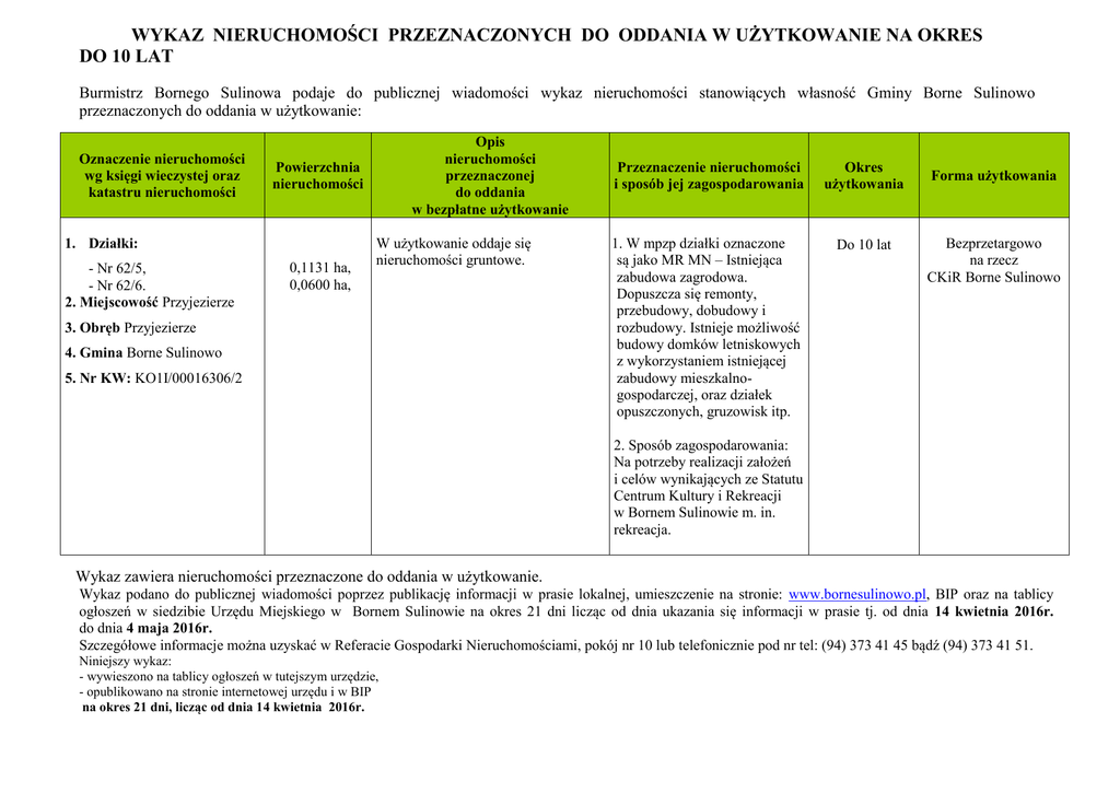 WYKAZ NIERUCHOMOŚCI PRZEZNACZONYCH DO ODDANIA W UŻYTKOWANIE NA OKRES DO 10 LAT Burmistrz Bornego Sulinowa podaje do publicznej wiadomości wykaz nieruchomości stanowiących własność Gminy Borne Sulinowo przeznaczonych do oddania w użytkowanie: Oznaczenie nieruchomości wg księgi wieczystej oraz katastru nieruchomości Powierzchnia nieruchomości 1. Działki: - Nr 62/5, - Nr 62/6. 2. Miejscowość Przyjezierze Opis nieruchomości przeznaczonej do oddania w bezpłatne użytkowanie 0,1131 ha, 0,0600 ha, W użytkowanie oddaje się nieruchomości gruntowe. 3. Obręb Przyjezierze 4. Gmina Borne Sulinowo 5. Nr KW: KO1I/00016306/2 Przeznaczenie nieruchomości i sposób jej zagospodarowania Okres użytkowania 1. W mpzp działki oznaczone są jako MR MN – Istniejąca zabudowa zagrodowa. Dopuszcza się remonty, przebudowy, dobudowy i rozbudowy. Istnieje możliwość budowy domków letniskowych z wykorzystaniem istniejącej zabudowy mieszkalnogospodarczej, oraz działek opuszczonych, gruzowisk itp. Do 10 lat Forma użytkowania Bezprzetargowo na rzecz CKiR Borne Sulinowo 2. Sposób zagospodarowania: Na potrzeby realizacji założeń i celów wynikających ze Statutu Centrum Kultury i Rekreacji w Bornem Sulinowie m. in. rekreacja. Wykaz zawiera nieruchomości przeznaczone do oddania w użytkowanie. Wykaz podano do publicznej wiadomości poprzez publikację informacji w prasie lokalnej, umieszczenie na stronie: www.bornesulinowo.pl, BIP oraz na tablicy ogłoszeń w siedzibie Urzędu Miejskiego w Bornem Sulinowie na okres 21 dni licząc od dnia ukazania się informacji w prasie tj. od dnia 14 kwietnia 2016r. do dnia 4 maja 2016r. Szczegółowe informacje można uzyskać w Referacie Gospodarki Nieruchomościami, pokój nr 10 lub telefonicznie pod nr tel: (94) 373 41 45 bądź (94) 373 41 51. Niniejszy wykaz: - wywieszono na tablicy ogłoszeń w tutejszym urzędzie, - opublikowano na stronie internetowej urzędu i w BIP na okres 21 dni, licząc od dnia 14 kwietnia 2016r.
