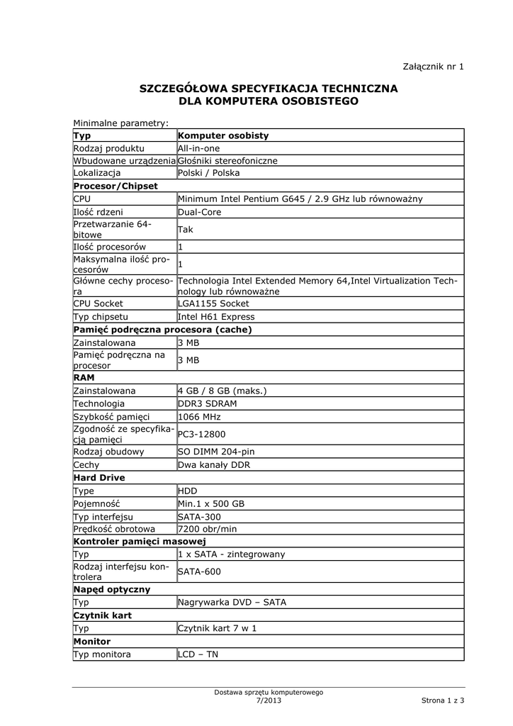 Załącznik nr 1 SZCZEGÓŁOWA SPECYFIKACJA TECHNICZNA DLA KOMPUTERA OSOBISTEGO Minimalne parametry: Typ Komputer osobisty Rodzaj produktu All-in-one Wbudowane urządzenia Głośniki stereofoniczne Lokalizacja Polski / Polska Procesor/Chipset CPU Minimum Intel Pentium G645 / 2.9 GHz lub równoważny Ilość rdzeni Przetwarzanie 64bitowe Ilość procesorów Maksymalna ilość procesorów Główne cechy procesora CPU Socket Dual-Core Typ chipsetu Tak 1 1 Technologia Intel Extended Memory 64,Intel Virtualization Technology lub równoważne LGA1155 Socket Intel H61 Express Pamięć podręczna procesora (cache) Zainstalowana Pamięć podręczna na procesor RAM 3 MB 3 MB Zainstalowana 4 GB / 8 GB (maks.) Technologia DDR3 SDRAM Szybkość pamięci 1066 MHz Zgodność ze specyfikaPC3-12800 cją pamięci Rodzaj obudowy SO DIMM 204-pin Cechy Dwa kanały DDR Hard Drive Type HDD Pojemność Min.1 x 500 GB Typ interfejsu SATA-300 Prędkość obrotowa 7200 obr/min Kontroler pamięci masowej Typ 1 x SATA - zintegrowany Rodzaj interfejsu konSATA-600 trolera Napęd optyczny Typ Nagrywarka DVD – SATA Czytnik kart Typ Czytnik kart 7 w 1 Monitor Typ monitora LCD – TN Dostawa sprzętu komputerowego 7/2013 Strona 1 z 3 Wielkość przekątnej Rozdzielczość natywna Kontrast Wyświetlacz szerokoekranowy Współczynnik kształtu obrazu Czas reakcji Rodzaj podświetlenia matrycy Jasność obrazu Cechy monitora Min. 20" 1600 x 900 (HD+) 1000:1 (dynamiczny) Tak 16:9 5 ms LED 250 cd/m2 Przeciwoślepieniowy Sterownik grafiki Typ Zintegrowany Graphics Processor Intel HD Graphics Złącza VIDEO VGA,HDMI Maksymalna ilość ob2 sługiwanych monitorów Wyjście sygnału audio Typ Tryb wyjścia dźwięku Zgodność z normami Głośnik(i) Zintegrowany Stereo High Definition Audio 2 x kanał prawy/lewy Aparat fotograficzny Obudowa Zintegrowany Sensor Resolution 0,3 megapiksele Urządzenie wejściowe Typ Mysz, klawiatura Wejście sygnału audio Typ Mikrofon Praca w sieci Karta sieciowa Realtek RTL8111E-VB Obsługa sieci bezprzeTak wodowej LAN Bezprzewodowa karta Intel Centrino Wireless-N 2230 NIC Ethernet, Fast Ethernet, Gigabit Ethernet, IEEE 802.11b, IEEE Obsługiwane protokoły 802.11g, IEEE 802.11n Rozszerzenie/połączenie 6 x USB 2.0 (2 z przodu, 4 z tyłu) 1 x VGA 1 x LAN Interfejsy 1 x mikrofon (1 z przodu) 1 x słuchawki (1 z przodu) 1 x HDMI Różne Cechy Zgodność z normami Slot blokady bezpieczeństwa UL, VCCI, C-Tick, BSMI, GOST, cUL, DEMKO, GS, SASO, CB, CCC, PSB, FCC, JEIDA, RoHS, IEC 60950-1, WEEE, J-MOSS, Kvalitet, KUCAS, SONCAP, KEBS Zasilanie Dostawa sprzętu komputerowego 7/2013 Strona 2 z 3 Wymagane napięcie Moc wyjściowa AC 120/230 V (50/60 Hz) 150 wat System operacyjny / Oprogramowanie Dołączony system opeMicrosoft Windows 8 Pro racyjny Oprogramowanie pozoOprogramowanie wspomagające dla realizacji wideokonferencji stałe Standardy ochrony środowiska ENERGY STAR Tak Gwarancja producenta Obsługa i wsparcie 3 lata gwarancji Wymiary i waga (maksymalnie) Szerokość 51.5cm Głębokość 7.3 cm Wysokość 41 cm Waga 7.9 kg Parametry środowiska Minimalna temperatura 10 °C pracy Maksymalna tempera35 °C tura pracy Możliwość ustawienia kąta pracy w min 2 pozycjach. Maksymalny Inne kąt nachylenia komputera 33 stopnie Bluetooth min. v.4.0 Wbudowana kamera min. 2 megapixel Możliwość składowanie plików poza komputerem wraz z dostępem do nich z innych urządzeń. Oprogramowanie winno synchronizować zawartość katalogów. Minimalna wielkość przestrzeni zewnętrznej dla stanowiska 5GB, oprogramowanie kliencie dla wymaganej wersji oprogramowania systemowego certyfikowane przez producenta lub za jego pośrednictwem udostępnione. Możliwość wykonywania okresowych przeglądów licencji w sposób zautomatyzowany pozwalający na uzyskanie informacji o zainstalowanym oprogramowaniu na komputerze. Oprogramowanie musi mieć możliwość wykonania operacji przy użyciu dedykowanego agenta jak również bez konieczności jego instalacji. Oprogramowanie musi dodatkowo umożliwiać uzyskanie informacji na temat podłączonych dysków sieciowych, dysków typu USB. Oprogramowanie musi umożliwiać porównywanie wyników dla danej stacji w różnych odstępach czasu. Zainstalowane oprogramowanie umożliwiające przygotowanie zbiorczego zestawienia konfiguracji stanowiska i ich eksportu do programu MS EXCEL lub kompatybilnym. Dostawa sprzętu komputerowego 7/2013 Strona 3 z 3