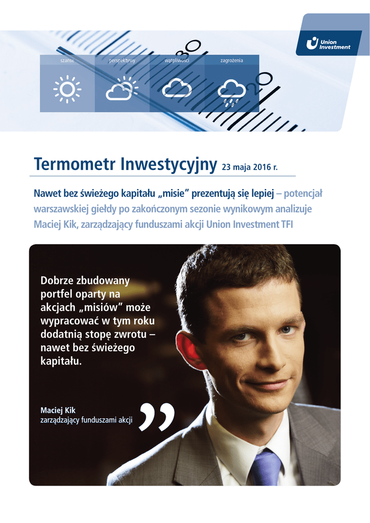 Termometr Inwestycyjny 23 maja 2016 r. Nawet bez świeżego kapitału „misie” prezentują się lepiej – potencjał warszawskiej giełdy po zakończonym sezonie wynikowym analizuje Maciej Kik, zarządzający funduszami akcji Union Investment TFI Dobrze zbudowany portfel oparty na akcjach „misiów” może wypracować w tym roku dodatnią stopę zwrotu – nawet bez świeżego kapitału. Maciej Kik zarządzający funduszami akcji Niedawno zakończył się sezon publikacji wyników spółek za I kwartał 2016 r. Jak w skrócie można go podsumować? Wyniki największych spółek okazały się poniżej oczekiwań. Zarówno przychody, jak i zyski blue chipów spadły o kilkanaście procent. Na tym tle wyróżniły się małe i średnie spółki z indeksu mWIG80 i sWIG80, które poprawiły swoje zyski średnio o 20%. Jakie spółki i segmenty rynku wyróżniły się in plus, a jakie in minus? Z jednej strony bardzo słabo wypadły wyniki banków i spółek energetycznych, które w głównej mierze stały za wspomnianymi spadkami zysków blue chipów, z drugiej strony pozytywnie zaskoczyli eksporterzy i to zarówno z sektora przemysłowego (Alumetal, Wielton, ZETKAMA, Kęty), jak i innych sektorów (CD PROJEKT, CI Games czy AmRest). Po pierwszym kwartale pewne jest to, że ponownie zarysowuje się przewaga na korzyść małych spółek. I to właśnie ten segment cały czas obstawiamy jako najbardziej perspektywiczny z inwestycyjnego punktu widzenia. Czy mówimy o silnym czy o relatywnym – na tle dużych spółek – potencjale „misiów”? W obecnych warunkach niestety trudno oczekiwać silnej hossy i to pomimo niezłych fundamentów. Kluczowym problemem polskich „misiów” jest negatywny globalny sentyment. Inwestorów niepokoi m.in. ryzyko opuszczenia Unii Europejskiej przez Wielką Brytanię. Nie pomogły także decyzje podjęte na kwietniowym posiedzeniu amerykańskiej Rezerwy Federalnej. Fed napędził rynkom strachu zapowiedziami podwyżek stóp procentowych w USA nawet w czerwcu, gdyby scenariusz Brexitu się nie zrealizował. Niesprzyjający klimat inwestycyjny skutkuje brakiem napływu kapitału do akcji. A to warunek konieczny, żebyśmy z funduszu małych i średnich spółek mogli osiągnąć dwucyfrowe stopy zwrotu. Warto jednocześnie zauważyć, że dobrze zbudowany portfel oparty na akcjach „misiów” może wypracować w tym roku dodatnią stopę zwrotu – nawet bez świeżego kapitału. Nawet w takim otoczeniu rynkowym? O ile otoczenie drastycznie się nie pogorszy, to tak. Małe i średnie spółki nie są narażone na ryzyko polityczne (lub tylko w ograniczonym stopniu) i można wśród nich znaleźć sporo perspektywicznych i atrakcyjnie wycenionych firm. Powinna je też wspierać wciąż dobra kondycja polskiej gospodarki. W drugiej połowie roku PKB w Polsce powinno rosnąć szybciej, stymulowane impulsem w postaci programu „Rodzina 500 plus”. Większa konsumpcja zdecydowanie szybciej przełoży się na poprawę zysków mniejszych firm. W dalszej części roku powinniśmy też obserwować lepsze zachowanie spółek eksportowych – głównie za sprawą osłabienia złotego. Masz pytania? 800 567 662 (22) 449 03 33 (od poniedziałku do piątku, od 8.00 do 18.00) [email protected] www.doradcy.unionklub.pl