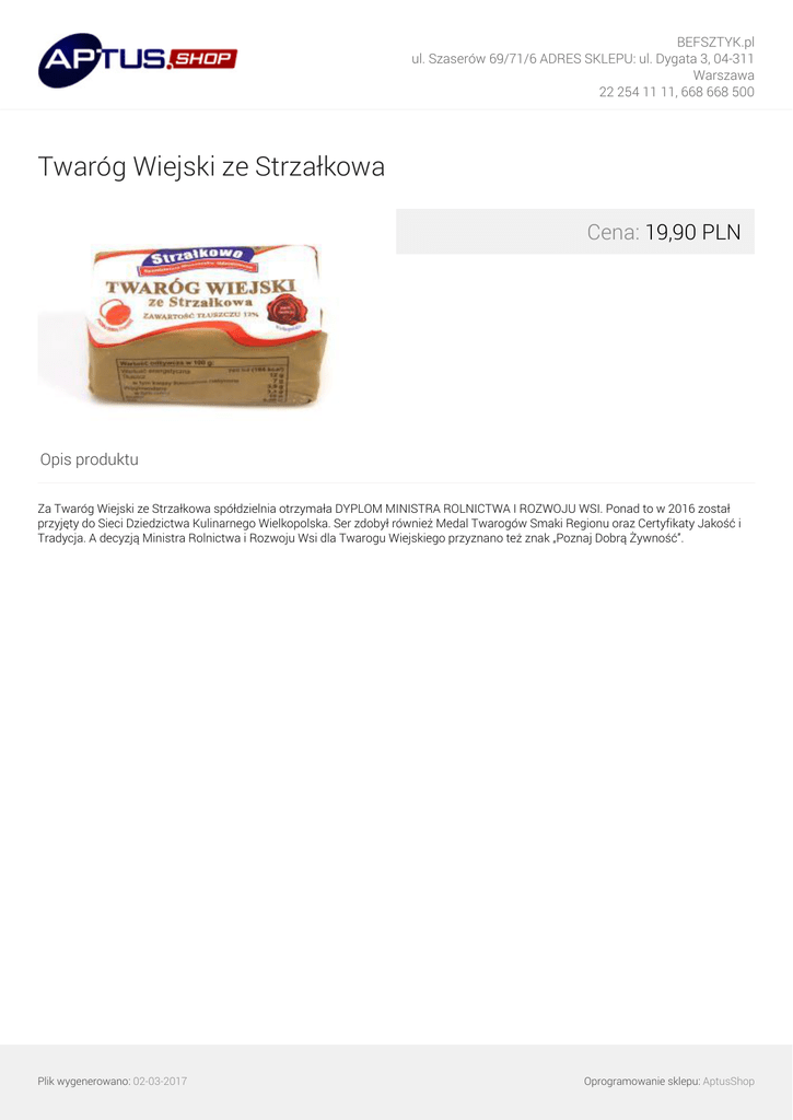 BEFSZTYK.pl ul. Szaserów 69/71/6 ADRES SKLEPU: ul. Dygata 3, 04-311 Warszawa 22 254 11 11, 668 668 500 Twaróg Wiejski ze Strzałkowa Cena: 19,90 PLN Opis produktu Za Twaróg Wiejski ze Strzałkowa spółdzielnia otrzymała DYPLOM MINISTRA ROLNICTWA I ROZWOJU WSI. Ponad to w 2016 został przyjęty do Sieci Dziedzictwa Kulinarnego Wielkopolska. Ser zdobył również Medal Twarogów Smaki Regionu oraz Certyfikaty Jakość i Tradycja. A decyzją Ministra Rolnictwa i Rozwoju Wsi dla Twarogu Wiejskiego przyznano też znak „Poznaj Dobrą Żywność”. Plik wygenerowano: 02-03-2017 Powered by TCPDF (www.tcpdf.org) Oprogramowanie sklepu: AptusShop