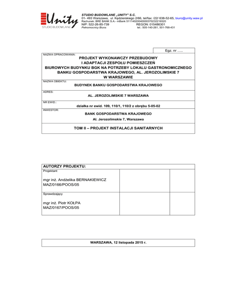 projekt wykonawczy przebudowy i adaptacji zespołu