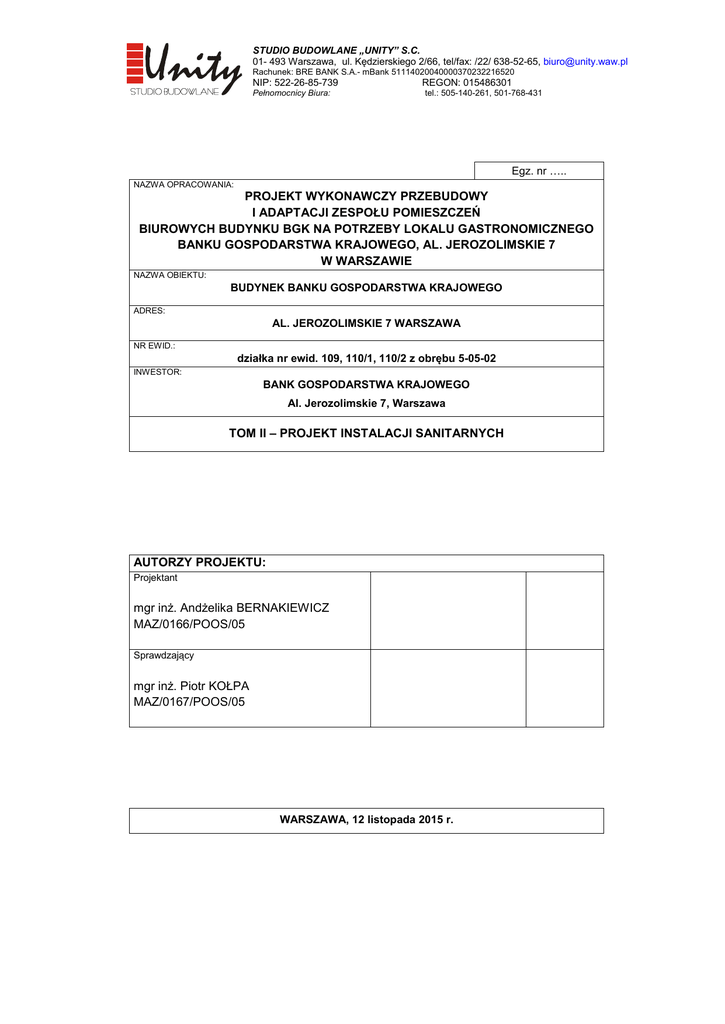 STUDIO BUDOWLANE „UNITY” S.C. 01- 493 Warszawa, ul. Kędzierskiego 2/66, tel/fax: /22/ 638-52-65, [email protected] Rachunek: BRE BANK S.A.- mBank 51114020040000370232216520 NIP: 522-26-85-739 Pełnomocnicy Biura: REGON: 015486301 tel.: 505-140-261, 501-768-431 Egz. nr ….. NAZWA OPRACOWANIA: PROJEKT WYKONAWCZY PRZEBUDOWY I ADAPTACJI ZESPOŁU POMIESZCZEŃ BIUROWYCH BUDYNKU BGK NA POTRZEBY LOKALU GASTRONOMICZNEGO BANKU GOSPODARSTWA KRAJOWEGO, AL. JEROZOLIMSKIE 7 W WARSZAWIE NAZWA OBIEKTU: BUDYNEK BANKU GOSPODARSTWA KRAJOWEGO ADRES: AL. JEROZOLIMSKIE 7 WARSZAWA NR EWID.: działka nr ewid. 109, 110/1, 110/2 z obrębu 5-05-02 INWESTOR: BANK GOSPODARSTWA KRAJOWEGO Al. Jerozolimskie 7, Warszawa TOM II – PROJEKT INSTALACJI SANITARNYCH AUTORZY PROJEKTU: Projektant mgr inż. Andżelika BERNAKIEWICZ MAZ/0166/POOS/05 Sprawdzający mgr inż. Piotr KOŁPA MAZ/0167/POOS/05 WARSZAWA, 12 listopada 2015 r. ZAWARTOŚĆ OPRACOWANIA 1. Opis techniczny do projektu 2. Oświadczenie projektanta i sprawdzającego poprawności i kompletności opracowania 3. Uprawnienia projektanta i sprawdzającego wraz z zaświadczeniem o przynależności do Izby Inżynierów 4. Rysunki SPIS TREŚCI 1. 2. 3. 4. 5. 6. 7. 8. 9. 10. 11. 12. 13. Podstawa opracowania Cel i zakres opracowania Charakterystyka obiektu Instalacja wod-kan Instalacja wentylacji Instalacja klimatyzacji Instalacja odprowadzenia skroplin Instalacja c.o. i c.t. B.H.P. i p.poż. Wytyczne dla branż Uwagi końcowe Oświadczenie Uprawnienia SPIS RYSUNKÓW 1. 2. 3. 4. 5. 6. 7. 8. 9. 10. 11. 12. 13. 14. 15. 16. 17. 18. 19. 20. 21. 22. Rzut poziomu -2 – instalacja wod-kan Rzut poziomu -1 – instalacja wod-kan Rzut parteru – instalacja wod-kan Rzut III piętra – instalacja wod-kan Rzut IV piętra – instalacja wod-kan Rzut V piętra – instalacja wod-kan Rzut dachu – instalacja wod-kan Schemat kanalizacji Schemat instalacji wodociągowej Rzut IV piętra – Instalacja went. mech Rzut poddasza – Instalacja went. mech Rzut dachu – Instalacja went. mech Pom. separatora – Instalacja went. mech Przekrój A-A – Instalacja went. mech Przekrój B-B – Instalacja went. mech Przekrój C-C – Instalacja went. mech Rzut poziomu -2 – Instalacja c.o. i klimatyzacji Rzut IV piętra – Instalacja c.o. i klimatyzacji Rzut poddasza – Instalacja c.o. i klimatyzacji Rzut dachu – Instalacja c.o. i klimatyzacji Schemat instalacji C.T. Schemat instalacji C.O. skala 1:100 skala 1:100 skala 1:100 skala 1:100 skala 1:100 skala 1:100 skala 1:100 skala * : * skala * : * skala 1:50 skala 1:50 skala 1:50 skala 1:50 skala 1:50 skala 1:50 skala 1:50 skala 1:100 skala 1:100 skala 1:100 skala 1:100 skala *:* skala *:* Rys. WK – 1 Rys. WK – 2 Rys. WK – 3 Rys. WK – 4 Rys. WK – 5 Rys. WK – 6 Rys. WK – 7 Rys. WK – 8 Rys. WK – 9 Rys. WENT – 1 Rys. WENT – 2 Rys. WENT – 3 Rys. WENT – 4 Rys. WENT – 5 Rys. WENT – 6 Rys. WENT – 7 Rys. GCH – 1 Rys. GCH – 2 Rys. GCH – 3 Rys. GCH – 4 Rys. GCH – 5 Rys. GCH – 6 2 OPIS TECHNICZNY DO PROJEKTU WYKONAWCZEGO PRZEBUDOWY I ADAPTACJI ZESPOŁU POMIESZCZEŃ BIUROWYCH BUDYNKU BGK NA POTRZEBY LOKALU GASTRONOMICZNEGO BANKU GOSPODARSTWA KRAJOWEGO, AL. JEROZOLIMSKIE 7 W WARSZAWIE 1. Podstawa opracowania Podstawę opracowania stanowią: - Umowa z Inwestorem Podkłady architektoniczne Projekt technologiczny Wizja lokalna Obowiązujące normy i przepisy o Prawo Budowlane (tj. Dz. U. poz. 1409 z 2013 r.) o rozporządzenie Ministra Infrastruktury z dnia 12 kwietnia 2002 r w sprawie warunków technicznych jakim powinny odpowiadać budynki i ich usytuowanie (Dz.U. nr 75, poz. 690 z 2002 r z póź. zmianami); o Rozporządzenie Ministra Transprtu, Budownictwa i Gospodarki Morskiej z dnia 25 kwietnia 2012 r. w sprawie szczegółowego zakresu i formy projektu budowlanego (Dz. U. z 2012 r., poz. 462 ze zm. Poz. 762 z 2013 r.); 2. Cel i zakres opracowania Celem opracowania jest projekt instalacji wod-kan, wentylacji mechanicznej, centralnego ogrzewania, ciepła technologicznego zasalania nagrzewnicy wodnej centrali wentylacyjnej i klimatyzacji dla remontowanych pomieszczeń w budynku BGK w Warszawie przy Al. Jerozolimskich 7 w Warszawie. Zakres opracowania obejmuje: Instalacje wod-kan Instalację wentylacji mechanicznej Instalację centralnego ogrzewania Instalację ciepła technologicznego Instalację klimatyzacji 3. Charakterystyka obiektu Szczegółowa charakterystyka obiektu zgodnie z częścią architektoniczno – budowlaną – równoległe opracowanie. 4. Instalacje wod-kan INSTALACJA WODOCIĄGOWA Projektuje się instalację wodociągową zasilaną z istniejących poziomów wodociągowych zamontowanych pod stropem piwnicy – poziom -1. Lokalizacja i średnice istniejących rurociągów zgodnie z graficzną częścią opracowania. Poziomy i piony projektowanej instalacji wykonać z rur PP PN 20 produkcji Wavin lub równoważne. Przewody wody ciepłej i cyrkulacji muszą posiadać stabilizujące perforowane wkładki aluminiowe. Przewody instalacji hydrantowych wykonać z rur stalowych podwójnie ocynkowanych. Zasilanie projektowanego hydrantu z istniejącej instalacji hydrantowej (z przewodu DN 100 ułożonego na poziomie -1). Hydrant montować w typowej szafce naściennej uniwersalnej 3 HP-25 wyposażonej w 30 m wąż półsztywny. Hydrant montować na poziomie 1,35 +/- 10 cm od poziomu posadzki po wykończeniu. Zasilanie zaplecza gastronomicznego zaprojektowano w istniejącym szachcie, który znajduje się bezpośrednio przy projektowanej windzie. Ponadto aktualnie w miejscu projektowanej szatni z toaletą jest toaleta, wiec zasilanie zaaportowano z istniejącego pionu. Jako regulację instalacji cyrkulacji ciepłej wody przewidziano montaż zaworów firmy OVENTROP AQUASTORM T PLUS 3 lub równoważnych. Zastosowane zawory posiadają zarówno regulację termiczną (w zależności od temperatury przepływającego czynnika) jak i hydrauliczną (nastawa wstępna) oraz możliwość przeprowadzenia przegrzewu i