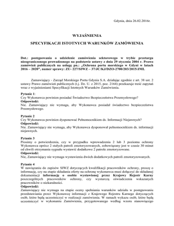 Gdynia, dnia 26.02.2016r. WYJAŚNIENIA SPECYFIKACJI ISTOTNYCH WARUNKÓW ZAMÓWIENIA Dot.: postępowania o udzielenie zamówienia sektorowego w trybie przetargu nieograniczonego prowadzonego na podstawie ustawy z dnia 29 stycznia 2004 r. Prawo zamówień publicznych na usługę pn.: „Ochrona portu morskiego w Gdyni w latach 2016 – 2020”, numer sprawy: ZU- 227/SIWZ – 37/JC/KJ/DZO-2700/203/2015/JML Zamawiający - Zarząd Morskiego Portu Gdynia S.A. działając zgodnie z art. 38 ust. 2 ustawy Prawo zamówień publicznych (t.j. Dz. U. z 2015, poz. 2164) przekazuje treść zapytań wraz z wyjaśnieniami Specyfikacji Istotnych Warunków Zamówienia. Pytanie 1: Czy Wykonawca powinien posiadać Świadectwo Bezpieczeństwa Przemysłowego? Odpowiedź: Nie. Zamawiający nie wymaga, aby Wykonawca posiadał świadectwo bezpieczeństwa Przemysłowego. Pytanie 2 Czy Wykonawca powinien dysponować Pełnomocnikiem ds. Informacji Niejawnych? Odpowiedź: Nie. Zamawiający nie wymaga, aby Wykonawca dysponował pełnomocnikiem ds. informacji niejawnych. Pytanie 3 Prosimy o potwierdzenia, czy w przypadku wprowadzenia 2 lub 3 poziomu ochrony Wykonawca oprócz 2 stałych patroli zmotoryzowanych, zobowiązany jest w czasie 30 minut od chwili otrzymania sygnału wystawić dodatkowe 2 patrole zmotoryzowane. Odpowiedź: Nie, Zamawiający nie wymaga wystawienia dwóch dodatkowych patroli zmotoryzowanych. Pytanie 4 W nawiązaniu do zapisów SIWZ dotyczących kwalifikacji pracowników ochrony, proszę o informację, czy na etapie składania oferty na ochronę wykonawca musi dołączyć do składanej dokumentacji informację o osobie wystawionej przez Krajowy Rejestr Karny poszczególnych pracowników ochrony, czy wystarczą oświadczenia wskazanych pracowników o niekaralności. Odpowiedź: Zamawiający nie wymaga na etapie oceny spełniania warunków udziału w postępowaniu przedstawiania przez Wykonawcę informacji z Krajowego Rejestru Karnego dotyczących osób, które będą uczestniczyć w realizacji zamówienia. W ramach wykazu osób, które będą uczestniczyć w wykonaniu Zamówienia, przygotowanego według wzoru stanowiącego załącznik nr 5 do SIWZ, Wykonawca powinien wskazać, że wymagane osoby nie zostały skazane prawomocnym orzeczeniem za przestępstwo umyślne. Pytanie 5 Na podstawie art. 38 ust. 1 ustawy Prawo zamówień publicznych proszę o jednoznaczne wskazanie czy w celu wykazania spełniania skonkretyzowanego warunku potencjału osobowego wystarczy wykazanie osób, które odbyły skrócone – ok. 6 godzinne przeszkolenie w zakresie Międzynarodowego Kodeksu Ochrony Statku i Obiektu Portowego (ISPS CODE) czy też konieczne jest wykazanie osób, które odbyły 3-dniowe szkolenie na Oficera Ochrony Obiektu Portowego. Jednoznaczne doprecyzowanie jest niezbędne w celu złożenia porównywalnych ofert, bowiem wskazane szkolenia istotnie różnią się zarówno zakresem przekazanych uczestnikom informacji jak i ceną. Odpowiedź: Patrz punkt III oraz punkt VI Zmian SIWZ z dnia 15.02.2016 r. Wykaz, o którym mowa w Rozdziale XVIII ust. 9 pkt 4) SIWZ winien uwzględniać w wymaganym zakresie osoby, które odbyły co najmniej skrócone – ok. 6 godzinne przeszkolenie w zakresie Międzynarodowego Kodeksu Ochrony Statku i Obiektu Portowego (ISPS CODE). Pytanie 6 Które posterunki mają być wyposażone w broń. Odpowiedź: Do posiadania broni zobowiązani są dowódcy zmian, obsada patroli zmotoryzowanych oraz personel obsługujący stację monitorowania alarmów (SSWIN) oraz monitoringu wizyjnego. Pytanie 7 Czy zamawiający udostępni Wykonawcy pomieszczenie magazynu broni oraz jego wyposażenie bez dodatkowych kosztów. Odpowiedź: Tak. Zamawiający udostępni Wykonawcy pomieszczenie magazynu broni oraz jego wyposażenie bez dodatkowych kosztów. Pytanie 8 Czy możliwe jest (czy się zdarza) aby statki zawinęły jednocześnie do trzech Nabrzeży Francuskiego, Polskiego i Pomorskiego (dot. wystawienia posterunków, patroli ). Odpowiedź: Tak, zdarza się to bardzo rzadko - maksymalnie 1 – 2 razy w roku. W 2016 r. nie przewiduje się takiej sytuacji. Zamawiający nie dysponuje danymi dotyczącymi kolejnych lat. Pytanie 9 W opisie przedmiotu zamówienia w tabeli posterunków ochronnych wymieniono posterunki doraźne przy ul. Celnej i ul. Polskiej, co to za posterunki, którzy pracownicy mogą być na nie wyznaczeni tj. czy ze składu zmiany (z innych posterunków), czy warunkowo z patrolu zmotoryzowanego, czy też bezwzględnie skierowanie nowych pracowników z zewnątrz. Odpowiedź: Do obsługi tych posterunków mogą być kierowani wartownicy ze składu zmiany. Pytanie 10 Przewidywane jest 60 zawinięć statków rocznie do nabrzeży czy zatem, Wykonawca ma planować pełne składy na Francuskie, Polskie, Pomorskie jednocześnie po 9 godzin, jeśli nie jak rozkładają się te zawinięcia na poszczególne nabrzeża celem prawidłowego zaplanowania godzin pracy w nabrzeżach wg potrzeb. Ma to zasadniczy wpływ na cenę oferty dlatego wymaga jednoznacznego i wyczerpującego opisu. Odpowiedź: Zestawienie statków turystycznych, które zawiną do Portu Gdynia w roku 2016 znajduje się na stronie http://www.port.gdynia.pl/pl/wydarzenia/wycieczkowce. Wykonawca powinien zapewnić personel i zorganizować jego pracę w taki sposób, aby zabezpieczyć realizację wszystkich obowiązków wynikających z opisu przedmiotu zamówienia. Pytanie 11 Czy do zadań interwencyjnych monitorowania elektronicznego 22 lokalizacji mogą być wykorzystywane patrole zmotoryzowane funkcjonujące na obiekcie, czy to wyłącznie zadanie dla zewnętrznych grup interwencyjnych. Odpowiedź: Do zadań interwencyjnych w 22 lokalizacjach monitorowanych elektronicznie będą wykorzystywane patrole zmotoryzowane przewidziane w opisie przedmiotu zamówienia. ZMPG S.A. nie dopuszcza działania zewnętrznych grup interwencyjnych. Odpowiedzi na pytania w postępowaniu o udzielenie Zamówienia są dla Wykonawców wiążące i stanow