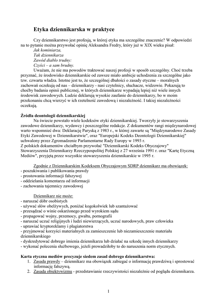 Etyka dziennikarska w praktyce Czy dziennikarstwo jest profesją, w której etyka ma szczególne znaczenie? W odpowiedzi na to pytanie moŜna przywołać opinię Aleksandra Fredry, który juŜ w XIX wieku pisał: Jak kominiarza, Tak dziennikarza Zawód diablo trudny: Czyści – a sam brudny. UwaŜam, Ŝe nie ma powodów traktować naszej profesji w sposób szczególny. Choć trzeba przyznać, Ŝe środowisko dziennikarskie od zawsze miało ambicje uchodzenia za szczególne jako tzw. czwarta władza. Istotne jest to, Ŝe szczególnej dbałości o zasady etyczne – moralnych zachowań oczekują od nas – dziennikarzy - nasi czytelnicy, słuchacze, widzowie. Pokazują to choćby badania opinii publicznej, w których dziennikarze wypadają lepiej niŜ wiele innych środowisk zawodowych. Ludzie deklarują wysokie zaufanie do dziennikarzy, bo w moim przekonaniu chcą wierzyć w ich rzetelność zawodową i niezaleŜność. I takiej niezaleŜności oczekują. Źródła deontologii dziennikarskiej Na świecie powstało wiele kodeksów etyki dziennikarskiej. Tworzyły je stowarzyszenia zawodowe dziennikarzy, wydawcy i poszczególne redakcje. Z dokumentów rangi międzynarodowej warto wspomnieć dwa: Deklarację Paryską z 1983 r., w której zawarte są "Międzynarodowe Zasady Etyki Zawodowej w Dziennikarstwie", oraz "Europejski Kodeks Deontologii Dziennikarskiej" uchwalony przez Zgromadzenie Parlamentarne Rady Europy w 1993 r. Z polskich dokumentów chciałbym przywołać "Dziennikarski Kodeks Obyczajowy" Stowarzyszenia Dziennikarzy Rzeczypospolitej Polskiej z 27 września 1991 r. oraz "Kartę Etyczną Mediów", przyjętą przez wszystkie stowarzyszenia dziennikarskie w 1995 r. Zgodnie z Dziennikarskim Kodeksem Obyczajowym SDRP dziennikarz ma obowiązek: - poszukiwania i publikowania prawdy - prostowania informacji fałszywej - oddzielania komentarza od informacji - zachowania tajemnicy zawodowej Dziennikarz nie moŜe: - naruszać dóbr osobistych - uŜywać słów obelŜywych, poniŜać kogokolwiek lub szantaŜować - przesądzać o winie oskarŜonego przed wyrokiem sądu - propagować wojny, przemocy, gwałtu, pornografii - naruszać uczuć religijnych i ludzi niewierzących, uczuć narodowych, praw człowieka - uprawiać kryptoreklamy i plagiatorstwa - przyjmować korzyści materialnych za zamieszczenie lub niezamieszczenie materiału dziennikarskiego - dyskredytować dobrego imienia dziennikarza lub działać na szkodę innych dziennikarzy - wykonać polecenia słuŜbowego, jeŜeli prowadziłoby to do naruszenia norm etycznych. Karta etyczna mediów precyzuje siedem zasad dobrego dziennikarstwa: 1. Zasada prawdy – dziennikarz ma obowiązek zabiegać o informację prawdziwą i sprostować informację fałszywą. 2. Zasada obiektywizmu - przedstawianie rzeczywistości niezaleŜnie od poglądu dziennikarza. 1 3. Zasada oddzielania informacji od komentarza – chodzi o moŜliwość odróŜniania przez odbiorcę faktów od opinii o nich. 4. Zasada uczciwości – dziennikarz działa zgodnie z własnym sumieniem, nie ulega wpływom, jest nieprzekupny. 5. Zasada szacunku i tolerancji - poszanowanie ludzkiej godności, praw, dóbr osobistych i prywatności. 6. Zasada pierwszeństwa dobra odbiorcy - interesy odbiorców są nadrzędne wobec interesów redakcji, dziennikarzy, wydawców. 7. Zasada wolności i odpowiedzialności za formę i treść przekazu - wolność nakłada na dziennikarzy i wydawców odpowiedzialność za konsekwencje wynikające z publikacji treści. PowaŜni wydawcy tworzą swoje wewnętrzne zasady wydawnicze i kodeksy etyczne. Wiele redakcji ma teŜ tzw. style book, czyli zasady tworzenia i publikacji materiałów dziennikarskich. To swego rodzaju redakcyjna „konstytucja”, normująca pracę redaktorów i dziennikarzy. Za wspólny mianownik wszystkich zbiorów dziennikarskich norm etycznych moŜemy uznać takie podstawowe kanony jak: niezaleŜność, rzetelność, uczciwość i wraŜliwość. NiezaleŜny dziennikarz: - jest bezstronny w tworzeniu i przekazywaniu materiałów prasowych - nie chroni i nie faworyzuje kogokolwiek, czy to wpływowych środowisk, czy rodziny i przyjaciół - jest nieprzekupny w dąŜeniu do prawdy, wolny od jakichkolwiek wpływów, nawet gdy pochodzą one od jego zwierzchnika w pracy - moŜe mieć poglądy polityczne, ale kierując się swoimi poglądami nie moŜe selekcjonować albo zniekształcać informacji - nie podejmuje się realizacji tematów, w które jest lub moŜe być zaangaŜowany osobiście, np. finansowo czy towarzysko. Rzetelny dziennikarz: - uwzględnia wszystkie istotne fakty dla opisywanej sprawy - nie opiera swoich relacji na jednym źródle i nie pokazuje tylko jednej strony medalu - stroni od złośliwych uwag na temat czyjegoś pochodzenia społecznego, miejsca zamieszkania, wyglądu, poglądów - unika słów i wyraŜeń nacechowanych emocjonalnie lub zawierających oceny (w tabloidach obserwujemy świadome granie na ludzkich emocjach). Uczciwy dziennikarz: - działa w sposób jawny i informuje rozmówcę, w jaki sposób jego informacja będzie wykorzystana - nie płaci za informacje i nie posługuje się szantaŜem - korzysta z ukrytego mikrofonu i kamery tylko w wyjątkowych przypadkach - przestrzega prawa do autoryzacji (zasada mocno dyskusyjna, ale wciąŜ w Polsce obowiązująca). WraŜliwy dziennikarz: - liczy się z ludzkimi uczuciami - bierze pod uwagę skutki, jakie wywoła przygotowywany przez niego materiał. Co przynosi nam Ŝycie 2 A oto przykłady publikacji i zachowań róŜnych zespołów redakcyjnych w konkretnych sytuacjach: Czy redakcja moŜe opublikować imię i nazwisko oraz zdjęcie świadka przestępstwa? Nie wolno publikować personaliów i fotografii pokrzywdzonych oraz świadków przestępstw (pkt 16. Dziennikarskiego Kodeksu Obyczajowego, art. 13 ust. 2 ustawy Prawo prasowe). Zdarza się jednak, Ŝe redakcje decydują się na takie publikacje, jeŜeli świadek wyrazi na to zgodę. Nawet jeśli t