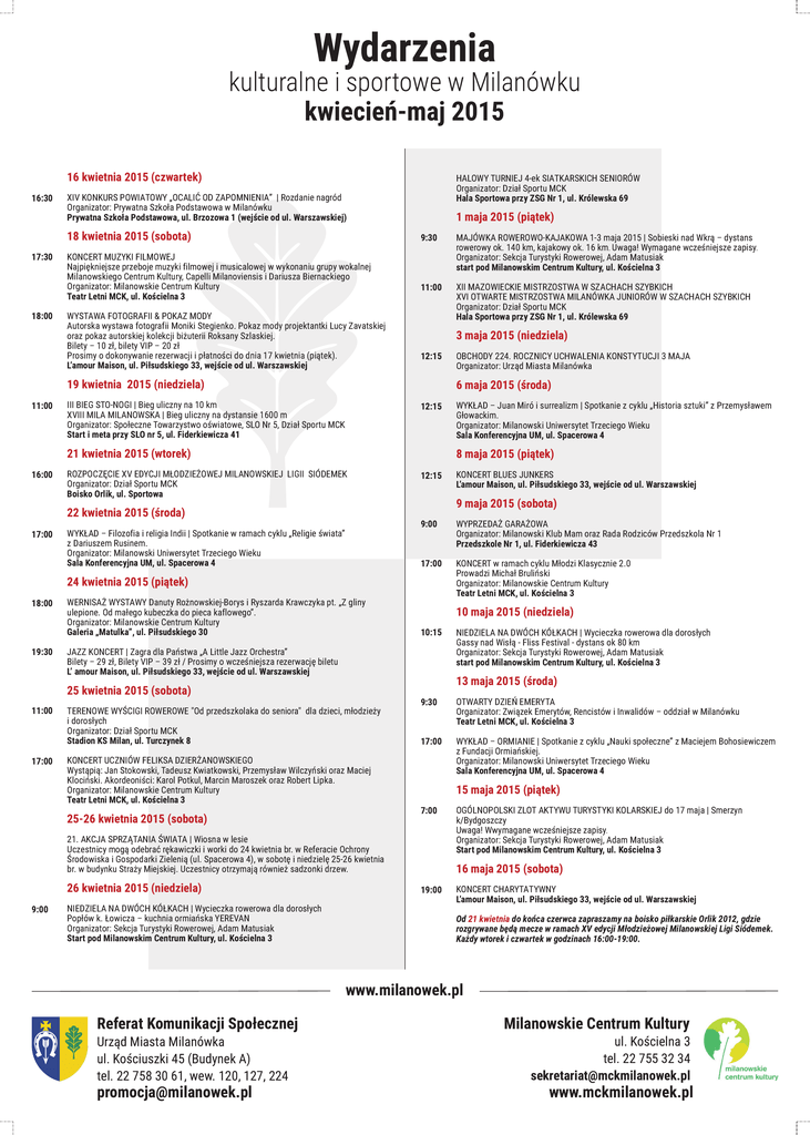 Wydarzenia kulturalne i sportowe w Milanówku kwiecień-maj 201 5 1 6 kwietnia 201 5 (czwartek) 1 6:30 HALOWY TURNIEJ 4-ek SIATKARSKICH SENIORÓW Organizator: Dział Sportu MCK XIV KONKURS POWIATOWY „OCALIĆ OD ZAPOMNIENIA” | Rozdanie nagród Organizator: Prywatna Szkoła Podstawowa w Milanówku Hala Sportowa przy ZSG Nr 1 , ul. Królewska 69 1 maja 201 5 (piątek) Prywatna Szkoła Podstawowa, ul. Brzozowa 1 (wejście od ul. Warszawskiej) 1 8 kwietnia 201 5 (sobota) 1 7:30 9:30 KONCERT MUZYKI FILMOWEJ Najpiękniejsze przeboje muzyki filmowej i musicalowej w wykonaniu grupy wokalnej Milanowskiego Centrum Kultury, Capelli Milanoviensis i Dariusza Biernackiego Organizator: Milanowskie Centrum Kultury Teatr Letni MCK, ul. Kościelna 3 1 8:00 WYSTAWA FOTOGRAFII & POKAZ MODY Autorska wystawa fotografii Moniki Stegienko. Pokaz mody projektantki Lucy Zavatskiej oraz pokaz autorskiej kolekcji biżuterii Roksany Szlaskiej. Bilety – 1 0 zł, bilety VIP – 20 zł Prosimy o dokonywanie rezerwacji i płatności do dnia 1 7 kwietnia (piątek). L’amour Maison, ul. Piłsudskiego 33, wejście od ul. Warszawskiej start pod Milanowskim Centrum Kultury, ul. Kościelna 3 1 1 :00 3 maja 201 5 (niedziela) 1 2:1 5 III BIEG STO-NOGI | Bieg uliczny na 1 0 km XVIII MILA MILANOWSKA | Bieg uliczny na dystansie 1 600 m Organizator: Społeczne Towarzystwo oświatowe, SLO Nr 5, Dział Sportu MCK 1 2:1 5 8 maja 201 5 (piątek) ROZPOCZĘCIE XV EDYCJI MŁODZIEŻOWEJ MILANOWSKIEJ LIGII SIÓDEMEK Organizator: Dział Sportu MCK 1 2:1 5 Boisko Orlik, ul. Sportowa 9:00 WYKŁAD – Filozofia i religia Indii | Spotkanie w ramach cyklu „Religie świata” z Dariuszem Rusinem. Organizator: Milanowski Uniwersytet Trzeciego Wieku 1 7:00 24 kwietnia 201 5 (piątek) WERNISAŻ WYSTAWY Danuty Rożnowskiej-Borys i Ryszarda Krawczyka pt. „Z gliny ulepione. Od małego kubeczka do pieca kaflowego”. Organizator: Milanowskie Centrum Kultury Galeria „Matulka”, ul. Piłsudskiego 30 1 0:1 5 1 3 maja 201 5 (środa) Stadion KS Milan, ul. Turczynek 8 9:30 1 7:00 1 5 maja 201 5 (piątek) 21 . AKCJA SPRZĄTANIA ŚWIATA | Wiosna w lesie Uczestnicy mogą odebrać rękawiczki i worki do 24 kwietnia br. w Referacie Ochrony Środowiska i Gospodarki Zielenią (ul. Spacerowa 4), w sobotę i niedzielę 25-26 kwietnia br. w budynku Straży Miejskiej. Uczestnicy otrzymają również sadzonki drzew. NIEDZIELA NA DWÓCH KÓŁKACH | Wycieczka rowerowa dla dorosłych Popłów k. Łowicza – kuchnia ormiańska YEREVAN Organizator: Sekcja Turystyki Rowerowej, Adam Matusiak Start pod Milanowskim Centrum Kultury, ul. Kościelna 3 WYKŁAD – ORMIANIE | Spotkanie z cyklu „Nauki społeczne” z Maciejem Bohosiewiczem z Fundacji Ormiańskiej. Organizator: Milanowski Uniwersytet Trzeciego Wieku Sala Konferencyjna UM, ul. Spacerowa 4 7:00 25-26 kwietnia 201 5 (sobota) OTWARTY DZIEŃ EMERYTA Organizator: Związek Emerytów, Rencistów i Inwalidów – oddział w Milanówku Teatr Letni MCK, ul. Kościelna 3 KONCERT UCZNIÓW FELIKSA DZIERŻANOWSKIEGO Wystąpią: Jan Stokowski, Tadeusz Kwiatkowski, Przemysław Wilczyński oraz Maciej Klociński. Akordeoniści: Karol Potkul, Marcin Maroszek oraz Robert Lipka. Organizator: Milanowskie Centrum Kultury Teatr Letni MCK, ul. Kościelna 3 9:00 NIEDZIELA NA DWÓCH KÓŁKACH | Wycieczka rowerowa dla dorosłych Gassy nad Wisłą - Fliss Festival - dystans ok 80 km Organizator: Sekcja Turystyki Rowerowej, Adam Matusiak start pod Milanowskim Centrum Kultury, ul. Kościelna 3 TERENOWE WYŚCIGI ROWEROWE "Od przedszkolaka do seniora" dla dzieci, młodzieży i dorosłych Organizator: Dział Sportu MCK 26 kwietnia 201 5 (niedziela) KONCERT w ramach cyklu Młodzi Klasycznie 2.0 Prowadzi Michał Bruliński Organizator: Milanowskie Centrum Kultury 1 0 maja 201 5 (niedziela) JAZZ KONCERT | Zagra dla Państwa „A Little Jazz Orchestra” Bilety – 29 zł, Bilety VIP – 39 zł / Prosimy o wcześniejsza rezerwację biletu 25 kwietnia 201 5 (sobota) 1 7:00 WYPRZEDAŻ GARAŻOWA Organizator: Milanowski Klub Mam oraz Rada Rodziców Przedszkola Nr 1 Teatr Letni MCK, ul. Kościelna 3 L’ amour Maison, ul. Piłsudskiego 33, wejście od ul. Warszawskiej 1 1 :00 L’amour Maison, ul. Piłsudskiego 33, wejście od ul. Warszawskiej Przedszkole Nr 1 , ul. Fiderkiewicza 43 Sala Konferencyjna UM, ul. Spacerowa 4 1 9:30 KONCERT BLUES JUNKERS 9 maja 201 5 (sobota) 22 kwietnia 201 5 (środa) 1 8:00 WYKŁAD – Juan Miró i surrealizm | Spotkanie z cyklu „Historia sztuki” z Przemysławem Głowackim. Organizator: Milanowski Uniwersytet Trzeciego Wieku Sala Konferencyjna UM, ul. Spacerowa 4 21 kwietnia 201 5 (wtorek) 1 7:00 OBCHODY 224. ROCZNICY UCHWALENIA KONSTYTUCJI 3 MAJA Organizator: Urząd Miasta Milanówka 6 maja 201 5 (środa) Start i meta przy SLO nr 5, ul. Fiderkiewicza 41 1 6:00 XII MAZOWIECKIE MISTRZOSTWA W SZACHACH SZYBKICH XVI OTWARTE MISTRZOSTWA MILANÓWKA JUNIORÓW W SZACHACH SZYBKICH Organizator: Dział Sportu MCK Hala Sportowa przy ZSG Nr 1 , ul. Królewska 69 1 9 kwietnia 201 5 (niedziela) 1 1 :00 MAJÓWKA ROWEROWO-KAJAKOWA 1 -3 maja 201 5 | Sobieski nad Wkrą – dystans rowerowy ok. 1 40 km, kajakowy ok. 1 6 km . Uwaga! Wymagane wcześniejsze zapisy. Organizator: Sekcja Turystyki Rowerowej, Adam Matusiak OGÓLNOPOLSKI ZLOT AKTYWU TURYSTYKI KOLARSKIEJ do 1 7 maja | Smerzyn k/Bydgoszczy Uwaga! Wwymagane wcześniejsze zapisy. Organizator: Sekcja Turystyki Rowerowej, Adam Matusiak Start pod Milanowskim Centrum Kultury, ul. Kościelna 3 1 6 maja 201 5 (sobota) 1 9:00 KONCERT CHARYTATYWNY L’amour Maison, ul. Piłsudskiego 33, wejście od ul. Warszawskiej Od 21 kwietnia do końca czerwca zapraszamy na boisko piłkarskie Orlik 2012, gdzie rozgrywane będą mecze w ramach XV edycji Młodzieżowej Milanowskiej Ligi Siódemek. Każdy wtorek i czwartek w godzinach 16:00-19:00. www.milanowek.pl Referat Komunikacji Społecznej Urząd Miasta Milanówka ul. Kościuszki 45 (Budynek A) tel. 22 758 30 61 , wew. 1 20, 1 27, 224 [email prot
