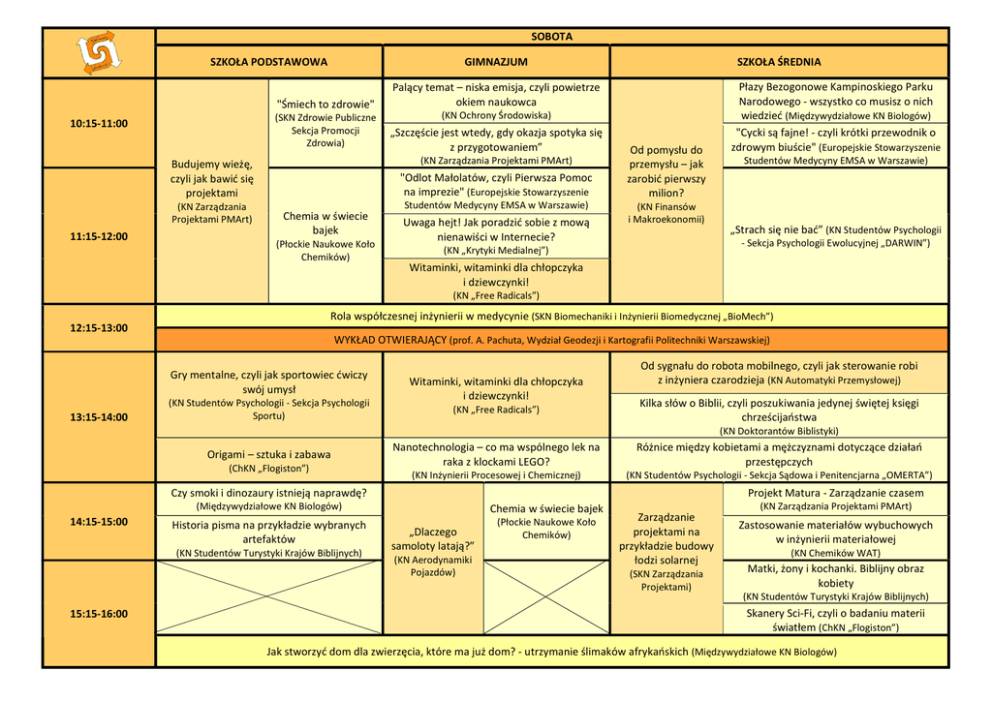 SZKOŁA PODSTAWOWA "Śmiech to zdrowie" 10:15-11:00 Budujemy wieżę, czyli jak bawić się projektami 11:15-12:00 GIMNAZJUM (KN Zarządzania Projektami PMArt) (SKN Zdrowie Publiczne Sekcja Promocji Zdrowia) Chemia w świecie bajek (Płockie Naukowe Koło Chemików) SOBOTA SZKOŁA ŚREDNIA Palący temat – niska emisja, czyli powietrze okiem naukowca (KN Ochrony Środowiska) „Szczęście jest wtedy, gdy okazja spotyka się z przygotowaniem” (KN Zarządzania Projektami PMArt) "Odlot Małolatów, czyli Pierwsza Pomoc na imprezie" (Europejskie Stowarzyszenie Studentów Medycyny EMSA w Warszawie) Uwaga hejt! Jak poradzić sobie z mową nienawiści w Internecie? Od pomysłu do przemysłu – jak zarobić pierwszy milion? (KN Finansów i Makroekonomii) (KN „Krytyki Medialnej”) Witaminki, witaminki dla chłopczyka i dziewczynki! Płazy Bezogonowe Kampinoskiego Parku Narodowego - wszystko co musisz o nich wiedzieć (Międzywydziałowe KN Biologów) "Cycki są fajne! - czyli krótki przewodnik o zdrowym biuście" (Europejskie Stowarzyszenie Studentów Medycyny EMSA w Warszawie) „Strach się nie bać” (KN Studentów Psychologii - Sekcja Psychologii Ewolucyjnej „DARWIN”) (KN „Free Radicals”) Rola współczesnej inżynierii w medycynie (SKN Biomechaniki i Inżynierii Biomedycznej „BioMech”) 12:15-13:00 13:15-14:00 WYKŁAD OTWIERAJĄCY (prof. A. Pachuta, Wydział Geodezji i Kartografii Politechniki Warszawskiej) Gry mentalne, czyli jak sportowiec ćwiczy swój umysł (KN Studentów Psychologii - Sekcja Psychologii Sportu) Origami – sztuka i zabawa (ChKN „Flogiston”) 14:15-15:00 Czy smoki i dinozaury istnieją naprawdę? (Międzywydziałowe KN Biologów) Historia pisma na przykładzie wybranych artefaktów (KN Studentów Turystyki Krajów Biblijnych) 15:15-16:00 Witaminki, witaminki dla chłopczyka i dziewczynki! Od sygnału do robota mobilnego, czyli jak sterowanie robi z inżyniera czarodzieja (KN Automatyki Przemysłowej) (KN „Free Radicals”) Kilka słów o Biblii, czyli poszukiwania jedynej świętej księgi chrześcijaństwa Nanotechnologia – co ma wspólnego lek na raka z klockami LEGO? Różnice między kobietami a mężczyznami dotyczące działań przestępczych (KN Inżynierii Procesowej i Chemicznej) „Dlaczego samoloty latają?” (KN Aerodynamiki Pojazdów) Chemia w świecie bajek (Płockie Naukowe Koło Chemików) (KN Doktorantów Biblistyki) (KN Studentów Psychologii - Sekcja Sądowa i Penitencjarna „OMERTA”) Zarządzanie projektami na przykładzie budowy łodzi solarnej (SKN Zarządzania Projektami) Projekt Matura - Zarządzanie czasem (KN Zarządzania Projektami PMArt) Zastosowanie materiałów wybuchowych w inżynierii materiałowej (KN Chemików WAT) Matki, żony i kochanki. Biblijny obraz kobiety (KN Studentów Turystyki Krajów Biblijnych) Skanery Sci-Fi, czyli o badaniu materii światłem (ChKN „Flogiston”) Jak stworzyć dom dla zwierzęcia, które ma już dom? - utrzymanie ślimaków afrykańskich (Międzywydziałowe KN Biologów) SZKOŁA PODSTAWOWA 10:15-11:00 11:15-12:00 12:15-13:00 13:15-14:00 Od poprawy koncentracji, przez usprawnienie pamięci, aż do pobudzenia kreatywności, czyli wszystko co pozwoli Ci uczyć się szybciej i skuteczniej! (KN Zarządzania Projektami PMArt) 15:15-16:00 GIMNAZJUM Destylacja na obcasach, miareczkowanie w spódnicy (…) Legenda o smogu i jego królestwie (KN Ochrony Środowiska) Tajemnice mózgu człowieka (KN „Cerebrum” przy Zakładzie Fizjologii i Patofizjologii Człowieka) SZKOŁA ŚREDNIA Czarna dziura we wszechświecie (KN „Konstruktor”) (ChKN „Flogiston”) Być ekologiem w przyjaźni z Bogiem Ciekawostki dietetyczne, które zmienią Twoje życie! (KN Katechetyków) (SKN przy Klinice Chirurgii Ogólnej i Żywienia Klinicznego) Zobacz DNA na własne oczy! Lot balonem (KN Zarządzania Projektami PMArt) (KN Genetyki i Epigenetyki) Badanie Wszechświata – o tym jak powstał (…) (SK Astronautyczne) Warsztaty pielęgniarskie (SKN przy Zakładzie Podstaw Pielęgniarstwa) „Fetysz – a co to za zwierzę?” (Międzywydziałowe KN Biologów) Warsztaty pielęgniarskie (SKN przy Zakładzie Podstaw Pielęgniarstwa) Co w trawie piszczy, czyli na czym i co gra polski świerszcz. O tradycjach muzycznych Polski – tańcach, instrumentach i pieśniach (KN Etnomuzykologii) Hodowla in vitro roślin leczniczych w teorii i praktyce (SKN „Herba”) Jak skutecznie motywować Zobacz DNA sportowców – praktyczna na własne oczy! psychologia sportu Sokolnictwo, wyjątkowe hobby – czyli (KN Genetyki (KN Studentów Psychologii – Sekcja o niezwykłej współpracy człowieka i Epigenetyki) Psychologii Sportu) z ptakiem drapieżnym Drużyna (KN „Aves”) Alternatywna historia Cuda – nie: zwidy – o cudach św. Franciszka – świata biblijnych z perspektywy nauki święci Zorganizuj konferencje (ChKN „Flogiston”) (KN Katechetyków) i błogosławieni (KN Zarządzania Projektami PMArt) Jak dobieramy się w pary? miłośnicy przyrody Relacja zieleni i architektury w krajobrazie (KN Katechetyków) 14:15-15:00 NIEDZIELA Słodko, zdrowo, kolorowo (KN Żywieniowców i Dietetyków) (KN Architektów Krajobrazu) Życie codzienne na Bliskim Wschodzie w czasach Jezusa (KN Studentów Turystyki Krajów Biblijnych) Pokaz chemiczny (ChKN „Flogiston”) (KN Studentów Psychologii – Sekcja Seksuologiczna) Historia podboju kosmosu – poprzez lądowanie ludzi na Księżycu, wahadłowce kosmiczne, aż do czasów obecnych (SK Astronautyczne)