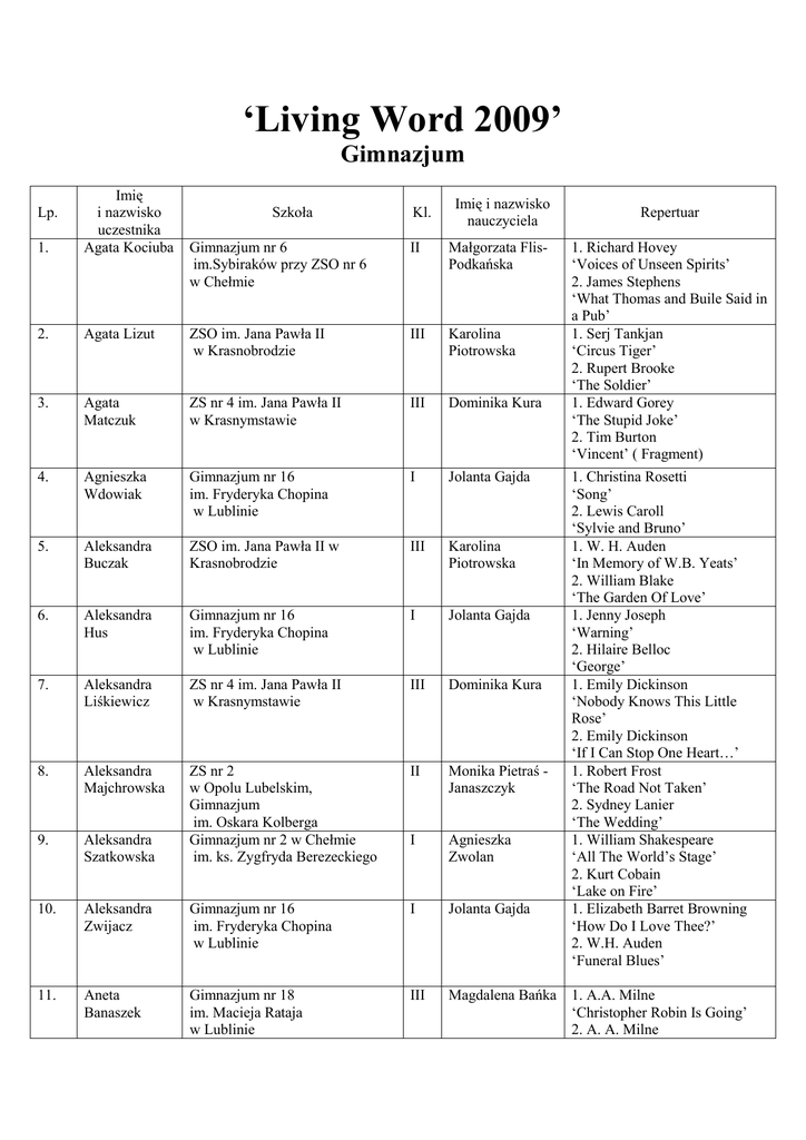 ‘Living Word 2009’ Gimnazjum 1. Imię i nazwisko uczestnika Agata Kociuba 2. Lp. Szkoła Kl. Imię i nazwisko nauczyciela Gimnazjum nr 6 im.Sybiraków przy ZSO nr 6 w Chełmie II Małgorzata FlisPodkańska Agata Lizut ZSO im. Jana Pawła II w Krasnobrodzie III Karolina Piotrowska 3. Agata Matczuk ZS nr 4 im. Jana Pawła II w Krasnymstawie III Dominika Kura 4. Agnieszka Wdowiak Gimnazjum nr 16 im. Fryderyka Chopina w Lublinie I Jolanta Gajda 5. Aleksandra Buczak ZSO im. Jana Pawła II w Krasnobrodzie III Karolina Piotrowska 6. Aleksandra Hus Gimnazjum nr 16 im. Fryderyka Chopina w Lublinie I Jolanta Gajda 7. Aleksandra Liśkiewicz ZS nr 4 im. Jana Pawła II w Krasnymstawie III Dominika Kura 8. Aleksandra Majchrowska II Monika Pietraś Janaszczyk 9. Aleksandra Szatkowska ZS nr 2 w Opolu Lubelskim, Gimnazjum im. Oskara Kolberga Gimnazjum nr 2 w Chełmie im. ks. Zygfryda Berezeckiego I Agnieszka Zwolan 10. Aleksandra Zwijacz Gimnazjum nr 16 im. Fryderyka Chopina w Lublinie I Jolanta Gajda 11. Aneta Banaszek Gimnazjum nr 18 im. Macieja Rataja w Lublinie III Magdalena Bańka Repertuar 1. Richard Hovey ‘Voices of Unseen Spirits’ 2. James Stephens ‘What Thomas and Buile Said in a Pub’ 1. Serj Tankjan ‘Circus Tiger’ 2. Rupert Brooke ‘The Soldier’ 1. Edward Gorey ‘The Stupid Joke’ 2. Tim Burton ‘Vincent’ ( Fragment) 1. Christina Rosetti ‘Song’ 2. Lewis Caroll ‘Sylvie and Bruno’ 1. W. H. Auden ‘In Memory of W.B. Yeats’ 2. William Blake ‘The Garden Of Love’ 1. Jenny Joseph ‘Warning’ 2. Hilaire Belloc ‘George’ 1. Emily Dickinson ‘Nobody Knows This Little Rose’ 2. Emily Dickinson ‘If I Can Stop One Heart…’ 1. Robert Frost ‘The Road Not Taken’ 2. Sydney Lanier ‘The Wedding’ 1. William Shakespeare ‘All The World’s Stage’ 2. Kurt Cobain ‘Lake on Fire’ 1. Elizabeth Barret Browning ‘How Do I Love Thee?’ 2. W.H. Auden ‘Funeral Blues’ 1. A.A. Milne ‘Christopher Robin Is Going’ 2. A. A. Milne 12. Aneta Włodarczyk Publiczne Gimnazjum nr 5 w Białej Podlaskiej III Urszula Misiołek 13. Angelika Klimek Gimnazjum nr 6 im.Sybiraków przy ZSO nr 6 w Chełmie II Małgorzata FlisPodkańska 14. Anita Kicińska Publiczne Gimnazjum im. Henryka Sienkiewicza w Siedliszczu II 15. Anna Szczepańska Gimnazjum nr 18 im. Macieja Rataja w Lublinie III Magdalena Bańka 16. Anna Złomańczuk Gimnazjum nr 16 im. Fryderyka Chopina w Lublinie II Teresa Kozłowska 17. Diana Wrzeszcz Gimnazjum nr 5 im. Orląt Lwowskich w Krasnymstawie III Alicja Orzechowska 18. Dorota Noga ZS w Rudzie Hucie I Aleksandra Panasiuk 19. Emilia Wilgocka ZSzS Gimnazjum Publiczne im. Jana Pawła II w Rejowcu 20. Ewa śebrowska ZS nr 1 w Krasnymstawie III Maria śebrowska 21. Ewelina Oleszek Gimnazjum nr 16 im. Fryderyka Chopina w Lublinie II Jolanta Gajda 22. Iwona Dudko Publiczne Gimnazjum w Strachosławiu III Anna Szymańska 23. Izabela Lasocińska ZS w Rudzie Hucie I Aleksandra Panasiuk 24. Joanna śyszkowska Gimnazjum nr 6 im.Sybiraków przy ZSO nr 6 w Chełmie II Małgorzata FlisPodkańska Marek Krzywicki ‘Disobedience 1. Stephanie Cooper ‘I Pray’ 2. Margaret Atwood ‘The Moment’ 1. Carl Sandburg ‘Stars, Songs, Faces’ 2. Christina Rosetti ‘Remember’ 1.Ashley Sueanna Knight ‘I Hope’ 2. Mentica Monoi Angel ‘The Kiss’ 1. Sylvia Plath ‘Morning Song’ 2. Sylvia Plath ‘The Night Dances’ 1. William Wordsworth ‘The Daffodils’ 2. Emily Dickinson ‘I’m Nobody. Who Are You? 1. Frances Hodgson Burnett ‘The Secret garden’ 2. Robert Frost ‘The Road Not Taken’ 1. Walter de la Mare ‘Silver’ 2. Nicolas Breton ‘An Odd Conceit’ 1. J. R. R. Tolkien ‘One Ring’ 2. Lucy Maud Montgomery ‘Anne of Green Gables’ 1. Maya Angelou ‘Phenomenal Woman’ 2. Maya Angelou ‘Still I Rise’ 1. William Butler Yeats ‘When You Are Old’ 2. Thomas Moore ‘The Last Rose of Summer’ 1. William Shakespeare ‘Hamlet – monologue’ ( fragm.) 2. William Wordsworth ‘The Sailor’s Mother’ 1. Francis Turner Palgrave ‘Eutopia’ 2. Sir Thomas Wyatt ‘A Revocation’ 1. Tupac Shakur ‘I Cry’ 2. Irene Rutheford McLeod ‘Is Love, Then, So Simple’ 25. . Justyna Łabuś Zespół Szkół im.ks. J. Dąbrowskiego w śółtańcach II Magdalena JaworskaWójtowicz 26. Karolina Knap ZS nr 5 im. Orląt Lwowskich w Krasnymstawie I Anna Nadolska 27. Karolina Walczuk ZS w Rudzie Hucie Aleksandra Panasiuk 28. Katarzyna Dadas ZS w Rudzie Hucie Norbert Zabroń 29. Kinga Pietras ZS nr 2 w Opolu Lubelskim Gimnazjum im. Oskara Kolberga II Monika Pietraś Janaszczyk 30. Klaudia Laszuk Publiczne Gimnazjum nr 5 w Białej Podlaskiej III Urszula Misiołek 31. Łukasz Patryk Dudko Zespół Szkół im.ks. J. Dąbrowskiego w śółtańcach III 32. Magdalena śywicka ZS nr 2 w Opolu Lubelskim Gimnazjum im. Oskara Kolberga II Monika Pietraś Janaszczyk 33. Marcin Bubicz Gimnazjum nr 16 im. Fryderyka Chopina w Lublinie I Jolanta Gajda 34. Marzena Szczepanik Zespół Szkół im.ks. J. Dąbrowskiego w śółtańcach II Magdalena JaworskaWójtowicz 35. Michał Lutek Gimnazjum nr 16 im. Fryderyka Chopina w Lublinie II Teresa Kozłowska 36. Monika Czmuda Publiczne Gimnazjum im. Henryka Sienkiewicza w Siedliszczu II 37. Monika Grabiec ZS nr 4 im. Jana Pawła II w Krasnymstawie III Dominika Kura 1. Shannen Wrass ‘The Perfect Friend’ 2. Emily Bronte ‘Last Lines’ 1. Tamara K. Vickery ‘The Flowers Of Friendship’ 2. William Wordsworth ‘The Daffodils’ 1. Margaret Lee Ashley ‘In April’ 2. Laurence Binyon ‘A Song’ 1. John Barbour ‘Freedom’ 2. William Blake ‘The Litle Black Boy’ 1. Jessica Bousfield ‘My Angel’ 2. William Wordsworth ‘I Wandered Lonely As A Cloud’ 1. Yvonne Belase Nyane ‘Girl Poet’ 2. Jose Campos ‘Lost’ 1. T.S. Elliot ‘The Wasteland: A Game of Chess’ 2. Edgar Allan Poe ‘Dream’ 1. Robert Frost ‘Stopping by Woods on a Snowy Evening’ 2. Taylor Dumm ‘A Friend’ 1.Kenn Nesbitt ‘I’m Practically Pe