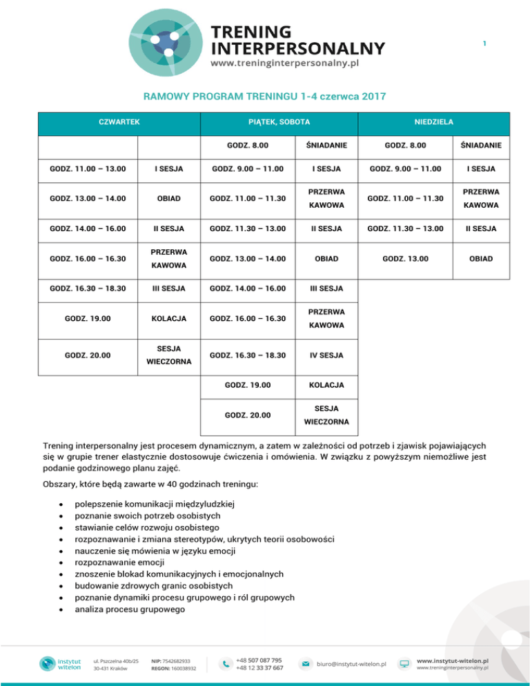 1 RAMOWY PROGRAM TRENINGU 1-4 czerwca 2017 CZWARTEK PIĄTEK, SOBOTA NIEDZIELA GODZ. 8.00 ŚNIADANIE GODZ. 8.00 ŚNIADANIE I SESJA GODZ. 9.00 – 11.00 I SESJA GODZ. 11.00 – 13.00 I SESJA GODZ. 9.00 – 11.00 GODZ. 13.00 – 14.00 OBIAD GODZ. 11.00 – 11.30 GODZ. 14.00 – 16.00 II SESJA GODZ. 11.30 – 13.00 II SESJA GODZ. 11.30 – 13.00 II SESJA GODZ. 13.00 – 14.00 OBIAD GODZ. 13.00 OBIAD III SESJA GODZ. 16.00 – 16.30 PRZERWA KAWOWA GODZ. 16.30 – 18.30 III SESJA GODZ. 14.00 – 16.00 GODZ. 19.00 KOLACJA GODZ. 16.00 – 16.30 GODZ. 20.00 SESJA WIECZORNA PRZERWA KAWOWA PRZERWA KAWOWA PRZERWA KAWOWA GODZ. 16.30 – 18.30 IV SESJA GODZ. 19.00 KOLACJA GODZ. 20.00 GODZ. 11.00 – 11.30 SESJA WIECZORNA Trening interpersonalny jest procesem dynamicznym, a zatem w zależności od potrzeb i zjawisk pojawiających się w grupie trener elastycznie dostosowuje ćwiczenia i omówienia. W związku z powyższym niemożliwe jest podanie godzinowego planu zajęć. Obszary, które będą zawarte w 40 godzinach treningu: polepszenie komunikacji międzyludzkiej poznanie swoich potrzeb osobistych stawianie celów rozwoju osobistego rozpoznawanie i zmiana stereotypów, ukrytych teorii osobowości nauczenie się mówienia w języku emocji rozpoznawanie emocji znoszenie blokad komunikacyjnych i emocjonalnych budowanie zdrowych granic osobistych poznanie dynamiki procesu grupowego i ról grupowych analiza procesu grupowego 2 Podczas treningu większość czasu spędza się na materacach, w związku z tym prosimy wziąć wygodne codzienne ubranie. W ciągu sesji dziennych pracuje się nad realizacją celów treningowych, natomiast wieczorne sesje poświęcone są relaksacji i świadomości ciała. W miarę możliwości prosimy o wyłączenie się ze świata zewnętrznego, zadbanie by obowiązki, bliscy nie rozpraszały koncentracji na procesie treningu. Jest to istotny elementy pracy tą metodą. Po zakończonym treningu uczestnicy otrzymują zaświadczenie ukończenia (przy obecności na wszystkich sesjach). Uprzedzamy, że jednym z elementów treningu jest wstrzemięźliwość od alkoholu i używek zmieniających świadomość. Trening NIE JEST formą terapii, lecz rozwoju osobistego. NIE jest polecany osobom leczącym się psychiatrycznie, pozostającym w głębokim kryzysie życiowym. Trening odbędzie się w Województwie Dolnośląskim w Brzezinkach k/Jelcza „Dom pod Wierzbą”. Przewidujemy noclegi zbiorowe (z rozdzieleniem płci). Istnieje możliwość pomocy w zakresie dojazdu na miejsce treningu- w dzień rozpoczęcia na odcinkach Kraków- Brzezinki; Wrocław-Brzezinki Prosimy o zgłoszenie, jeżeli powinniśmy zadbać w jakiś specjalny sposób o posiłki dla Państwa. Cena treningu to łącznie z wyżywieniem i noclegami koszt: 950,00 zł. Prosimy o informacje, kto z Państwa potrzebuje rachunku na firmę. Warunkiem akceptacji uczestnictwa jest przesłanie maila ze zgłoszeniem na adres [email protected] oraz wpłata zaliczki w wysokości 300 zł na rachunek ING BANK ŚLĄSKI: 22 1050 1445 1000 0090 7686 0494 Zapraszamy Tomasz Waleczko, Sławomir Prusakowski