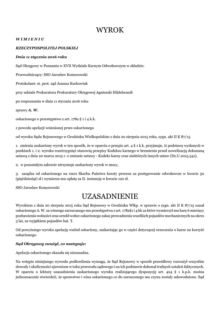 WYROK WIMIENIU RZECZYPOSPOLITEJ POLSKIEJ Dnia 11 stycznia 2016 roku Sąd Okręgowy w Poznaniu w XVII Wydziale Karnym Odwoławczym w składzie: Przewodniczący: SSO Jarosław Komorowski Protokolant: st. prot. sąd Joanna Kurkowiak przy udziale Prokuratora Prokuratury Okręgowej Agnieszki Hildebrandt po rozpoznaniu w dniu 11 stycznia 2016 roku sprawy A. W. oskarżonego o przestępstwo z art. 178a § 1 i 4 k.k. z powodu apelacji wniesionej przez oskarżonego od wyroku Sądu Rejonowego w Grodzisku Wielkopolskim z dnia 20 sierpnia 2015 roku, sygn. akt II K 87/15 1. zmienia zaskarżony wyrok w ten sposób, że w oparciu o przepis art. 4 § 1 k.k. przyjmuje, iż podstawę wydanych w punktach 1. i 2. wyroku rozstrzygnięć stanowią przepisy Kodeksu karnego w brzmieniu przed nowelizacją dokonaną ustawą z dnia 20 marca 2015 r. o zmianie ustawy - Kodeks karny oraz niektórych innych ustaw (Dz.U.2015.541), 2. w pozostałym zakresie utrzymuje zaskarżony wyrok w mocy, 3. zasądza od oskarżonego na rzecz Skarbu Państwa koszty procesu za postępowanie odwoławcze w kwocie 50 (pięćdziesiąt) zł i wymierza mu opłatę za II. instancję w kwocie 120 zł. SSO Jarosław Komorowski UZASADNIENIE Wyrokiem z dnia 20 sierpnia 2015 roku Sąd Rejonowy w Grodzisku Wlkp. w sprawie o sygn. akt II K 87/15 uznał oskarżonego A. W. za winnego zarzucanego mu przestępstwa z art. 178a§1 i 4 kk za które wymierzył mu karę 6 miesięcy pozbawienia wolności oraz orzekł wobec oskarżonego zakaz prowadzenia wszelkich pojazdów mechanicznych na okres 3 lat, za wyjątkiem pojazdów kat. T. Od powyższego wyroku apelację wniósł oskarżony, zaskarżając go w części dotyczącej orzeczenia o karze na korzyść oskarżonego. Sąd Okręgowy zważył, co następuje: Apelacja oskarżonego okazała się niezasadna. Na wstępie niniejszego wywodu podkreślenia wymaga, że Sąd Rejonowy w sposób prawidłowy rozważył wszystkie dowody i okoliczności ujawnione w toku przewodu sądowego i na ich podstawie dokonał trafnych ustaleń faktycznych. W oparciu o lekturę uzasadnienia zaskarżonego wyroku realizującego dyspozycję art. 424 § 1 k.p.k. można jednoznacznie stwierdzić, że sprawstwo i wina oskarżonego co do zarzuconego mu czynu zostały udowodnione. Sąd Odwoławczy nie dostrzegł również okoliczności, które w myśl art. 439 § 1 k.p.k., art. 440 k.p.k. bądź art. 455 k.p.k. należałoby wziąć pod uwagę z urzędu. Przechodząc do zarzutu sformułowanego w apelacji oskarżonego w postaci rażącej niewspółmierności, tj. surowości orzeczonej kary przypomnieć należy, że o rażącej niewspółmierności kary można mówić jedynie wówczas, gdy suma zastosowanych kar i środków karnych, wymierzonych za popełnione przestępstwo, nie odzwierciedla należycie stopnia społecznej szkodliwości czynu oraz nie zapewnia spełnienia celów kary. Ponadto, orzeczona kara lub środek karny mogą być uznane za niewspółmierne, gdy nie uwzględniają w sposób właściwy zarówno okoliczności popełnionego czynu, jak i osobowości sprawcy (wyrok SN z dnia 30 czerwca 2009 r., WA 19/09, Lex nr 598172). Jak słusznie podkreśla się w orzecznictwie, nie każda nietrafność wymiaru kary uzasadnia zmianę orzeczenia. Zmianę taką uzasadnia jedynie "rażąca niewspółmierność", będąca istotną różnicą między karą wymierzoną przez Sąd I instancji, a taką karą, jaką należałoby orzec w instancji odwoławczej w następstwie prawidłowego rozważenia i uwzględnienia wszystkich okoliczności, które powinny mieć zasadniczy wpływ na wymiar kary. Różnica ocen, o której wyżej mowa, musi być zasadniczej natury, a więc taka, która czyni, że dotychczasowa kara nie może być w żadnej mierze zaakceptowana (zob. wyrok SN z dnia 30 września 2003 r., SNO 56/03, Lex nr 471890). A. W. został uznany za winnego popełnienia przestępstwa z art. 178a§ 1 i 4 k.k. za które grozi kara pozbawienia wolności od 3 miesięcy do lat 5. Za przypisane oskarżonemu przestępstwo Sąd Rejonowy wymierzył mu karę 6 miesięcy pozbawienia wolności, tj. w pobliżu dolnej granicy ustawowego zagrożenia. Sąd Okręgowy uznał, iż ustawa obowiązująca w dacie orzekania w przedmiotowej sprawie była mniej korzystna dla sprawcy niż ustawa obowiązująca w dacie popełnienia zarzucanego czynu. Analiza przepisów prowadzi do wniosku, iż cały szereg przepisów obowiązujących przed 1 lipca 2015 r. korzystniej regulował sytuację oskarżonego ( np. art. 42§2 kk, 49§2 kk, art. 69 § 1 i 4 kk ), następnie pojawiły się regulacje prawne traktujące sprawców występków z art. 178a§4 kk zdecydowanie mniej korzystnie ( np. od 18.05.2015 r. - art. 42 § 3 kk oraz od 1.07.2015 r.- art. 43a § 2 kk). Sąd Rejonowy w pisemnym uzasadnieniu wyroku dał wyraz temu, iż zastosował ustawę obowiązującą przed 1 lipca 2015 r. , jednak musiało to zostać wyraźnie wskazane w orzeczeniu Sądu Odwoławczego wraz ze wskazaniem konkretnego stanu prawnego, aby w tym zakresie nie było żadnych wątpliwości. Odnosząc się do zarzutów apelującego i oceny wymiaru orzeczonej kary, stwierdzić należy, iż Sąd I instancji uwzględnił stopień winy oskarżonego, stopień społecznej szkodliwości przypisanego mu przestępstwa oraz wcześniejszą karalność oskarżonego, jednakże za jeden tylko czyn ( vide k. 13 akt sygn. VII K 508/14 ). Tymczasem jak wynika z aktualnych danych o karalności – oskarżony był już trzykrotnie karany, w tym dwukrotnie zanim popełnił przestępstwo objęte przedmiotowym postępowaniem oraz jeden raz już po popełnieniu tego czynu, lecz przed wydaniem orzeczenia ( vide k. 65-66 ). Co istotne, wszystkie trzy skazania dotyczyły występków z art. 178a§1 kk albo art. 178a§4 kk. Świadczy to o całkowitej bezkarności oskarżonego. Weryfikując trafność ocen dokonanych przez Sąd I instancji Sąd Odwoławczy miał na uwadze, że A. W. okazał brak poszanowania dla obowiązującego porząd