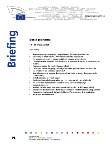Sesja plenarna 13 - 16 marca 2006 Strasburg Wymuszona prostytucja: współczesna forma niewolnictwa Europejski Instytut ds. Równości Kobiet i MęŜczyzn Swobodny przepływ pracowników i okresy przejściowe Oświadczenia Komisji Europejskiej w sprawie fuzji na wewnętrznym rynku Przygotowania do Rady Europejskiej Ochrona oznaczeń geograficznych i nazw pochodzenia produktów Ile środków na ochronę zdrowia? Wspólnotowy program działań w dziedzinie ochrony konsumentów (2007-2013) Delokalizacja, a rynek pracy Społeczeństwo informacyjne na rzecz wzrostu i zatrudnienia W kierunku społecznie akceptowalnej restrukturyzacji przedsiębiorstw Walka z ubóstwem pozostaje wyzwaniem dla Unii Europejskiej Prezydent Republiki Federalnej Niemiec w Parlamencie Europejskim Prezydent Autonomii Palestyńskiej w Parlamencie Europejskim Strategia rozszerzenia Dział Prasowy Dyrekcja ds. Kontaktów z Mediami Dyrektor & Rzecznik Prasowy : Jaume DUCH Marzec I - 2006 Kody procedur parlamentarnych Seria A Seria B Seria C * **I **II *** ***I ***II ***III Raporty i zalecenia Uchwały i pytania ustne Dokumenty innych instytucji Procedura konsultacji Procedura współpracy (1. czytanie) Procedura współpracy (2. czytanie) Procedura zgody Procedura współdecydowania (1. czytanie) Procedura współdecydowania (2. czytanie) Procedura współdecydowania (3. czytanie) Skróty BE CZ DK DE EE EL ES FR IE Belgia Czechy Dania Niemcy Estonia Grecja Hiszpania Francja Irlandia IT CY LV LT LU HU MT NL AT Włochy Cypr Łotwa Litwa Luksemburg Węgry Malta Holandia Austria PL PT SL SK FI SE UK Polska Portugalia Słowenia Słowacja Finlandia Szwecja Wielka Brytania PARLAMENT EUROPEJSKI Redakcja: Andrzej Sanderski Tel. 31051 Bruksela: PHS 6A53 Strasburg: IPE3 F02-021 B-1047 Bruksela BP1024, F-67070 Strasburg Tel. (32-2) 283 10 51 Tel. (33) 3 88 17 34 79 Fax (32-2) 284 91 71 Fax (33) 3 88 17 93 55 e-mail: [email protected] http://www.europarl.eu.int/news/expert/default_pl.htm 2 Marzec I - 2006 Briefing - punkty kluczowe W marcu, sesja Parlamentu Europejskiego w Strasburgu rozpocznie się w poniedziałek, 13.03 i potrwa do czwartku 16.03. Posłowie z Grupy Porozumienia Liberałów i Demokratów na rzecz Europy (ALDE) skierowali do Komisji Europejskiej zapytanie ustne w sprawie okresów przejściowych umoŜliwiających derogacje od zasady swobodnego przepływu pracowników. Pytanie dotyczy interesującej sytuacji, kiedy w określonych przypadkach, obywatele państw niebędących członkami UE, a zamieszkujący w którymś z Państw Członkowskich, korzystają w nim z praw dotyczących zatrudnienia i prowadzenia działalności gospodarczej, z których, z powodu okresów przejściowych, nie mogą korzystać obywatele nowych Państw Członkowskich. Debata (bez rezolucji) odbędzie się w poniedziałek, 13 marca, w godzinach wieczornych. W środę wieczorem, 15 marca, posłowie wysłuchają oświadczenia Komisji Europejskiej w sprawie fuzji i przejęć na wewnętrznym rynku. Ze strony Komisji Europejskiej w posiedzeniu uczestniczyć będzie komisarz ds. konkurencji Neelie Kroes. W trakcie najbliŜszego posiedzenia Parlamentu Europejskiego odbędzie się głosowanie nad projektem rezolucji w sprawie wymuszonej prostytucji towarzyszącej wielkim imprezom sportowym. Głosowanie poprzedzi wspólna debata na temat handlu ludźmi ze szczególnym uwzględnieniem zjawiska wymuszonej prostytucji. Przyczynkiem do debaty stały się pytania skierowane przez posłankę Annę Zaborską w imieniu Komisji Praw Kobiet i Równouprawnienia oraz posłanki Karin Rijs-Jorgensen i Elizabeth Lynne z grupy liberałów, ALDE. Okazją do wystąpienia z inicjatywą są zbliŜające się mistrzostwa świata w piłce noŜnej w Niemczech. Pozostałe wybrane tematy nadchodzącej sesji • Dwa sprawozdania posła Friedricha-Wilhelma Graefe zu Baringdorfa w sprawie ochrony oznaczeń geograficznych i nazw pochodzenia produktów rolnych i środków spoŜywczych oraz gwarantowanych tradycyjnych specjalności produktów rolnych i środków spoŜywczych, • Sprawozdania posłów Antoniosa Trakatellisa i posłanki Marianne Thyssen w sprawie wspólnotowych programów działań w dziedzinie ochrony zdrowia i ochrony konsumentów na lata 2007-2013, • Sprawozdanie posła Alaina Hutchinsona dotyczące problemu delokalizacji w kontekście rozwoju regionalnego oraz sprawozdanie posła Jean Louis Cottigny dotyczące restrukturyzacji i zatrudnienia, oraz • Sprawozdanie posłanki Edit Bauer w sprawie ochrony socjalnej i integracji społecznej 3 Marzec I - 2006 Spis treści Wymuszona prostytucja: współczesna forma niewolnictwa...................................................... 5 Europejski Instytut ds. Równości Kobiet i MęŜczyzn ............................................................... 6 Swobodny przepływ pracowników i okresy przejściowe .......................................................... 8 Oświadczenia Komisji Europejskiej w sprawie fuzji na wewnętrznym rynku .......................... 9 Przygotowania do Rady Europejskiej ........................................................................................ 9 Ochrona oznaczeń geograficznych i nazw pochodzenia produktów ....................................... 10 Ile środków na ochronę zdrowia?............................................................................................. 11 Wspólnotowy program działań w dziedzinie ochrony konsumentów (2007-2013) ................ 12 Delokalizacja, a rynek pracy .................................................................................................... 13 Społeczeństwo informacyjne na rzecz wzrostu i zatrudnienia................................................. 15 W kierunku społecznie akceptowalnej restrukturyzacji przedsiębiorstw ................................ 16 Walka z ubóstwem pozostaje wyzwaniem dla Unii Europejskiej............................................ 17 Prezydent Republiki Federalnej Niemiec w Parlamencie Eur