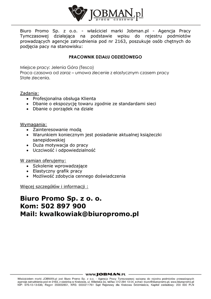 Biuro Promo Sp. z o.o. - właściciel marki Jobman.pl - Agencja Pracy Tymczasowej działająca na podstawie wpisu do rejestru podmiotów prowadzących agencje zatrudnienia pod nr 2163, poszukuje osób chętnych do podjęcia pacy na stanowisku: PRACOWNIK DZIAŁU ODZIEŻOWEGO Miejsce pracy: Jelenia Góra (Tesco) Praca czasowa od zaraz – umowa zlecenie z elastycznym czasem pracy Stałe zlecenia. Zadania: Profesjonalna obsługa Klienta Dbanie o ekspozycję towaru zgodnie ze standardami sieci Dbanie o porządek na dziale Wymagania: Zainteresowanie modą Warunkiem koniecznym jest posiadanie aktualnej książeczki sanepidowskiej Duża motywacja do pracy Uczciwość i odpowiedzialność W zamian oferujemy: Szkolenie wprowadzające Elastyczny grafik pracy Możliwość zdobycia cennego doświadczenia Więcej szczegółów i informacji : Biuro Promo Sp. z o. o. Kom: 502 897 900 Mail: [email protected]