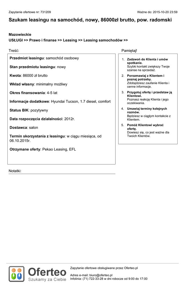 Zapytanie ofertowe nr: 731209 Ważne do: 2015-10-20 23:59 Szukam leasingu na samochód, nowy, 86000zł brutto, pow. radomski Mazowieckie USŁUGI >> Prawo i finanse >> Leasing >> Leasing samochodów >> Treść: Pamiętaj! Przedmiot leasingu: samochód osobowy 1. Zadzwoń do Klienta i umów spotkanie. Szybki kontakt zwiększy Twoje szanse na sprzedaż. Stan przedmiotu leasingu: nowy Kwota: 86000 zł brutto 2. Porozmawiaj z Klientem i poznaj potrzeby. Zdobędziesz zaufanie Klienta i cenne informacje. Wkład własny: minimalny możliwy Okres finansowania: 4-5 lat Informacje dodatkowe: Hyundai Tucson, 1.7 diesel, comfort Status BIK: pozytywny 3. Przygotuj ofertę i przedstaw ją Klientowi. Poznasz reakcję Klienta i jego oczekiwania. 4. Umawiaj terminy kolejnych rozmów. Będziesz w ciągłym kontakcie z Klientem. 5. Pomóż Klientowi wybrać ofertę. Dowiesz się, co jest ważne dla Twoich Klientów. Data rozpoczęcia działalności: 2012r. Dostawca: salon Termin skorzystania z leasingu: w ciągu miesiąca, od 06.10.2015r. Otrzymane oferty: Pekao Leasing, EFL Notatki: Zapytanie ofertowe obsługiwane przez Oferteo.pl Adres e-mail: [email protected] Infolinia: (71) 722-33-28 w dni robocze od 9:00 do 17:00