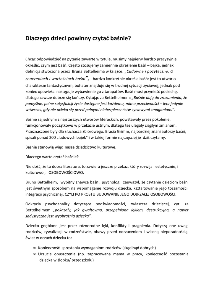 Dlaczego dzieci powinny czytać baśnie? Chcąc odpowiedzieć na pytanie zawarte w tytule, musimy najpierw bardzo precyzyjnie określić, czym jest baśń. Często stosujemy zamiennie określenie baśń – bajka, jednak definicja stworzona przez Bruna Bettelheima w książce: „Cudowne i pożyteczne. O znaczeniach i wartościach baśni ”, bardzo konkretnie określa baśń: jest to utwór o charakterze fantastycznym, bohater znajduje się w trudnej sytuacji życiowej, jednak pod koniec opowieści następuje wybawienie go z tarapatów. Baśń musi przynieść pociechę, dlatego zawsze dobrze się kończy. Cytując za Bettelheimem: „Baśnie dają do zrozumienia, że pomyślne, pełne satysfakcji życie dostępne jest każdemu, mimo przeciwności – lecz jedynie wówczas, gdy nie ucieka się przed pełnymi niebezpieczeństw życiowymi zmaganiami”. Baśnie są jednymi z najstarszych utworów literackich, powstawały przez pokolenie, funkcjonowały początkowo w przekazie ustnym, dlatego też ulegały ciągłym zmianom. Przeznaczone były dla słuchacza zbiorowego. Bracia Grimm, najbardziej znani autorzy baśni, spisali ponad 200 „ludowych bajek” i w takiej formie najczęściej je dziś czytamy. Baśnie stanowią więc nasze dziedzictwo kulturowe. Dlaczego warto czytać baśnie? Nie dość, że to dobra literatura, to zawiera jeszcze przekaz, który rozwija i estetycznie, i kulturowo , i OSOBOWOŚCIOWO. Bruno Bettelheim, wybitny znawca baśni, psycholog, zauważył, że czytanie dzieciom baśni jest świetnym sposobem na wspomaganie rozwoju dziecka, kształtowanie jego tożsamości, integracji psychicznej, CZYLI PO PROSTU BUDOWANIE JEGO DOJRZAŁEJ OSOBOWOŚCI. Odkrycia psychoanalizy dotyczące podświadomości, zwłaszcza dziecięcej, cyt. za Bettelheimem „pokazały, jak gwałtowna, przepełniona lękiem, destrukcyjna, a nawet sadystyczna jest wyobrażnia dziecka”. Dziecko gnębione jest przez różnorodne lęki, konflikty i pragnienia. Dotyczą one uwagi rodziców, rywalizacji w rodzeństwie, obawy przed odrzuceniem i własną nieporadnością. Świat w oczach dziecka to: • Konieczność sprostania wymaganiom rodziców (skądinąd dobrych) • Uczucie opuszczenia (np. zapracowana mama w pracy, konieczność pozostania dziecka w żłobku/ przedszkolu) Życie bohatera baśni – dziecka, często najmłodszego w rodzinie, często zmuszonego do opuszczenia domu, osamotnionego, zwykle jest zagrożone w ujęciu fizycznym lub moralnym. Bohater musi podjąć walkę z trudnościami. TA WALKA JEST NIEODŁĄCZNĄ CZĘŚCIĄ ISTNIENIA. Stawianie czoła wszelkim przeciwnościom losu, a nie ucieczka, prowadzi do zwycięstwa. Fantazje ukryte w baśniach pokazują: • DOKĄD ZMIERZAĆ • W JAKI SPOSÓB TO ROBIĆ Dziecko identyfikuje się z bohaterem baśni, przechodzi jego próby i cierpienia, zewnętrznie i wewnętrznie się z nim utożsamia. Baśnie zatem pomagają dziecku poradzić sobie z lękami, z problemami egzystencjalnymi, z jakimi musi się zmierzyć w okresie dorastania. Ponieważ bohaterowie baśni cechują się biegunowością (są dobrzy albo żli), pozwala to dziecku łatwiej uchwycić zachodzące między nimi różnice, a tym samym dokonać pozytywnych identyfikacji. Przy czym wg Bettelheima wcielenie się dziecka w bohatera nie wynika z faktu, IŻ BOHATER JEST DOBRY, ale SYTUACJA, W JAKIEJ SIĘ ZNALAZŁ, jest dziecku bliska! W BAŚNIACH PROCESY WEWNĘTRZNE (strach, złość, smutek) PRZEDSTAWIONE SĄ JAKO ZEWNĘTRZNE (eksternalizacja). Baśń podaje sposób, jak radzić sobie ze sprzecznymi uczuciami: kocham mamę, ale bardzo się złoszczę, gdy czegoś wymaga. Baśń DOKONUJE ROZSZCZEPIENIA POSTACI – zła macocha, dobra wróżka/kochająca mama w niebie. To pozwala ochronić pozytywny wizerunek bliskiej osoby. Dziecko może również dokonać rozszczepienia własnej osoby, wtedy, gdy „odkrywa” w sobie sprzeczne, całkowicie kłócące się ze sobą uczucia: kocha mamę, a złoszcząc się na nią czuje nienawiść. Punktem wyjścia w terapeutycznym znaczeniu baśni jest właściwy dziecku stan emocjonalny (np. dziecko czuje, że czasami jest w nim prawdziwy, okrutny potwór, np. nienawidzi swojej mamy, gdy na długo wychodzi do pracy, albo strasznie się boi opuszczenia). Stłumienie tego uczucia w sobie, zepchnięcie w podświadomość, do niczego dobrego nie prowadzi. Fantazje na temat potwora pozwoliłyby go lepiej poznać, a nawet osiągnąć nad nim władzę. W związku z tym dwa wcześniej wymienione punkty realizowane są w sposób pośredni: korzystając z materiału wyobrażeniowego przedstawionego w baśni, czytelnego dla dziecka, wykorzystuje ono do zrozumienia rzeczy dla siebie najistotniejszej. Poznaje potwora, np. w postaci złej czarownicy, w kilku nieraz nieudanych próbach zyskuje doświadczenia i w końcu znajduje sposób na pokonanie wroga. Czytając baśń dziecko odkrywa, że nie tylko ono doświadcza tak morderczych fantazji. Jest to cecha każdego człowieka. Tym samym nie zostaje obciążone przekonaniem, ŻE TYLKO ONO JEST ZŁE. Dziecko pojmuje intuicyjnie, że choć historie baśniowe są NIEREALNE, to nie są NIEPRAWDZIWE. Tym samym początkowe uczucie lęku, które pojawia się przy czytaniu baśni, wynikające z grozy przedstawionych w baśni zdarzeń, PRZEKSZTAŁCA SIĘ W UCZUCIE PRZYJEMNOŚCI SPOWODOWANE ZNALEZIENIEM SPOSOBU NA OPANOWANIE TEGOŻ LĘKU. Baśń dobrze się kończy. Zły bohater zostaje ukarany. Bohater pozytywny zwyciężył zło, otrzymał nagrodę w postaci bogactwa i ręki księżniczki. Będą żyli długo i szczęśliwie. ŚWIATU ZOSTAŁ PRZYWRÓCONY WŁAŚCIWY ŁAD. Często jako dorośli odrzucamy świat baśni jako odbiegający od rzeczywistości, nierealny, obawiamy się niepotrzebnego wciągania dziecka w świat fantazji. Jednocześnie uważamy, ze baśnie w ich oryginalnej wersji są okrutne i mogą wywoływać w dziecku lęk. Bettelheim polemizuje z taka postawą. Wg niego baśń nie może być rozpatrywana