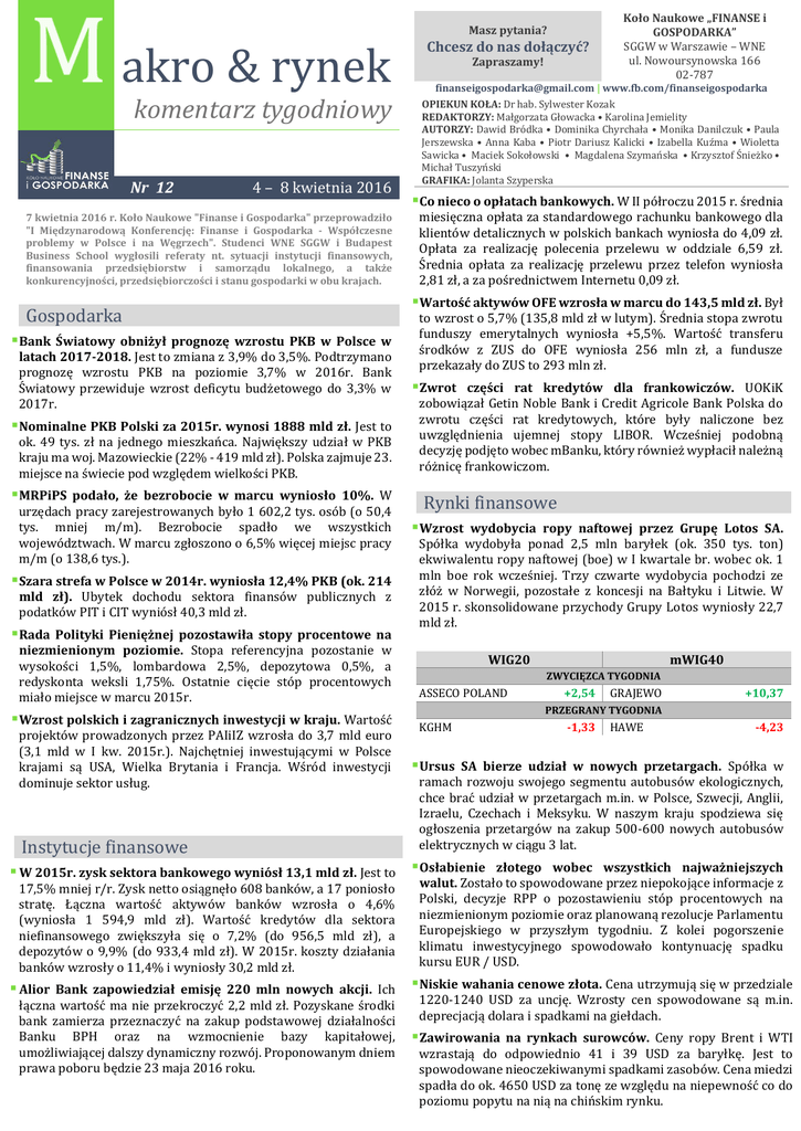 akro & rynek komentarz tygodniowy Nr 12 4 – 8 kwietnia 2016 7 kwietnia 2016 r. Koło Naukowe "Finanse i Gospodarka" przeprowadziło "I Międzynarodową Konferencję: Finanse i Gospodarka - Współczesne problemy w Polsce i na Węgrzech". Studenci WNE SGGW i Budapest Business School wygłosili referaty nt. sytuacji instytucji finansowych, finansowania przedsiębiorstw i samorządu lokalnego, a także konkurencyjności, przedsiębiorczości i stanu gospodarki w obu krajach. Gospodarka Bank Światowy obniżył prognozę wzrostu PKB w Polsce w latach 2017-2018. Jest to zmiana z 3,9% do 3,5%. Podtrzymano prognozę wzrostu PKB na poziomie 3,7% w 2016r. Bank Światowy przewiduje wzrost deficytu budżetowego do 3,3% w 2017r. Nominalne PKB Polski za 2015r. wynosi 1888 mld zł. Jest to ok. 49 tys. zł na jednego mieszkańca. Największy udział w PKB kraju ma woj. Mazowieckie (22% - 419 mld zł). Polska zajmuje 23. miejsce na świecie pod względem wielkości PKB. MRPiPS podało, że bezrobocie w marcu wyniosło 10%. W urzędach pracy zarejestrowanych było 1 602,2 tys. osób (o 50,4 tys. mniej m/m). Bezrobocie spadło we wszystkich województwach. W marcu zgłoszono o 6,5% więcej miejsc pracy m/m (o 138,6 tys.). Szara strefa w Polsce w 2014r. wyniosła 12,4% PKB (ok. 214 mld zł). Ubytek dochodu sektora finansów publicznych z podatków PIT i CIT wyniósł 40,3 mld zł. Rada Polityki Pieniężnej pozostawiła stopy procentowe na niezmienionym poziomie. Stopa referencyjna pozostanie w wysokości 1,5%, lombardowa 2,5%, depozytowa 0,5%, a redyskonta weksli 1,75%. Ostatnie cięcie stóp procentowych miało miejsce w marcu 2015r. Wzrost polskich i zagranicznych inwestycji w kraju. Wartość projektów prowadzonych przez PAIiIZ wzrosła do 3,7 mld euro (3,1 mld w I kw. 2015r.). Najchętniej inwestującymi w Polsce krajami są USA, Wielka Brytania i Francja. Wśród inwestycji dominuje sektor usług. Masz pytania? Chcesz do nas dołączyć? Zapraszamy! Koło Naukowe „FINANSE i GOSPODARKA” SGGW w Warszawie – WNE ul. Nowoursynowska 166 02-787 [email protected] | www.fb.com/finanseigospodarka OPIEKUN KOŁA: Dr hab. Sylwester Kozak REDAKTORZY: Małgorzata Głowacka • Karolina Jemielity AUTORZY: Dawid Bródka • Dominika Chyrchała • Monika Danilczuk • Paula Jerszewska • Anna Kaba • Piotr Dariusz Kalicki • Izabella Kuźma • Wioletta Sawicka • Maciek Sokołowski • Magdalena Szymańska • Krzysztof Śnieżko • Michał Tuszyński GRAFIKA: Jolanta Szyperska Co nieco o opłatach bankowych. W II półroczu 2015 r. średnia miesięczna opłata za standardowego rachunku bankowego dla klientów detalicznych w polskich bankach wyniosła do 4,09 zł. Opłata za realizację polecenia przelewu w oddziale 6,59 zł. Średnia opłata za realizację przelewu przez telefon wyniosła 2,81 zł, a za pośrednictwem Internetu 0,09 zł. Wartość aktywów OFE wzrosła w marcu do 143,5 mld zł. Był to wzrost o 5,7% (135,8 mld zł w lutym). Średnia stopa zwrotu funduszy emerytalnych wyniosła +5,5%. Wartość transferu środków z ZUS do OFE wyniosła 256 mln zł, a fundusze przekazały do ZUS to 293 mln zł. Zwrot części rat kredytów dla frankowiczów. UOKiK zobowiązał Getin Noble Bank i Credit Agricole Bank Polska do zwrotu części rat kredytowych, które były naliczone bez uwzględnienia ujemnej stopy LIBOR. Wcześniej podobną decyzję podjęto wobec mBanku, który również wypłacił należną różnicę frankowiczom. Rynki finansowe Wzrost wydobycia ropy naftowej przez Grupę Lotos SA. Spółka wydobyła ponad 2,5 mln baryłek (ok. 350 tys. ton) ekwiwalentu ropy naftowej (boe) w I kwartale br. wobec ok. 1 mln boe rok wcześniej. Trzy czwarte wydobycia pochodzi ze złóż w Norwegii, pozostałe z koncesji na Bałtyku i Litwie. W 2015 r. skonsolidowane przychody Grupy Lotos wyniosły 22,7 mld zł. WIG20 mWIG40 ZWYCIĘZCA TYGODNIA ASSECO POLAND +2,54 GRAJEWO +10,37 PRZEGRANY TYGODNIA KGHM -1,33 HAWE -4,23 Ursus SA bierze udział w nowych przetargach. Spółka w Instytucje finansowe ramach rozwoju swojego segmentu autobusów ekologicznych, chce brać udział w przetargach m.in. w Polsce, Szwecji, Anglii, Izraelu, Czechach i Meksyku. W naszym kraju spodziewa się ogłoszenia przetargów na zakup 500-600 nowych autobusów elektrycznych w ciągu 3 lat. 17,5% mniej r/r. Zysk netto osiągnęło 608 banków, a 17 poniosło stratę. Łączna wartość aktywów banków wzrosła o 4,6% (wyniosła 1 594,9 mld zł). Wartość kredytów dla sektora niefinansowego zwiększyła się o 7,2% (do 956,5 mld zł), a depozytów o 9,9% (do 933,4 mld zł). W 2015r. koszty działania banków wzrosły o 11,4% i wyniosły 30,2 mld zł. walut. Zostało to spowodowane przez niepokojące informacje z Polski, decyzje RPP o pozostawieniu stóp procentowych na niezmienionym poziomie oraz planowaną rezolucje Parlamentu Europejskiego w przyszłym tygodniu. Z kolei pogorszenie klimatu inwestycyjnego spowodowało kontynuację spadku kursu EUR / USD. łączna wartość ma nie przekroczyć 2,2 mld zł. Pozyskane środki bank zamierza przeznaczyć na zakup podstawowej działalności Banku BPH oraz na wzmocnienie bazy kapitałowej, umożliwiającej dalszy dynamiczny rozwój. Proponowanym dniem prawa poboru będzie 23 maja 2016 roku. 1220-1240 USD za uncję. Wzrosty cen spowodowane są m.in. deprecjacją dolara i spadkami na giełdach. W 2015r. zysk sektora bankowego wyniósł 13,1 mld zł. Jest to Osłabienie złotego wobec wszystkich najważniejszych Alior Bank zapowiedział emisję 220 mln nowych akcji. Ich Niskie wahania cenowe złota. Cena utrzymują się w przedziale Zawirowania na rynkach surowców. Ceny ropy Brent i WTI wzrastają do odpowiednio 41 i 39 USD za baryłkę. Jest to spowodowane nieoczekiwanymi spadkami zasobów. Cena miedzi spadła do ok. 4650 USD za tonę ze względu na niepewność co do poziomu popytu na nią na chińskim rynku. Spółka tygodnia Talex S.A. jest spółką informatyczną o szerokim spektru