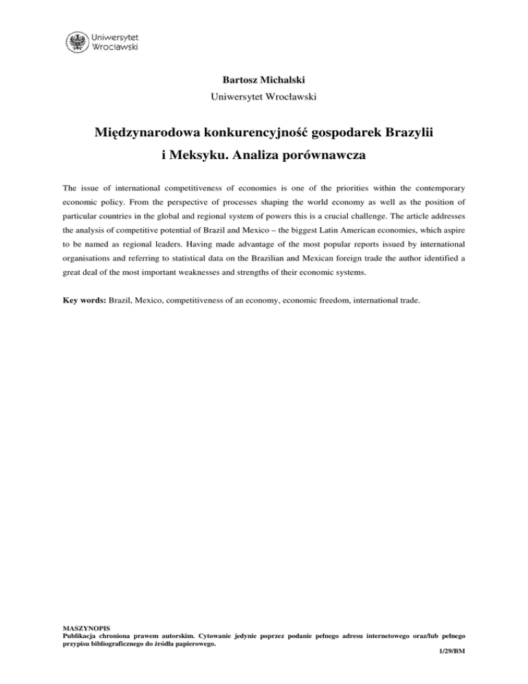 Bartosz Michalski Uniwersytet Wrocławski Międzynarodowa konkurencyjność gospodarek Brazylii i Meksyku. Analiza porównawcza The issue of international competitiveness of economies is one of the priorities within the contemporary economic policy. From the perspective of processes shaping the world economy as well as the position of particular countries in the global and regional system of powers this is a crucial challenge. The article addresses the analysis of competitive potential of Brazil and Mexico – the biggest Latin American economies, which aspire to be named as regional leaders. Having made advantage of the most popular reports issued by international organisations and referring to statistical data on the Brazilian and Mexican foreign trade the author identified a great deal of the most important weaknesses and strengths of their economic systems. Key words: Brazil, Mexico, competitiveness of an economy, economic freedom, international trade. MASZYNOPIS Publikacja chroniona prawem autorskim. Cytowanie jedynie poprzez podanie pełnego adresu internetowego oraz/lub pełnego przypisu bibliograficznego do źródła papierowego. 1/29/BM Wprowadzenie Pierwsza dekada XXI wieku była okresem, w którym stopniowo zarysowało się rosnące polityczno-gospodarcze znaczenie państw tzw. Południa 1 . To przesunięcie w globalnym układzie sił sprawia, że warto przy tej okazji przyjrzeć się stricte ekonomicznym uwarunkowaniom tych procesów, uwzględniając w szczególności problematykę międzynarodowej konkurencyjności gospodarek latynoamerykańskich regionalnych liderów – Brazylii i Meksyku – by w ten sposób umożliwić kompleksową ocenę perspektyw dalszego rozwoju wspomnianych trendów. Celem artykułu jest zatem przeprowadzenie analizy porównawczej potencjału konkurencyjnego tych dwóch wspomnianych krajów. Autor wykorzystał w pracy schemat analityczny stosowany w raportach wybranych organizacji międzynarodowych, które zajmują się zarówno zagadnieniem konkurencyjności gospodarek, jak i zjawiskami (procesami) z nimi powiązanymi2. Ostatnia część to z kolei obliczenia własne na podstawie danych Światowej Organizacji Handlu (WTO) oraz Organizacji Narodów Zjednoczonych. Posiadanie konkurencyjnej gospodarki jest współcześnie niezwykle istotną kwestią. Warunkiem koniecznym jest tutaj określenie, co konkurencyjność determinuje (w znaczeniu konkurencyjności czynnikowej oraz systemowej3) oraz jak te atuty oceniane są z perspektywy środowisk biznesowych i świata nauki. Konfrontacja strategicznej wizji politycznej z interesami zarówno krajowych, jak i międzynarodowych przedsiębiorstw pozwala z jednej strony odpowiednio wcześnie skorygować przyjęty kierunek reform, z drugiej zaś utrwalać silne strony i identyfikować słabe. 1 W tym kontekście można użyć zyskującego międzynarodową popularność akronimu BRIC. Autor ma tutaj na myśli kwestię swobody prowadzenia działalności gospodarczej, zakres wolności inwestycyjnej, atrakcyjność inwestycyjną, poziom korupcji itp. 3 Zob. m..in. J. Misala, Istota i znaczenie wykorzystania przewag komparatywnych w rozwoju gospodarczym oraz metody ich analizy, [w:] Teoria i polityka wzrostu gospodarczego – osiągnięcia i doświadczenia, red. J. Misala, CeDeWu, Warszawa 2010, s. 17 i nast. Warto ponadto sięgnąć do A. Wziątek-Kubiak, Międzynarodowa specjalizacja a konkurencyjność, „Ekonomista” nr 4/2001, E.M. Pluciński, Konkurencyjność strukturalna polskiej gospodarki na wspólnym rynku Unii Europejskiej, Instytut Stosunków Międzynarodowych Uniwersytetu Warszawskiego, Warszawa 2005, s. 28 i nast., W. Bieńkowski, Studies on national competitiveness at the time of globalization and economic integration; some critical remarks on the issues, „Optimum – Studia Ekonomiczne” nr 1(33)/2007, A. Lipowski, Some fallacies in the interpretation of competitiveness, „Optimum – Studia Ekonomiczne” nr 3(35)/2007, Kompendium wiedzy o konkurencyjności, red. M. Gorynia, E. Łaźniewska, PWN, Warszawa 2009, J. Misala, Międzynarodowa konkurencyjność gospodarki narodowej, PWE, Warszawa 2011. 2 MASZYNOPIS Publikacja chroniona prawem autorskim. Cytowanie jedynie poprzez podanie pełnego adresu internetowego oraz/lub pełnego przypisu bibliograficznego do źródła papierowego. 2/29/BM Kształtowanie międzynarodowej konkurencyjności4 gospodarki stanowi w większości krajów jeden z priorytetowych celów narodowej polityki gospodarczej, stąd zasadnym jest wskazać określone czynniki wewnętrzne, jak i zewnętrzne, które w największym stopniu determinują sytuację w wybranych do analizy krajach. Zastrzec jednocześnie należy, że zawarte w tym opracowaniu rozważania stanowią jedynie pewien syntetyczny wycinek wiedzy. Uwagi metodologiczne Ocena międzynarodowej konkurencyjności gospodarki wymaga zastosowania ścisłego aparatu pojęciowego 5 . Kluczowym elementem jest tutaj zdefiniowanie samego pojęcia konkurencyjności. Powszechnie przyjmuje się dwa sposoby jej rozumienia – jako zdolności konkurencyjnej (tzw. konkurencyjności czynnikowej) oraz pozycji konkurencyjnej (tzw. konkurencyjności wynikowej). Zaprezentowane w toku poniższych rozważań rankingi odwołują się bezpośrednio lub pośrednio do tych dwóch kategorii (choć większy nacisk kładzie się zwykle na tę pierwszą). Zasadniczo można przyjąć, że międzynarodowa konkurencyjność gospodarki jest wielowymiarową cechą, na którą składają się określone zdolności. Są nimi: • zdolność do przyciągania mobilnych czynników produkcji (ang. ability to attract; chodzi tu o przyciąganie kapitału, który wspiera dynamikę wzrostu i rozwoju gospodarczego, m.in. poprzez zaawansowane technologie, oraz przyciąganie do kraju lub zatrzymywanie w kraju wysoko wykwalifikowanych specjalistów), • zdolność do sprzedawania (ang. ability to sell; rozumiana jest ona zarówno w kategoriach ilościowych, jak i 
