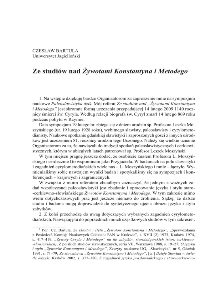 Czesław Bartula Uniwersytet Jagielloński Ze studiów nad Żywotami Konstantyna i Metodego 1. Na wstępie dziękuję bardzo Organizatorom za zaproszenie mnie na sympozjum naukowe Paleoslawistyka dziś. Mój referat Ze studiów nad „Żywotami Konstantyna i Metodego” jest skromną formą uczczenia przypadającej 14 lutego 2009 1140 rocznicy śmierci św. Cyryla. Według relacji biografa św. Cyryl zmarł 14 lutego 869 roku podczas pobytu w Rzymie. Data sympozjum 19 lutego br. zbiega się z dniem urodzin śp. Profesora Leszka Moszyńskiego (ur. 19 lutego 1928 roku), wybitnego slawisty, paleoslawisty i cyrylometodianisty. Naukowe spotkanie gdańskiej slawistyki i zaproszonych gości z innych ośrodków jest uczczeniem 81. rocznicy urodzin tego Uczonego. Należy się wielkie uznanie Organizatorom za to, że nawiązali do tradycji spotkań paleoslawistycznych i cerkiewistycznych, którym w ubiegłych latach patronował śp. Profesor Leszek Moszyński. W tym miejscu pragnę jeszcze dodać, że osobiście znałem Profesora L. Moszyńskiego i serdecznie Go wspominam jako Przyjaciela. W badaniach na polu slawistyki i zagadnień cyrylometodiańskich wiele nas – L. Moszyńskiego i mnie – łączyło. Wymienialiśmy sobie nawzajem wyniki badań i spotykaliśmy się na sympozjach i konferencjach – krajowych i zagranicznych. W związku z moim referatem chciałbym zaznaczyć, że jednym z ważnych zadań współczesnej paleoslawistyki jest zbadanie i opracowanie języka i stylu staro ‑cerkiewno‑słowiańskiego Żywotów Konstantyna i Metodego. W tym zakresie mimo wielu dotychczasowych prac jest jeszcze niemało do zrobienia. Sądzę, że dalsze studia i badania mogą doprowadzić do syntetycznego ujęcia obrazu języka i stylu zabytków. 2. Z kolei przechodzę do uwag dotyczących wybranych zagadnień cyrylometodiańskich. Nawiązuję tu do poprzednich moich cząstkowych studiów w tym zakresie1. 1 Por.: Cz. Bartula, Ze składni i stylu „Żywotów Konstantyna i Metodego”, „Sprawozdania z Posiedzeń Komisji Naukowych Oddziału PAN w Krakwie”, t. XVII (2) 1973, Kraków 1974, s. 417–419; „Żywoty Cyryla i Metodego” na tle zabytków starobułgarskich (staro‑cerkiewno ‑słowiańskich), Z polskich studiów slawistycznych, seria VII, Warszawa 1988, s. 19–27; O języku i stylu „Żywotów Konstantyna i Metodego”, Zeszyty naukowe UG, „Slawistyka”, nr 5, Gdańsk 1991, s. 71–79; Ze słownictwa „Żywotów Konstantyna i Metodego”, [w:] Dzieje Słowian w świe‑ tle leksyki, Kraków 2002, s. 377–380; Z zagadnień języka prasłowiańskiego i staro‑cerkiewno 12 Czesław Bartula Żywoty Konstantyna i Metodego (dalej: ŻKM, ŻK, ŻM)2 jako oryginalne dzieło literackie, a nie tylko historyczne, są zróżnicowane pod względem tekstowym. W poszczególnych częściach i rozdziałach oprócz tekstów dotyczących wydarzeń historycznych przeplatają się w różnej proporcji teksty treści biograficzno‑hagiograficznej, religijno‑teologiczno‑filozoficznej i apologetycznej. ŻK jako obszerniejsza część dzieła opowiada szerzej o pewnych wcześniejszych wydarzeniach, o dysputach prowadzonych przez Konstantyna z przeciwnikami na tematy wiary, religii, Boga, Trójcy Świętej itp., jak też o wprowadzeniu języka słowiańskiego do liturgii kościelnej. W ŻK znajdujemy też ciekawe fragmenty tekstów o charakterze hagiograficznym, jak opowieści o cudach i nadzwyczajnych czynach bohatera utworu. Według relacji biografów Konstantyn zajmował czołowe miejsce w pierwszych latach działalności misyjnej braci sołuńskich i ich pomocników. Miał on wszechstronne wykształcenie i był wybitnym teologiem, filozofem i filologiem. Znał szereg języków europejskich i pozaeuropejskich i posługiwał się nimi w większym lub mniejszym stopniu. Na temat lat nauki Konstantyna, jego studiów i działalności nauczycielskiej w cesarskiej akademii w Bizancjum, jak też o pracy przekładowej z jednego języka na drugi oraz o wyprawach misyjnych lub poselskich znajdujemy sporo wiadomości w spisanej po jego śmierci biografii, w której Konstantyn występuje z zaszczytnym przydomkiem „Filozof” (ŻK, rozdz. III–VI, VIII–XIV). ŻM pod względem objętości jest przeszło dwa razy mniejszy od ŻK, w związku z czym jest bardziej zwięzły. Uzupełnia on i rozwija tekst poprzedniej biografii, dodaje nowe fakty i wydarzenia mające związek z działalnością Metodego po śmierci Konstantyna Filozofa, tj. po roku 869. Dotychczas św. Metody pozostawał jakby w cieniu młodszego brata, z biografii jednak można wnioskować, że bardzo pomagał Konstantynowi w jego poczynaniach i ściśle z nim współpracował. Nie brak też w ŻM tematyki teologiczno‑historycznej i fragmentów hagiograficznych, choć w mniejszym stopniu niż w ŻK. W biografii podkreślane są zdolności prawnicze i administracyjne Metodego, jak też inne jego dodatnie cechy (ŻM, rozdz. II, IV). Z biegiem czasu doszedł Metody do godności arcybiskupa (ŻM, rozdz. X). Metody konsekwentnie kontynuował rozpoczętą wraz z Konstantynem Filozofem pracę nad słowiańskim językiem literackim i liturgicznym. Pod koniec życia pracował usilnie nad kolejnymi przekładami tekstów biblijnych z języka greckiego na ‑ słowiańskiego, „Biuletyn PTJ”, zesz. LVIII, Kraków 2002, s. 137–147; Z problematyki języko‑ znawczej w „Żywotach Konstantyna i Metodego”, „Amoenitates vel lepores philologiae”, Kraków 2007, s. 366–369. 2 Por.: T. Lehr‑Spławiński, „Żywoty Konstantyna i Metodego” (obszerne). Przekład polski ze wstępem i objaśnieniami wraz z dodatkiem zrekonstruowanych tekstów staro‑cerkiewno‑słowiańskich, Poznań 1959; Konstantyn i Metody. Zarys monograficzny z wyborem źródeł, uzupełnił i słowem wstępnym poprzedził F. Sławski, Warszawa 1967. Cytaty z rozdziałów ŻKM podaję według stron pierwszego z wymienionych wydań: „Żywoty Konstantyna i Metodego”. Prz