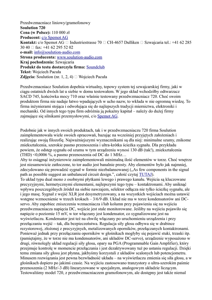Przedwzmacniacz liniowy/gramofonowy Soulution 720 Cena (w Polsce): 110 000 zł Producent: c/o Spemot AG Kontakt: c/o Spemot AG ǀ Industriestrasse 70 ǀ CH-4657 Dulliken ǀ Szwajcaria tel.: +41 62 285 30 40 ǀ fax: +41 62 295 52 02 e-mail: [email protected] Strona producenta: www.soulution-audio.com Kraj pochodzenia: Szwajcaria Produkt do testu dostarczyła firma: Soundclub Tekst: Wojciech Pacuła Zdjęcia: Soulution (nr. 1, 2, 4) ǀ Wojciech Pacuła Przedwzmacniacz Soulution dopełnia wirtualny, topowy system tej szwajcarskiej firmy, jaki w ciągu ostatnich dwóch lat u siebie w domu testowałem. W jego skład wchodziłby odtwarzacz SACD 745, końcówka mocy 710 oraz właśnie testowany przedwzmacniacz 720. Choć swoim produktom firma nie nadaje łatwo wpadających w ucho nazw, to wkłada w nie ogromną wiedzę. To firma inżynierami stojąca i odwołująca się do najlepszych tradycji miernictwa, elektroniki i mechaniki. Od innych tego typu firm odróżnia ją pokaźny kapitał – należy do dużej firmy zajmujące się silnikami przemysłowymi, c/o Spemot AG. Podobnie jak w innych swoich produktach, tak i w przedwzmacniaczu 720 firma Soulution zaimplementowała wiele swoich opracowań, bazując na wcześniej przyjętych założeniach i realizując swoją filozofię. Najważniejszymi wyznacznikami są dla niej: minimalne szumy, znikome zniekształcenia, szerokie pasmo przenoszenia i ultra-krótka ścieżka sygnału. Dla przykładu powiem, że odstęp sygnału od szumu w tym urządzeniu wynosi 130 dB (tak!), zniekształcenia (THD) <0,0006 %, a pasmo przenoszenia od DC do 1 MHz… Aby to osiągnąć inżynierowie zaimplementowali minimalną ilość elementów w torze. Choć wnętrze jest niesamowicie zatłoczone, to tor audio jest banalnie prosty. Aby elementów było jak najmniej, zdecydowano się prowadzić sygnał w formie niezbalansowanej („As few components in the signal path as possible suggest an unbalanced circuit design.”, całość czytaj TUTAJ). To układ typu dual mono z osobnymi płytkami lewego i prawego kanału. Wejścia są kluczowane precyzyjnymi, hermetycznymi elementami, najlepszymi tego typu – kontaktronami. Aby uniknąć wpływu poszczególnych źródeł na siebie nawzajem, selektor odłącza nie tylko ścieżkę sygnału, ale i jego masę. Sygnał z wejść XLR jest desymetryzowany, a na wszystkich wejściach można ustawić wstępne wzmocnienie w trzech krokach – 3/6/9 dB. Układ nie ma w torze kondensatorów ani DCservo. Aby zapobiec zniszczeniu wzmacniacza i/lub kolumn przy pojawieniu się na wejściu przedwzmacniacza napięcia DC, wejście jest stale monitorowane. Jeśliby na wejściu pojawiło się napięcie o poziomie 15 mV, w tor włączany jest kondensator, co sygnalizowane jest na wyświetlaczu. Kondensator jest też na chwilę włączany po uruchomieniu urządzenia i przy przełączaniu wejść – tak, dla bezpieczeństwa. Regulacja siły głosu odbywa się w drabince rezystorowej, złożonej z precyzyjnych, metalizowanych oporników, przełączanych kontaktronami. Ponieważ jednak przy przełączaniu oporników w głośnikach mogłyby się pojawić stuki, trzaski itp. (pamiętajmy, że w torze nie ma kondensatorów, ani układów DC-servo), urządzenie wyposażono w drugi, równoległy układ regulacji siły głosu, opary na PGA (Programmable Gain Amplifier), który przejmuje kontrolę w momencie przełączania i jest dezaktywowany tuż po ustaniu regulacji. Dzięki temu zmiana siły głosu jest płynna, jakbyśmy korzystali z układów scalonych lub potencjometru. Minusem rozwiązania jest pewna bezwładność układu – na wyświetlaczu zmienia się siła głosu, a w głośnikach dopiero po jakimś czasie. Na wyjściu zastosowano tranzystory o ultra-szerokim paśmie przenoszenia (2 MHz/-3 dB) linearyzowane w specjalnym, analogowym układzie liczącym. Testowaliśmy model 720, z przedwzmacniaczem gramofonowym, ale dostępny jest także niemal identyczny model 721, bez przedwzmacniacza. Niestety, ze względu na czas, test dotyczył tylko sekcji liniowej. Przypomnę, że wzmacniacz mocy tej firmy, stereofoniczna końcówka 710, od prawie dwóch lat jest częścią mojego systemu odsłuchowego. Do tej pory pisaliśmy o Soulution: • • • • TEST: odtwarzacz Super Audio CD Soulution 745, czytaj TUTAJ TEST: odtwarzacz Super Audio CD Soulution 540, czytaj TUTAJ NAGRODA: Best Sound High End 2010 dla system Soulution, czytaj TUTAJ ODSŁUCH Płyty użyte do odsłuchu (wybór): • Audio Accesory - T-TOC Records High Quality Data Master Comparison, TDVD-0002, DVD-R (2011), ripy 16/44,1, 24/96, 24/192 FLAC. • Paganini for two, Gil Shaham, Göran Söllscher, Deutsche Grammophon/JVC, 480 246-5, XRCD24 (1993/2009). • Stereo Sound Reference Record. Jazz&Vocal, Stereo Sound, SSRR4, SACD/CD (2010). • Stereo Sound Reference Record. Nobu’s Popular Selection, Stereo Sound, SSRR5, SACD/CD (2010). • André Previn, After Hours, Telarc/Lasting Impression Music, LIM UHD 051, CD (1989/2011). • Assemblage 23, Bruise, Accession Records, A 128, Limited Edition, 2 x CD (2012). • Beverly Kenney, Beverly Kenney sings for Johnny Smith, Roost Records/EMI Music Japan, TOCJ-9731, CD (1956/2012). • Clan of Xymox, Subsequent Pleasures, Metropolis, Met 204, CD (1983/2001). • Depeche Mode, Personal Jesus 2011, Sire/Reprise 21328-2, MS CD (2011). • Dominic Miller & Neil Stancey, New Dawn, Naim, naimcd066, CD (2002). • Dominic Miller, Fourth Wall, Q-rious Music, QRM 108-2, CD (2006); recenzja TUTAJ. • e.s.t. Esbjörn Svenson Trio, 301, ACT Music + Vision, ACT 9029-2, CD (2012). • Handel, La Maga Abbandonata, Simone Kermes, Maite Baumont, Il Complesso Barocco, dyr. Alan Curtis, Deutsche Harmonia Mundi/Sony Music Entertainment, CD 88697846212, CD (2003/2011). • McCoy Tyner, Nights of Ballads & Blues, Impulse!, IMP 12212, 20-bit Super Mapping, CD (1963/1997). • Me Myself And I, Do Not Cover, Creative Music, 005, CD (2012). • Pat Metheny Group, Offramp
