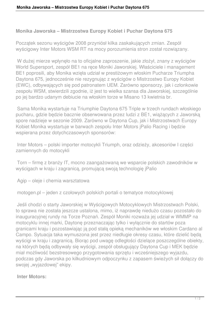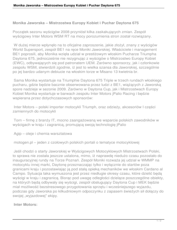 Monika Jaworska – Mistrzostwa Europy Kobiet i Puchar Daytona 675 Monika Jaworska – Mistrzostwa Europy Kobiet i Puchar Daytona 675 Początek sezonu wyścigów 2008 przyniósł kilka zaskakujących zmian. Zespół wyścigowy Inter Motors WSM RT na mocy porozumienia stron został rozwiązany. W dużej mierze wpłynęło na to oficjalne zaproszenie, jakie złożył, znany z wyścigów World Supersport, zespół BE1 na ręce Moniki Jaworskiej. Właściciele i management BE1 poprosili, aby Monika wzięła udział w prestiżowym włoskim Pucharze Triumpha Daytona 675, jednocześnie nie rezygnując z wyścigów o Mistrzostwo Europy Kobiet (EWC), odbywających się pod patronatem UEM. Zarówno sponsorzy, jak i członkowie zespołu WSM, stwierdzili zgodnie, iż jest to wielka szansa dla Jaworskiej, szczególnie po jej bardzo udanym debiucie na włoskim torze w Misano 13 kwietnia br. Sama Monika wystartuje na Triumphie Daytona 675 Triple w trzech rundach włoskiego pucharu, gdzie będzie bacznie obserwowana przez ludzi z BE1, wiążących z Jaworską spore nadzieje w sezonie 2009. Zarówno w Daytona Cup, jak i Mistrzostwach Europy Kobiet Monika wystartuje w barwach zespołu Inter Motors jPalio Racing i będzie wspierana przez dotychczasowych sponsorów: Inter Motors – polski importer motocykli Triumph, oraz odzieży, akcesoriów I części zamiennych do motocykli Torn – firmę z branży IT, mocno zaangażowaną we wsparcie polskich zawodników w wyścigach w kraju i zagranicą, promującą swoją technologię jPalio Agip – oleje i chemia warsztatowa motogen.pl – jeden z czołowych polskich portali o tematyce motocyklowej Jeśli chodzi o starty Jaworskiej w Wyścigowych Motocyklowych Mistrzostwach Polski, to sprawa nie została jeszcze ustalona, mimo, iż naprawdę niedużo czasu pozostało do inauguracyjnej rundy na Torze Poznań. Zespół Moniki rozważa jej udział w WMMP na motocyklu innej marki, Daytonę przeznaczając tylko i wyłącznie do startów poza granicami kraju i pozostawiając ją pod stałą opieką mechaników we włoskim Cardano al Campo. Sytuacja taka wymuszona jest przez niedługie okresy czasu, które dzielić będą wyścigi w kraju i zagranicą. Biorąc pod uwagę odległości dzielące poszczególne obiekty, na których będą odbywały się wyścigi, zespół obsługujący Daytona Cup i MEK będzie miał możliwość bezstresowego przygotowania sprzętu i wcześniejszego wyjazdu, podczas gdy Jaworska po kilkudniowym odpoczynku z zapasem świeżych sił dołączy do swojej „wyjazdowej” ekipy. Inter Motors: 1/2 Monika Jaworska – Mistrzostwa Europy Kobiet i Puchar Daytona 675 Monika jest naszym oczkiem w głowie. Kiedy pojawiła się szansa, aby, oprócz Mistrzostw Europy Kobiet, pojechała we włoskim pucharze Triumpha, nikt z nas nie wahał się ani chwili. Tej szansy nie można było zmarnować! Nie każdemu będzie ona dana i nie każdy będzie mógł z takiego zrządzenia losu skorzystać. Monika potrafi znakomicie pojechać na każdym motocyklu, a jej pierwszy start na Triumphie we Włoszech pokazał, jak dojrzałą i znakomitą jest zawodniczką, oraz jaki ogromny potencjał drzemie w Daytonie 675. Tak więc zaopatrzona w przygotowany do wyścigów motocykl i cały osprzęt zawodnika, Jaworska będzie walczyć o wyścigowe laury w dwóch prestiżowych seriach. Jeśli chodzi o Mistrzostwa Polski, to Triumph na 100% nie zniknie z rodzimych wyścigów. Jest kilku zawodników zdecydowanych na starty, tak więc zarówno w mistrzowskiej klasie Superstock 600, jak i w Pucharze PZM będziemy oglądać zmagania „Trumpecików”. Torn: W wyścigi zaangażowani jesteśmy od 2005 roku, kiedy to wspieraliśmy zespół z zupełnie nietypowym motocyklem – Buell. Dłuższy czas poświęciliśmy na rozwój marki Torn, jako zespołu wyścigowego, kiedy w sezonie 2006 i 2007 mieliśmy własny team jadący na zielonych motocyklach Kawasaki, jednocześnie sporo uwagi poświęciliśmy BMW F800 Cup, w bieżącym sezonie stając się jego oficjalnym partnerem. Nie przestajemy jednocześnie wspierać pojedynczych zawodników, wystarczy wspomnieć chociażby Marcina Kałdowskiego i jego udział w IDM, czy niezmordowaną Kasię Kędzior, która znów pojawi się, jako zawodniczka w sezonie 2008. Co do Moniki Jaworskiej – decyzja była szybka i niezwykle trafna. Ta dziewczyna posiada ogromny potencjał i jest niesamowicie zaangażowana w sport motocyklowy, cieszymy się, że możemy wspierać ją i dawać jej szansę na zaistnienie na europejskiej arenie wyścigów. Ponadto sama idea ścigania na motocyklu marki Triumph, jakże różnym od znanych japońskich marek, stanowiła dla nas dodatkowy bodziec do działania. Duet Jaworska / Daytona nie może pozostać niezauważony! Monika Jaworska: Przyznam szczerze, że mój start w MP stanął pod znakiem zapytania, ale prowadzimy rozmowy z jednym z zespołów, w którego barwach mogłabym wystartować. Chciałabym wyrazić moje ogromne podziękowania i wielką wdzięczność sponsorowi i firmie Inter Motors w osobie P. Krzysztofa Króla, który umożliwił mi start w ME i Pucharze Triumph, firmie TORN, AGIP. Postaram się nie zawieść i osiągnąć jak najlepsze wyniki. Dziękuję mojej najlepszej przyjaciółce Monice i Olafowi, którzy angażują mnóstwo czasu, abym mogła wystartować i będą mi towarzyszyć. Źródło: www.motogen.pl 2/2