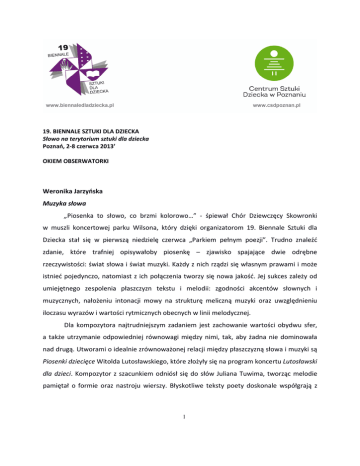 19. BIENNALE SZTUKI DLA DZIECKA Słowo na terytorium sztuki dla dziecka Poznań, 2-8 czerwca 2013’ OKIEM OBSERWATORKI Weronika Jarzyńska Muzyka słowa „Piosenka to słowo, co brzmi kolorowo…” - śpiewał Chór Dziewczęcy Skowronki w muszli koncertowej parku Wilsona, który dzięki organizatorom 19. Biennale Sztuki dla Dziecka stał się w pierwszą niedzielę czerwca „Parkiem pełnym poezji”. Trudno znaleźć zdanie, które trafniej opisywałoby piosenkę – zjawisko spajające dwie odrębne rzeczywistości: świat słowa i świat muzyki. Każdy z nich rządzi się własnym prawami i może istnieć pojedynczo, natomiast z ich połączenia tworzy się nowa jakość. Jej sukces zależy od umiejętnego zespolenia płaszczyzn tekstu i melodii: zgodności akcentów słownych i muzycznych, nałożeniu intonacji mowy na strukturę meliczną muzyki oraz uwzględnieniu iloczasu wyrazów i wartości rytmicznych obecnych w linii melodycznej. Dla kompozytora najtrudniejszym zadaniem jest zachowanie wartości obydwu sfer, a także utrzymanie odpowiedniej równowagi między nimi, tak, aby żadna nie dominowała nad drugą. Utworami o idealnie zrównoważonej relacji między płaszczyzną słowa i muzyki są Piosenki dziecięce Witolda Lutosławskiego, które złożyły się na program koncertu Lutosławski dla dzieci. Kompozytor z szacunkiem odniósł się do słów Juliana Tuwima, tworząc melodie pamiętał o formie oraz nastroju wierszy. Błyskotliwe teksty poety doskonale współgrają z 1 muzyką Lutosławskiego, współczesną pod względem harmonii, ale okraszoną rodzimym folklorem. Odpowiednia relacja między płaszczyznami oznacza zgodność semantyki słowa z charakterem warstwy muzycznej. Melodia często uwypukla pewne cechy tekstu, wspomagając zarazem proces percepcji utworu, z drugiej jednak strony próba pójścia „na przekór” oraz zastosowanie niekonwencjonalnych pomysłów może przynieść zaskakujące efekty. Te dwie, niezmiernie elastyczne sfery dają ogromne pole do eksperymentu. Można skupić się na strukturze słowa i zmianach kolejności jego części składowych, można modyfikować fonetyczny element wyrazu, można interpretować muzyczne cechy języka, takie jak rytm, akcent i intonacja. Dziecko często zauważa te zależności, choćby podczas zabawy, kiedy to improwizuje tekst razem z melodią, moduluje wysokość dźwięku i barwę głosu. Słowo znajdujące się poza kontekstem semantycznym samo staje się dźwiękiem, a zatem budulcem w konstrukcji utworu muzycznego. Udane eksperymenty w dziedzinie łączenia słowa i muzyki zaprezentował Jarosław Kordaczuk na koncercie Słowoświaty. Jego piosenki przybliżyły publiczności najważniejsze kierunki i nurty w historii muzyki, przy czym charakterystyczne cechy poszczególnych gatunków potraktowane zostały z przymrużeniem oka. Uwagę zwracały utwory, w których tekst nie miał na celu przekazania informacji, stanowił natomiast kolejną ścieżkę foniczną w gąszczu bogato zinstrumentowanego dzieła. Twórcze wykorzystanie brzmienia słowa zaprezentowane w muzycznych wydarzeniach Biennale podkreśla jego wielowymiarowość i dowodzi, że zazwyczaj zawęża się jego kulturową funkcję, ogranicza się je do bycia jedynie narzędziem służącym do przesyłania komunikatu. Muzyka przywraca słowu pełnię wyrazu. 2