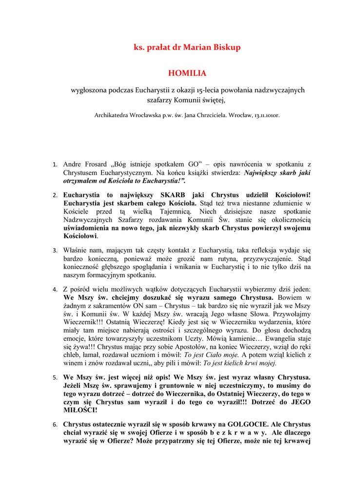 ks. prałat dr Marian Biskup HOMILIA wygłoszona podczas Eucharystii z okazji 15-lecia powołania nadzwyczajnych szafarzy Komunii świętej, Archikatedra Wrocławska p.w. św. Jana Chrzciciela. Wrocław, 13.11.1010r. 1. Andre Frosard „Bóg istnieje spotkałem GO” – opis nawrócenia w spotkaniu z Chrystusem Eucharystycznym. Na końcu książki stwierdza: Największy skarb jaki otrzymałem od Kościoła to Eucharystia!”. 2. Eucharystia to największy SKARB jaki Chrystus udzielił Kościołowi! Eucharystia jest skarbem całego Kościoła. Stąd też trwa niestanne zdumienie w Kościele przed tą wielką Tajemnicą. Niech dzisiejsze nasze spotkanie Nadzwyczajnych Szafarzy rozdawania Komunii Św. stanie się okolicznością uświadomienia na nowo tego, jak niezwykły skarb Chrystus powierzył swojemu Kościołowi. 3. Właśnie nam, mającym tak częsty kontakt z Eucharystią, taka refleksja wydaje się bardzo konieczną, ponieważ może grozić nam rutyna, przyzwyczajenie. Stąd konieczność głębszego spoglądania i wnikania w Eucharystię i to nie tylko dziś na naszym formacyjnym spotkaniu. 4. Z pośród wielu możliwych wątków dotyczących Eucharystii wybierzmy dziś jeden: We Mszy św. chciejmy doszukać się wyrazu samego Chrystusa. Bowiem w żadnym z sakramentów ON sam – Chrystus – tak bardzo się nie wyraził jak we Mszy św. i Komunii św. W każdej Mszy św. wracają Jego własne Słowa. Przywołajmy Wieczernik!!! Ostatnią Wieczerzę! Kiedy jest się w Wieczerniku wydarzenia, które miały tam miejsce nabierają ostrości i szczególnego wyrazu. Do głosu dochodzą emocje, które towarzyszyły uczestnikom Uczty. Mówią kamienie… Ewangelia staje się żywa!!! Chrystus mając przy sobie Apostołów, na koniec Wieczerzy, wziął do ręki chleb, łamał, rozdawał uczniom i mówił: To jest Ciało moje. A potem wziąl kielich z winem i znów rozdawał uczni,, aby pili i mówił: To jest kielich krwi mojej. 5. We Mszy św. jest więcej niż opis! We Mszy św. jest wyraz własny Chrystusa. Jeżeli Mszę św. sprawujemy i gruntownie w niej uczestniczymy, to musimy do tego wyrazu dotrzeć – dotrzeć do Wieczernika, do Ostatniej Wieczerzy, do tego w czym się Chrystus sam wyraził i do tego co wyraził!!! Dotrzeć do JEGO MIŁOŚCI! 6. Chrystus ostatecznie wyraził się w sposób krwawy na GOLGOCIE. Ale Chrystus chciał wyrazić się w swojej Ofierze i w sposób b e z k r w a w y. Ale dlaczego wyrazić się w Ofierze? Może przypatrzmy się tej Ofierze, może nie tej krwawej na krzyżu, którą lepiej rozumiemy, ale tej bezkrwawej – w Wieczerniku. Co to wszystko znaczy? 7. Postawmy podstawowe pytanie: Co znaczy chleb? Chleb to pokarm. Człowiek żyje pokarmem. Człowiek żyje chlebem!!! Chleb to jest pokarm, ale chleb to jest także m i ł o ś ć! – stąd ujawnia się troska o życie, o istnienie, pójdźmy dalej- troska o zbawienie. Chrystus, który łamie Chleb w Wieczerniku, chce przez to wyrazić ogromną MIŁOŚĆ – MIŁOŚĆ DO CZŁOWIEKA - do i dla którego posłał Go Ojciec. To jest inny wyraz, ale wyraz tej samej MIŁOŚCI. Jeżeli by można przetłumaczyć KRZYŻ na CHLEB, czy KRZYŻ na EUCHARYSTIĘ, to wówczas tłumaczymy MIŁOŚĆ na MIŁOŚĆ. Dwa wyrazy MIŁOŚCI, ale jednej i tej samej.!!! Tylko, ze ta krwawa, krzyżowa Ofiara Chrystusa, jest dla nas nie do ogarnięcia, my nie możemy w niej wprost i bezpośrednio wziąć udziału, ona nie jest do powtórzenia. Natomiast ta Ofiara Bezkrwawa, ta Ofiara Chleba i Wina z Wieczernika pozwala się ogarnąć, pozwala się powtórzyć i my możemy w niej wziąć udział naszą ofiarą!!! 8. Chrystus wyraża MIŁOŚĆ, MIŁOŚĆ OJCA, MIŁOŚĆ BOGA, który chce sobą karmić człowieka. Tę MIŁOŚĆ Ojca Chrystus przekłada na język OFIARY. On nas karmi swoją ofiarą, swoją OFIARĄ BEZKRWAWĄ, karmi nas jak CHLEBEM, karmi nasze dusze jak chlebem karmi się ciało. 9. Jest ścisły związek pomiędzy tym: dać się aż do wyniszczenia na KRZYŻU, a tym: dawać się wciąż bez końca w EUCHARYSTII. Nie tylko OFIARA BEZKRWAWA uobecnia KRWAWĄ, ale ona ją jakoś tłumaczy. I wzajemnie to KRWAWA OFIARA CHRYSTUSA są aż do wyniszczenia tłumaczy nam ofiarę BEZKRWAWĄ, EUCHARYSTYCZNĄ we Mszy sw. 10. Kiedy próbujemy dotknąć te WIELKIEJ TAJEMNICY naszej wiary, uchylić jej rąbka, choć trochę ją zrozumieć, choć trochę się w niej zorientować, w tej Wielkiej Tajemnicy Ołtarza, EUCHARTSTII, MSZY ŚW, to rodzi się potrzeba, aby poczuć się przedmiotem tej WIELKIEJ MIŁOŚĆI, TEGO OGROMNEGO UMIŁOWANIA, ODWIECZNEGO UMIŁOWANIA, KTÓRE PRZEBYŁO I WCIĄŻ PRZEBYWA OGROMNĄ DROGĘ, ABY DO CZŁOWIEKA , DO MNIE TRAFIĆ!!! Wielka jest MIŁOŚĆ, skoro może się w niej odnaleźć każdy człowiek. Nie ma człowieka, który nie mógłby siebie odnaleźć i siebie zmieścić w tej MIŁOŚCI. 11. Stąd właśnie płynie nasz chrześcijański optymizm, nasza chrześcijańska nadzieja w stosunku do człowieka. Czy nie doświadczacie tego Drodzy Nadzwyczajni Szafarze w waszej nadzwyczajnej posłudze eucharystycznej. Widzicie przecież wiele razy radość ludzi, którym przynosicie Komunię św. Dostrzegacie ludzi którzy odzyskali nadzieję. Widzicie często ludzi starszych i chorych, którzy z ufnością przyjmują Chrystusa Eucharystycznego. Widzicie wiarę ludzi samotnych i opuszczonych z radością czekających na spotkanie z Chrystusem, którego im niesiecie. NIE MOŻECIE TYCH WSZYSTKICH DOŚWIADCZEŃ ODKŁADAĆ W NIEPAMIĘĆ!!! Pozwalają nam one odczytywać bogaty MIŁOŚCIĄ zamysł Chrystusa. 12. Bardzo dobitnie wyraża to jeden z waszych kolegów, dając takie świadectwo: Kiedy idę do moich chorych z Jezusem obok serca, wtedy wiem, po co żyję. Niektórzy z nich przykuci do łóżka witają Go łzami wzruszenia. Miałem łaskę udzielić ostatniej Komunii Św. osobie, które po kilku dniach zmarła – była to bliska koleżanka mojej nieżyjącej już babci. Miłosierny Jezu, dziękuję Ci 