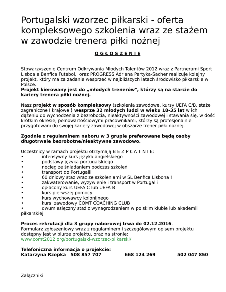 Portugalski wzorzec piłkarski - oferta kompleksowego szkolenia wraz ze stażem w zawodzie trenera piłki nożnej OGŁOSZENIE Stowarzyszenie Centrum Odkrywania Młodych Talentów 2012 wraz z Partnerami Sport Lisboa e Benfica Futebol, oraz PROGRESS Adriana Partyka-Sacher realizuje kolejny projekt, który ma za zadanie wesprzeć w najbliższych latach środowisko piłkarskie w Polsce. Projekt kierowany jest do „młodych trenerów", którzy są na starcie do kariery trenera piłki nożnej. Nasz projekt w sposób kompleksowy (szkolenia zawodowe, kursy UEFA C/B, staże zagraniczne I krajowe ) wesprze 32 młodych ludzi w wieku 18-35 lat w ich dążeniu do wychodzenia z bezrobocia, nieaktywności zawodowej i stawania się, w dość krótkim okresie, pełnowartościowymi pracownikami, którzy są profesjonalnie przygotowani do swojej kariery zawodowej w obszarze trener piłki nożnej. Zgodnie z regulaminem naboru w 3 grupie preferowane będą osoby długotrwale bezrobotne/nieaktywne zawodowo. Uczestnicy w ramach projektu otrzymają B E Z P Ł A T N I E: • intensywny kurs języka angielskiego • podstawy języka portugalskiego • nocleg ze śniadaniem podczas szkoleń • transport do Portugalii • 60 dniowy staż wraz ze szkoleniami w SL Benfica Lisbona ! • zakwaterowanie, wyżywienie i transport w Portugalii • opłacony kurs UEFA C lub UEFA B • kurs pierwszej pomocy • kurs wychowawcy kolonijnego • kurs zawodowy COMT COACHING CLUB • dwumiesięczny staż z wynagrodzeniem w polskim klubie lub akademii piłkarskiej Proces rekrutacji dla 3 grupy naborowej trwa do 02.12.2016. Formularz zgłoszeniowy wraz z regulaminem i szczegółowym opisem projektu dostępny jest w biurze projektu, oraz na stronie: www.comt2012.org/portugalski-wzorzec-pilkarski/ Telefoniczna informacja o projekcie: Katarzyna Rzepka 508 857 707 Załączniki 668 124 269 502 047 850 formularz-zgłoszeniowy-3-turaregulamin-3-tura-