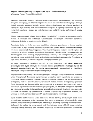 Reguła samoorganizacji jako początek życia i źródło ewolucji Władysław Polcyn, Wydział Biologii UAM Fieodosij Dobżanskij, jeden z twórców współczesnej wersji ewolucjonizmu, jest autorem aforyzmu mówiącego, że "Nic w biologii nie ma sensu bez kontekstu ewolucyjnego". Istnieje jednak centralny problem biologii, wobec którego darwinowski paradygmat ewolucyjny wydaje się być bezsilny. Jest nim niepewność związana z zagadką wyłonienia się życia z materii nieożywionej i łączące się z nią kontrowersje wokół kryteriów definiujących układy ożywione. Można zatem odwrócić zdanie Dobżanskiego i powiedzieć, że trudno w sensowny sposób mówić o ewolucji nie definiując wyczerpująco koniecznych atrybutów systemów biologicznych, które są przedmiotem jej działań. Powstanie życia nie było zapewne zjawiskiem skokowo powstałym z chaosu cząstek organicznych, a jego atrybuty wyłaniały się stopniowo, jednak zasada doboru naturalnego nie może obejmować etapu biogenezy. O ewolucji biologicznej możemy mówić dopiero od momentu, w którym pojawiła się zdolność do replikacji i dziedziczenia. Z tego powodu, wg Karla Poppera, teoria ewolucji, aby być koncepcją naukową, a nie zasadą metafizyczną, musi ograniczyć swoje ambicje jedynie do wyjaśniania przechodzenia gotowych już form życia w jego formy pokrewne, a nie może wyjaśnić samego powstania życia. W mojej wypowiedzi chciałbym pokazać, że etap biogenezy, czyli okres powstania pierwszych form życia zdolnych do ewolucji, można przedstawić odwołując się nie do kategorii adaptacyjnych ale do reguły samoorganizacji, występującej w zjawiskach fizycznych, a więc także w okresie przedbiologicznym. Skąd pochodzi funkcjonalny i strukturalny porządek cechujący każdy obserwowany przez nas układ biologiczny? Tworzenie dynamicznego porządku, czyli wyłanianie się procesów odpornych na oddziaływanie pewnego zakresu czynników losowych, nie jest jedynie cechą biologiczną. Jest ona zakodowana w pierwotnych wobec poziomu biologicznego prawach fizyki. Odwołując się do przykładów samoorganizacji w systemach nieorganicznych można dostarczyć argumentów dla niezwykle sugestywnej idei, że porządek biologiczny wywodzi się z jedności procesów życiowych i praw przyrody nieożywionej. Co więcej, zobaczymy, że porządek ten wyłania się spontanicznie, a zatem, przynajmniej na poziomie komórki, nie wymaga żadnych „centrów decyzyjnych”, a jedynie sprzężenia zwrotnego. Życie możemy definiować na wiele sposobów. Wśród definicji oferowanych przez nauki przyrodnicze spotykamy próby tworzenia listy cech o unikalnych właściwościach, które pozwolą wyrysować linię demarkacyjną oddzielającą przyrodę ożywioną od nieożywionej. Usiłowania te wydają się kontynuować myśl Arystotelesa, który zakładał fundamentalną, nieciągłą różnicę pomiędzy tymi światami, przypisując organizmom posiadanie pierwiastka 1 życia, czyli "duszy wegetatywnej", związanej z odżywianiem, wzrostem i rozmnażaniem. Współczesne próby określania bardziej szczegółowych przymiotów tej duszy, których nie posiadają byty nieożywione, nie przynoszą jednak ustaleń rozstrzygających, gdyż nowe odkrycia stawiają nam przykłady kłopotliwych przypadków granicznych, takich jak np. ostatnio - wirusy olbrzymie. Możliwe są jednak podejścia holistyczne, próbujące integrować opis funkcjonowania organizmów z ustaleniami nauk o nieożywionych systemach termodynamicznych, cybernetycznych i przekazu informacji. Intencją tych interpretacji nie jest chęć katalogowania bytów na ożywione i nieożywione ale zdecydowanie bardziej obiecujące poznawczo wskazanie źródeł funkcjonalności i tożsamości organizmów. Aby cofnąć się wyobraźnią do okresu biogenezy możemy się odwołać do koncepcji termodynamicznych opisujących fizyczne i chemiczne układy nierównowagowe, utworzonych w latach 60-tych przez noblistę Ilya Prigogine’a. Sformułował on zaskakujące, nieintuicyjne prawa, dotyczące ewolucji zbiorów cząstek, lub sekwencji reakcji chemicznych, które znajdują się w stanie dalekim od równowagi. Otóż, gdy układy takie są izolowane od wpływów zewnętrznych to, zgodnie z II zasadą termodynamiki, powinniśmy oczekiwać wzrostu nieuporządkowania ich elementów składowych, czyli maksymalizacji entropii. Jednakże Prigogine wykazał, że w układach otwartych podczas rozpraszania energii (czyli jej dyssypacji), zamiast chaosu, tworzą się antyentropijne bariery w postaci tymczasowych uporządkowań, które nazwał strukturami dyssypatywnymi, gdyż wykazują one cechę wzmacniającą to rozpraszanie. Prigogine pokazał zatem, że chaotyczne zespoły molekuł mogą w sposób spontaniczny przejawiać cechę samoorganizacji, która jest lokalnie sprzeczna z zasadą wzrostu entropii. Spójrzmy na przykłady samoorganizacji w układach fizycznych i chemicznych, które moglibyśmy traktować jak przedbiologiczne pierwowzory wymiany informacji pomiędzy molekułami i procesami w układach biologicznych. Pierwszy przykład nie pokazuje struktur dyssypatywnych ale wprowadza bardzo ważny dla naszego przekazu związek pomiędzy destabilizacją a spontaniczną zmianą uporządkowania. Formowanie się kropli ferrofluidu w regularne wzory następuje w wyniku destabilizacji drobin płynu o właściwościach paramagnetycznych, spowodowanej zmianą natężenia pola magnetycznego. Orbitale π chmur elektronowych ferrofluidu funkcjonują jako dipole magnetyczne i przyciągają się słabymi oddziaływaniami van der Waalsa. Siły te przywołamy za chwilę, jako podstawowy mechanizm samoorganizacji struktur Powstawanie struktur statycznych według zasady minimalnej produkcji entropii (https://www.youtube.com/watch?v=ehvFFbFFsjg) 2 komórkowych, na przykładzie fałdowania się struktury białek. W tym modelu kolejne wzory kropli odpowiadają najniższej energii u