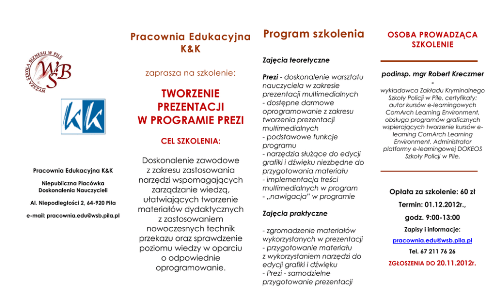 Pracownia Edukacyjna K&K Program szkolenia OSOBA PROWADZĄCA SZKOLENIE Zajęcia teoretyczne zaprasza na szkolenie: TWORZENIE PREZENTACJI W PROGRAMIE PREZI CEL SZKOLENIA: Pracownia Edukacyjna K&K Niepubliczna Placówka Doskonalenia Nauczycieli Al. Niepodległości 2, 64-920 Piła e-mail: [email protected] Doskonalenie zawodowe z zakresu zastosowania narzędzi wspomagających zarządzanie wiedzą, ułatwiających tworzenie materiałów dydaktycznych z zastosowaniem nowoczesnych technik przekazu oraz sprawdzenie poziomu wiedzy w oparciu o odpowiednie oprogramowanie. Prezi - doskonalenie warsztatu nauczyciela w zakresie prezentacji multimedialnych - dostępne darmowe oprogramowanie z zakresu tworzenia prezentacji multimedialnych - podstawowe funkcje programu - narzędzia służące do edycji grafiki i dźwięku niezbędne do przygotowania materiału - implementacja treści multimedialnych w program - „nawigacja” w programie Zajęcia praktyczne - zgromadzenie materiałów wykorzystanych w prezentacji - przygotowanie materiału z wykorzystaniem narzędzi do edycji grafiki i dźwięku - Prezi - samodzielne przygotowanie prezentacji podinsp. mgr Robert Kreczmer wykładowca Zakładu Kryminalnego Szkoły Policji w Pile, certyfikaty: autor kursów e-learningowych ComArch Learning Environment, obsługa programów graficznych wspierających tworzenie kursów elearning ComArch Learning Environment. Administrator platformy e-learningowej DOKEOS Szkoły Policji w Pile. Opłata za szkolenie: 60 zł Termin: 01.12.2012r., godz. 9:00-13:00 Zapisy i informacje: [email protected] Tel. 67 211 76 26 ZGŁOSZENIA DO 20.11.2012r.