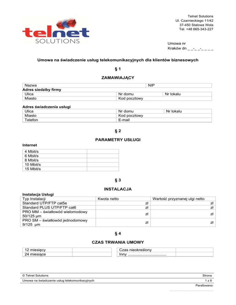 Telnet Solutions Ul. Czarnieckiego 11/42 37-450 Stalowa Wola Tel. +48 665-343-227 Umowa nr Kraków dn _ _-_ _-_ _ _ _ Umowa na świadczenie usług telekomunikacyjnych dla klientów biznesowych §1 ZAMAWIAJĄCY Nazwa Adres siedziby firmy Ulica Miasto NIP Nr domu Kod pocztowy Nr lokalu Adres świadczenia usługi Ulica Miasto Telefon Nr domu Kod pocztowy E-mail Nr lokalu §2 PARAMETRY USŁUGI Internet 4 Mbit/s 6 Mbit/s 8 Mbit/s 10 Mbit/s 15 Mbit/s §3 INSTALACJA Instalacja Usługi Typ Instalacji Standard UTP/FTP cat5e Standard PLUS UTP/FTP cat6 PRO MM – światłowód wielomodowy 50/125 μm PRO SM – światłowód jednodomowy 9/125 μm Kwota netto Wartość przyznanej ulgi netto zł zł zł zł zł zł zł zł §4 CZAS TRWANIA UMOWY 12 miesięcy 24 miesiące © Telnet Solutions Umowa na świadczenie usług telekomunikacyjnych Czas nieokreślony Inny ................................... Strona 1z6 Parafowano: ................................... ............................................ §5 ABONAMENT Nazwa usługi Broadband Internet Kwota netto Wartość przyznanej ulgi netto zł zł zł zł §6 USŁUGI DODATKOWE Dzielenie sygnału w obrębie lokalu za pośrednictwem routera Zewnętrzny adres IP Przekierowanie portów TCP/UDP na komputer Klienta Wykonanie instalacji wewnętrznej w lokalu Klienta §7 PODSUMOWANIE Nazwa usługi Instalacja Aktywacja Abonament Typ opłaty Jednorazowa Jednorazowa Miesięczna Kwota netto Wartość ulgi netto zł zł zł zł zł zł / m-c Typ zapłaty Gotówka □ Przelew □ Gotówka □ Przelew □ Gotówka □ Przelew □ §8 POSTANOWIENIA OGÓLNE Umowa zawarta w dniu __-__-____ pomiędzy: Dostawcą usług: Firmą Telnet Solutions, z siedzibą w Stalowej Woli, ul. Czarnieckiego 11/42 nr NIP 865-242-18-26 oraz Abonentem: dane podmiotu, w tym dane adresowe oznaczone w pozycji Zamawiający §1. §9 OBOWIĄZYWANIE I ROZWIĄZANIE UMOWY 1. Umowa abonencka zawarta jest na czas nieokreślony / określony do dnia …………………………1. 2. W przypadku jednostronnego rozwiązania Umowy Abonenckiej, zawartej na czas określony przez Abonenta lub przez Dostawcę usług z winy Abonenta przed upływem okresu obowiązywania Umowy zawartej na czas określony abonent będzie zobowiązany do zapłaty kwoty w wysokości ulgi przyznanej Abonentowi w związku z zawarciem Umowy na czas określony. 3. Ulga abonamentowa jest przyznawana Abonentom podpisującym umowę na czas określony, jako różnica ceny usługi, w stosunku do ceny usługi z umową na czas nieokreślony. Przykład 1: cena usługi z umową na czas nieokreślony wynosi 70 zł /m-c , cena usługi z umową na czas określony wynosi 50 zł /m-c, ulga przyznana abonentowi który podpisał umowę na czas określony 20 zł /m-c. © Telnet Solutions Umowa na świadczenie usług telekomunikacyjnych Strona 2z6 Parafowano: ................................... ............................................ 4. Wartość ulgi przyznanej Abonentowi, który zawarł Umowę Abonencką na czas określony stanowi iloczyn miesięcy, na który została zawarta Umowa Abonencka na czas określony oraz różnicy pomiędzy ceną Usługi w przypadku zawarcia Umowy Abonenckiej na czas określony, a kwotą, którą Abonent zobowiązany byłby uiścić, gdyby korzystał z Usługi na podstawie Umowy zawartej na czas nieokreślony. Przykład 2: Pan Jan wykupił usługę na czas określony: 12 miesięcy za kwotę 50 zł brutto miesięcznie. Ta sama usługa przy umowie na czas nieokreślony kosztuje 70 zł brutto. Pan Jan po 8 miesiącach rozwiązuje umowę na czas określony. Pan Jan jest zobowiązany do zwrotu ulgi przyznanej przez operatora w wysokości 8 miesięcy razy 20 zł ulgi przyznanej za miesiąc. Pan Jan jest zobowiązany do zwrotu ulgi w wysokości 160 zł brutto. 5. Telnet Solutions przysługuje prawo do rozwiązania umowy bez wypowiedzenia w przypadku stwierdzenia: a) Abonent świadomie działa na szkodę Usługodawcy lub innych Abonentów znajdujących się w sieci Telnet Solutions, b) Abonent udostępnia łącze osobom trzecim po za obrębem lokalu, w którym zostało wykonane podłączenie, c) Brak opłaty abonamentowej za okres dwóch miesięcy, d) Abonent nagminnie przekracza terminy wpłat abonamentowych. 6. Wszelkie spory wynikające z realizacji niniejszej umowy będą rozstrzygane przez Sąd właściwy dla siedziby Telnet Solutions. 7. Abonent ma prawo do wypowiedzenia umowy na czas nieokreślony z terminem wypowiedzenia równym 1 miesiąc na koniec okresu rozliczeniowego. W przypadku umowy na czas określony zastosowanie ma punkt 2 niniejszego paragrafu. 8. Umowa na czas określony po okresie obowiązywania automatycznie przechodzi w umowę na czas nieokreślony z jednomiesięcznym okresem wypowiedzenia, ze skutkiem na koniec okresu rozliczeniowego chyba, że którakolwiek ze Stron umowy na jeden miesiąc przed końcem aktualnie obowiązującego okresu jej trwania, złoży drugiej Stronie oświadczenie o braku woli dalszego kontynuowania umowy. § 10 CENY I WARUNKI PŁATNOŚCI 1. Abonent zapłaci Telnet Solutions jednorazową opłatę instalacyjną w wysokości określonej w §3 niniejszej umowy w momencie odbioru instalacji. Usługa zostaje aktywowana po uiszczeniu opłaty instalacyjnej. 2. Miesięczne opłaty z tytułu świadczonych usług są określone w §5 niniejszej umowy. © Telnet Solutions Umowa na świadczenie usług telekomunikacyjnych Strona 3z6 Parafowano: ................................... ............................................ 3. Abonent jest zobowiązany do regularnego uiszczania opłat abonamentowych za każdy miesiąc w terminie wyznaczonym na fakturze. 4. Brak zapłaty w terminie podanym na fakturze jest podstawą do naliczenia odsetek ustawowych za każdy dzień opóźnienia, poczynając od następnego dnia po upływie pierwotnego terminu płatności wyznaczonego na fakturze. 5. Brak zapłaty w dodatkowym terminie 7 dni, liczonym od dnia następnego po upływie pierwotnego terminu płatnoś