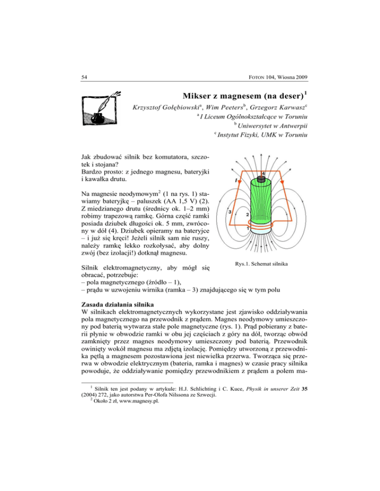 54 FOTON 104, Wiosna 2009 Mikser z magnesem (na deser) 1 Krzysztof Gołębiowskia, Wim Peetersb, Grzegorz Karwaszc a I Liceum Ogólnokształcące w Toruniu b Uniwersytet w Antwerpii c Instytut Fizyki, UMK w Toruniu Jak zbudować silnik bez komutatora, szczotek i stojana? Bardzo prosto: z jednego magnesu, bateryjki i kawałka drutu. Na magnesie neodymowym2 (1 na rys. 1) stawiamy bateryjkę – paluszek (AA 1,5 V) (2). Z miedzianego drutu (średnicy ok. 1–2 mm) robimy trapezową ramkę. Górna część ramki posiada dziubek długości ok. 5 mm, zwrócony w dół (4). Dziubek opieramy na bateryjce – i już się kręci! Jeżeli silnik sam nie ruszy, należy ramkę lekko rozkołysać, aby dolny zwój (bez izolacji!) dotknął magnesu. Rys.1. Schemat silnika Silnik elektromagnetyczny, aby mógł się obracać, potrzebuje: – pola magnetycznego (źródło – 1), – prądu w uzwojeniu wirnika (ramka – 3) znajdującego się w tym polu Zasada działania silnika W silnikach elektromagnetycznych wykorzystane jest zjawisko oddziaływania pola magnetycznego na przewodnik z prądem. Magnes neodymowy umieszczony pod baterią wytwarza stałe pole magnetyczne (rys. 1). Prąd pobierany z baterii płynie w obwodzie ramki w obu jej częściach z góry na dół, tworząc obwód zamknięty przez magnes neodymowy umieszczony pod baterią. Przewodnik owinięty wokół magnesu ma zdjętą izolację. Pomiędzy utworzoną z przewodnika pętlą a magnesem pozostawiona jest niewielka przerwa. Tworząca się przerwa w obwodzie elektrycznym (bateria, ramka i magnes) w czasie pracy silnika powoduje, że oddziaływanie pomiędzy przewodnikiem z prądem a polem ma1 Silnik ten jest podany w artykule: H.J. Schlichting i C. Kuce, Physik in unserer Zeit 35 (2004) 272, jako autorstwa Per-Olofa Nilssona ze Szwecji. 2 Około 2 zł, www.magnesy.pl. FOTON 104, Wiosna 2009 55 gnetycznym pochodzącym od magnesu, następuje co pewien odstęp czasu. Przerwy są na tyle małe, że obracająca się ramka nie zatrzymuje się. Górna część ramki znajduje się w strumieniu pola magnetycznego o większej gęstości niż jej dolna część 3 . W konsekwencji tego, tworzące się momenty pary sił w górnej części ramki są większe niż w jej dolnej części (rys. 2). Wypadkowy moment sił powoduje, że ramka się obraca. Silnik, raz uruchomiony, wiruje jak ubijaczka do śmietany, dopóki nie spadnie (zob. krótki film w Internecie [1]). Jak zmienić kierunek obrotu? Należy odwrócić baterię (albo magnes). Rys. 2. Oddziaływanie ramki z prądem w polu magnetycznym. B – wektor indukcji pola magnetycznego, I – prąd elektryczny, F – wektor siły [1] „Two-loop motor”, MOSEM Project, Low-tech kit, http://dydaktyka.fizyka.umk.pl/ foton/silnik.wmv [2] „Znikopis magnetyczny” http://dydaktyka.fizyka.umk.pl/zabawki/files/elmag/znikopis.html [w:] „Fizyka i zabawki”, praca zbiorowa pod red. G. Karwasza, PAP Słupsk (2005) Pokazane silniki są częścią zestawów dydaktycznych opracowanych w programie LdV EU „MOSEM” (Minds-on Experiments on Superconductivity and Electromagnetism) koordynowanym przez UMK. P.S. Jeszcze prostszy, niewymagający specjalnej ramki z drutu, jest silnik pokazany na zdjęciu 4 . Ostry gwóźdź działa jak łożysko, a pętla jest tylko jedna, 3 Dolna krawędź ramki znajduje się w połowie wysokości magnesu, pomiędzy dwoma biegunami i praktycznie nie przecina linii pola magnetycznego. Umiejscowienie biegunów magnesu łatwo stwierdzić za pomocą magnetycznej tabliczki do rysowania [2]. Na powierzchni bocznej magnesu w połowie jego wysokości natężenie pola magnetycznego jest zerowe. 4 Dokładny opis budowy tego silnika zamieściliśmy w Fotonie 98 („Kącik doświadczalny. Prosty silnik... i nie tylko!”, Grzegorz Brzezinka). 56 FOTON 104, Wiosna 2009 w odróżnieniu od dwóch symetrycznych w poprzednim silniku. W tym silniku pętlę trzymamy ręką, więc jak to wynika z zasady akcji i reakcji, kręci się magnes. Silnik kręci się najszybciej, gdy dolny koniec drutu dotyka magnesu w połowie tak, aby pętla obejmowała tylko jeden biegun magnesu. Silnik zatrzymuje się, gdy dotykamy magnesu z dołu: pętla obejmuje obydwa bieguny i wypadkowy strumień pola magnetycznego jest zerowy. Fot. 1. Silnik elektromagnetyczny z jedną pętlą: bateryjka, gwóźdź, magnes i drut. Dla zapewnienia najszybszych obrotów, drut powinien dotykać magnesu w połowie wysokości Od Redakcji: Na fotografii poniżej znajduje się silnik wykonany w Redakcji (WZ) według opisu zamieszczonego w artykule.