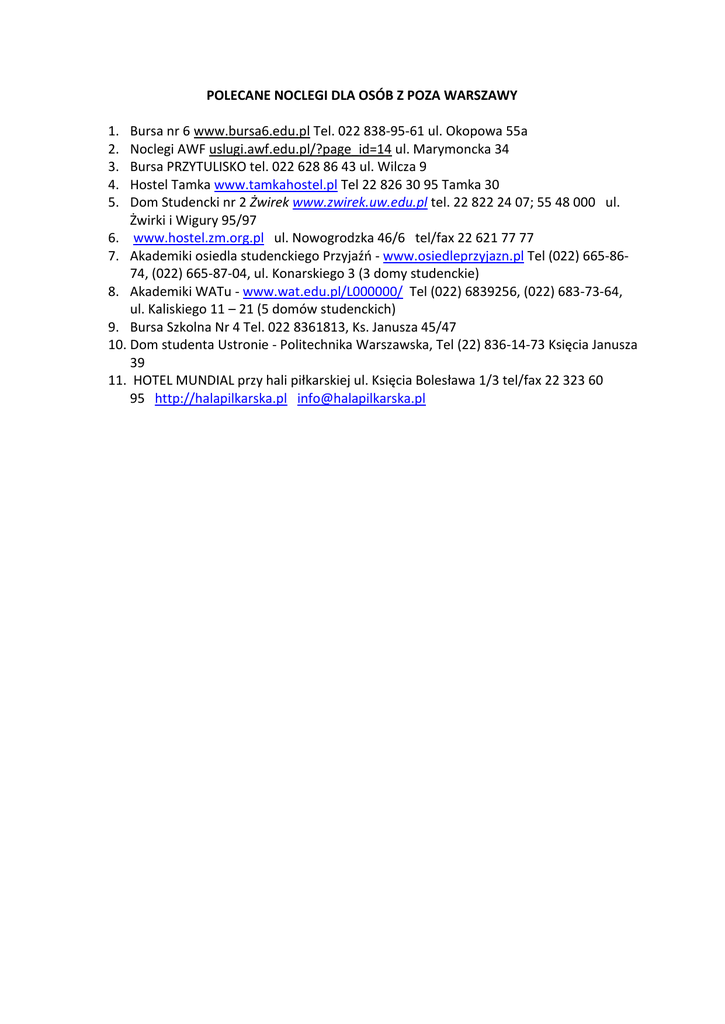 POLECANE NOCLEGI DLA OSÓB Z POZA WARSZAWY 1. 2. 3. 4. 5. Bursa nr 6 www.bursa6.edu.pl Tel. 022 838-95-61 ul. Okopowa 55a Noclegi AWF uslugi.awf.edu.pl/?page_id=14 ul. Marymoncka 34 Bursa PRZYTULISKO tel. 022 628 86 43 ul. Wilcza 9 Hostel Tamka www.tamkahostel.pl Tel 22 826 30 95 Tamka 30 Dom Studencki nr 2 Żwirek www.zwirek.uw.edu.pl tel. 22 822 24 07; 55 48 000 ul. Żwirki i Wigury 95/97 6. www.hostel.zm.org.pl ul. Nowogrodzka 46/6 tel/fax 22 621 77 77 7. Akademiki osiedla studenckiego Przyjaźń - www.osiedleprzyjazn.pl Tel (022) 665-8674, (022) 665-87-04, ul. Konarskiego 3 (3 domy studenckie) 8. Akademiki WATu - www.wat.edu.pl/L000000/ Tel (022) 6839256, (022) 683-73-64, ul. Kaliskiego 11 – 21 (5 domów studenckich) 9. Bursa Szkolna Nr 4 Tel. 022 8361813, Ks. Janusza 45/47 10. Dom studenta Ustronie - Politechnika Warszawska, Tel (22) 836-14-73 Księcia Janusza 39 11. HOTEL MUNDIAL przy hali piłkarskiej ul. Księcia Bolesława 1/3 tel/fax 22 323 60 95 http://halapilkarska.pl [email protected]