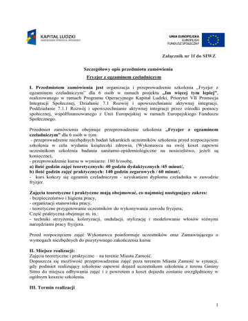 Załącznik nr 1f do SIWZ Szczegółowy opis przedmiotu zamówienia Fryzjer z egzaminem czeladniczym I. Przedmiotem zamówienia jest organizacja i przeprowadzenie szkolenia „Fryzjer z egzaminem czeladniczym” dla 6 osób w ramach projektu „Im więcej tym lepiej”, realizowanego w ramach Programu Operacyjnego Kapitał Ludzki, Priorytet VII Promocja Integracji Społecznej, Działanie 7.1 Rozwój i upowszechnianie aktywnej integracji, Poddziałanie 7.1.1 Rozwój i upowszechnianie aktywnej integracji przez ośrodki pomocy społecznej, współfinansowanego z Unii Europejskiej w ramach Europejskiego Funduszu Społecznego. Przedmiot zamówienia obejmuje przeprowadzenie szkolenia „Fryzjer z egzaminem czeladniczym” dla 6 osób w tym: - przeprowadzenie niezbędnych badań lekarskich uczestników szkolenia przed rozpoczęciem szkolenia w celu wydania książeczki zdrowia, (Wykonawca na swój koszt zapewni uczestnikom szkolenia badania sanitarno-epidemiologiczne na nosicielstwo, jeżeli są konieczne), - przeprowadzenie kursu w wymiarze: 180 h/osobę, a) ilość godzin zajęć teoretycznych: 40 godzin dydaktycznych /45 minut/, b) ilość godzin zajęć praktycznych: 140 godzin zegarowych / 60 minut/, - kurs kończy się egzamin czeladniczym - uzyskaniem dyplomu czeladnika w zawodzie fryzjer. Zajęcia teoretyczne i praktyczne mają obejmować, co najmniej następujący zakres: - bezpieczeństwo i higiena pracy, - organizacji stanowiska pracy, - teoretyczne przygotowanie uczestników do wykonywania zawodu fryzjera; Część praktyczna obejmuje m. in.: - techniki strzyżenia, koloryzacji, ondulacji, stylizację i modelowanie włosów różnymi narzędziami pracy fryzjera. Przed rozpoczęciem zajęć Wykonawca poinformuje uczestników oraz Zamawiającego o wymogach niezbędnych do pozytywnego zakończenia kursu II. Miejsce realizacji: Zajęcia teoretyczne i praktyczne – na terenie Miasta Zamość. Dopuszcza się możliwość przeprowadzenia zajęć poza terenem Miasta Zamość w sytuacji, gdy podmiot realizujący szkolenie zapewni dojazd uczestnikom szkolenia z terenu Gminy Sitno do miejsca odbywania zajęć i z powrotem a koszt dojazdu zostanie uwzględniony w ogólnym koszcie szkolenia. III. Termin realizacji 1 Od dnia podpisania umowy do 30 listopada 2012 r. Zajęcia będą odbywać się między godz. 08:00 a 18:00, od poniedziałku do piątku /z wyłączeniem sobót, niedziel i świąt/, co najmniej 2x w tygodniu. IV. Wykonawca zobowiązany jest zapewnić: 1) odpowiednie warunki lokalowe do przeprowadzenia szkolenia, sprzęt oraz wszystkie konieczne i zalecane materiały szkoleniowe takie jak: - Podręczniki/Skrypty - Odzież na zajęcia praktyczne, - Każdy uczestnik kursu zostanie wyposażony w następujące narzędzia fryzjerskie: nożyce i maszynki do strzyżenia, które przechodzą na własność uczestnika kursu. - Inne materiały (teczki, zeszyty, długopisy, itp.), które po zakończeniu kursu przejdą na własność absolwentów ww. szkolenia a nadto jeden dodatkowy egzemplarz opracowanych materiałów dydaktycznych przeznaczonych dla Zamawiającego. 2) zajęcia będą prowadzone przez wykładowców posiadających zasób wiedzy, doświadczenie zawodowe i przygotowanie dydaktyczne zapewniające właściwą realizację szkolenia. V. Wykonawca zobowiązany jest także do: 1. Zapewnienia w każdym dniu szkolenia teoretycznego uczestnikom kursu: - serwisu kawowego. Serwis kawowy ma obejmować min.: kawę, herbatę i dodatki (cukier, śmietanka, cytryna), napoje, ciastka, paluszki. Serwis kawowy ma być stale dostępny w godzinach realizacji kursu; - obiady. Każdy obiad składać się ma przynajmniej z: zupy (ok. 350 ml/os.) oraz dania głównego: ziemniaki/ryż/kasza (zamiennie) ok. 200 gram/os., sztuka mięsa (ok. 150 gram/os.), warzywa gotowane/surówka (zamiennie). Podane gramatury są już po obróbce termicznej. Wszystkie składniki obiadów podane w poszczególnych dniach kursu powinny być różne. Obiad dla każdego uczestnika powinien być podawany na ciepło. Potwierdzenia odbioru posiłku oraz korzystania z serwisu kawowego przez każdego uczestnika w poszczególnych dniach szkolenia, Wykonawca przekaże Zamawiającemu wraz z dokumentacją szkolenia. Poinformowania uczestników przed rozpoczęciem zajęć o zagrożeniach występujących w miejscu przeprowadzania szkolenia. 2. Ubezpieczenia uczestników zajęć od następstw nieszczęśliwych wypadków w związku z uczestnictwem w szkoleniu oraz w drodze do i z miejsca szkolenia. 3. Przestrzegania przepisów o ochronie danych osobowych, zgodnie z ustawą z dnia 29 sierpnia 1997 r. o ochronie danych osobowych (Dz. U. z 2002 r. Nr 101, poz. 926 z późn. zm.) podczas wykonywania przedmiotu umowy. 4. Wydania uczestnikowi zaświadczenia o ukończeniu szkolenia zgodnie z rozporządzeniem MEN z dnia 3 lutego 2006 r. w sprawie uzyskiwania i uzupełniania przez osoby dorosłe wiedzy ogólnej, umiejętności i kwalifikacji zawodowych w formach pozaszkolnych (Dz. U. z 2006 r. Nr 31, poz. 216). 5. Przekazania Zamawiającemu w terminie 14 dni od zakończenia kursu: 2 - list obecności, - dziennika zajęć, - list potwierdzających odbiór materiałów szkoleniowych przez uczestników zajęć, -list potwierdzających otrzymanie posiłku i korzystania z serwisu kawowego z podaniem daty odbioru i czytelnym podpisem uczestnika, - imiennego wykazu uczestników, którzy ukończyli kurs, 6. Przekazania potwierdzonej kserokopii innych dokumentów związanych z realizacją usługi, o które zwróci się Zamawiający. 7. Oznakowania pomieszczeń, w których będą odbywały się zajęcia oraz dokumentacji wytworzonej w ramach realizacji niniejszego zamówienia, tj. materiałów dydaktycznych, programów kursów, list obecności, dziennika zajęć itp. poprzez umieszczenie informacji o współfinansowaniu kursu ze środków Unii Europejskiej w ramach Europejskiego Funduszu Społecznego, logotypów PO KL, EFS, UE, zgodnie z aktualnymi Wytycznymi 