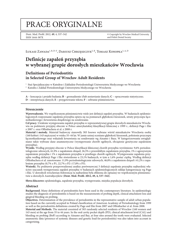 prace oryginalne Dent. Med. Probl. 2012, 49, 4, 537–542 ISSN 1644-387X © Copyright by Wroclaw Medical University and Polish Dental Society Łukasz Zawada1, B, D–F, Dariusz Chrzęszczyk2, B, Tomasz Konopka2, A, D Definicje zapaleń przyzębia w wybranej grupie dorosłych mieszkańców Wrocławia Definitions of Periodontitis in Selected Group of Wrocław Adult Residents Staż Specjalizacyjny w Katedrze i Zakładzie Periodontologii Uniwersytetu Medycznego we Wrocławiu Katedra i Zakład Periodontologii Uniwersytetu Medycznego we Wrocławiu 1 2 A – koncepcja i projekt badania; B – gromadzenie i/lub zestawianie danych; C – opracowanie statystyczne; D – interpretacja danych; E – przygotowanie tekstu; F – zebranie piśmiennictwa Streszczenie Wprowadzenie. We współczesnym piśmiennictwie wiele jest definicji zapaleń przyzębia. W badaniach epidemiologicznych rozpoznanie zapalenia przyzębia opiera się na pomiarach głębokości kieszonek, utraty przyczepu łącznotkankowego i krwawienia dziąsłowego na sondowanie. Cel pracy. Ustalenie występowania zapaleń przyzębia w reprezentatywnej grupie dorosłych mieszkańców Wrocławia na podstawie przyjętej obecnie w Polsce amerykańskiej klasyfikacji klinicznej z 1999 r., definicji Page i Eke z 2007 r. oraz Offenbachera et al. z 2008 r. Materiał i metody. Materiał badawczy stanowiły 303 losowo wybrane wśród mieszkańców Wrocławia osoby (160 kobiet i 143 mężczyzn) w wieku 35–44 lat. W jamie ustnej oceniano głębokość kieszonek, położenie przyczepu łącznotkankowego oraz wskaźnik krwawienia na sondowanie wg Ainamo i Baya. W kategoryzowaniu uwzględniano także wybrane dane anamnestyczne (występowanie chorób ogólnych, obciążenie genetyczne zapaleniem przyzębia). Wyniki. Według przyjętej obecnie w Polsce klasyfikacji klinicznej chorób przyzębia wyróżniono: 9,6% periodontologicznie zdrowych, 61,9% z zapaleniem dziąseł, 26,5% z przewlekłym zapaleniem przyzębia, 1% z agresywnym zapaleniem przyzębia i 1% z zapaleniem przyzębia w przebiegu chorób ogólnych. Występowanie zapalenia przyzębia według definicji Page i Eke stwierdzono u 23,1% badanych, w tym u 1,6% postać ciężką. Według definicji Offenbachera et al. zanotowano: 11,9% periodontologicznie zdrowych, 46,8% z zapaleniem dziąseł i 41,2% z zapaleniem przyzębia (0,7% z P1, 22,7% z P2 i 17,8% z P3). Wnioski. Na podstawie przeprowadzonej analizy porównawczej 3 definicji zapalenia przyzębia najbardziej właściwy szacunek występowania zapaleń przyzębia w badaniach epidemiologicznych oddaje kategoryzacja wg Page i Eke. U dorosłych wrocławian frekwencja ta najbardziej była zbliżona do opisanej we współczesnym piśmiennictwie u dorosłych Australijczyków (Dent. Med. Probl. 2012, 49, 4, 537–542). Słowa kluczowe: epidemiologia, zapalenie przyzębia, występowanie, miejska populacja dorosłych. Abstract Background. Many definitions of periodontitis have been used in the contemporary literature. In epidemiologic studies the diagnosis of periodontitis is based on the measurements of probing depth, clinical attachment loss and gingival bleeding on probing. Objectives. Determination of the prevalence of periodontitis in the representative sample of adult urban population based on the currently accepted in Poland classification of American Academy of Periodontology from 1999 as well as the periodontitis definitions created by Page and Eke from 2007 and Offenbacher et al. from 2008. Material and Methods. The material consisted of 303 randomly selected residents of Wrocław (160 women and 143 men) at the age from 35 to 44 years. In the oral cavity pocket depth (PD), clinical attachment level (CAL) and bleeding on probing (BoP) according to Ainamo and Bay, at four sites around the tooth were evaluated. Selected anamnestic data (presence of systemic diseases and genetic load for periodontitis) was also taken into account in categorizing. 538 Ł. Zawada, D. Chrzęszczyk, T. Konopka Results. According to the currently accepted in Poland clinical classification of periodontal diseases, the following values were obtained: 9.6% of healthy periodontium, 61.9% with gingivitis, 26.5% with chronic periodontitis, 1% with aggressive periodontitis and 1% with periodontitis modified by systemic factors. The occurrence of periododontitis according to classification by Page and Eke was found in 23.1% of people, including 1.6% with a severe form of the disease. Based on the definitions created by Offenbacher et al. the following cases were found: 11.9% of healthy periodontium, 46.8% with gingivitis and 41.3% with periodontitis (0.7% P1, 22.7% P2 and 17.8% P3 respectively). Conclusions. Based on a comparative analysis of the three definitions of periodontitis best estimation of the prevalence of periodontitis in epidemiological studies reflects the definition by Page and Eke. In adult residents of Wrocław this turnout was most similar to that described in the contemporary literature in adult Australians (Dent. Med. Probl. 2012, 49, 4, 537–542). Key words: epidemiology, periodontitis, prevalence, adult urban population. Obecnie zmieniają się i zwiększają wymagania stawiane periodontologicznym badaniom epidemiologicznym. Konieczne jest oszacowanie występowania zapaleń przyzębia i zapaleń okołowszczepowych w populacji ogólnej, identyfikacja osób „wysokiego ryzyka” zapalenia przyzębia, ocena skuteczności działań profilaktycznych i leczniczych na poziomie populacji, ocena interakcji czynników ryzyka z zapaleniem przyzębia, ocena wpływu stanu przyzębia (zdrowie, zapalenie przyzębia) na wybrane choroby ogólne, a także wpływu periodontopatii na jakość życia [1]. W ostatnich 3 narodowych amerykańskich badaniach stanu przyzębia zawsze oznaczano głębokość kieszonek (PD – probing depth) i położenie przyczepu łącznotkankowego (CAL – clinical attachment level). W latach 1985–1986 National Institute for Dental Research (NI